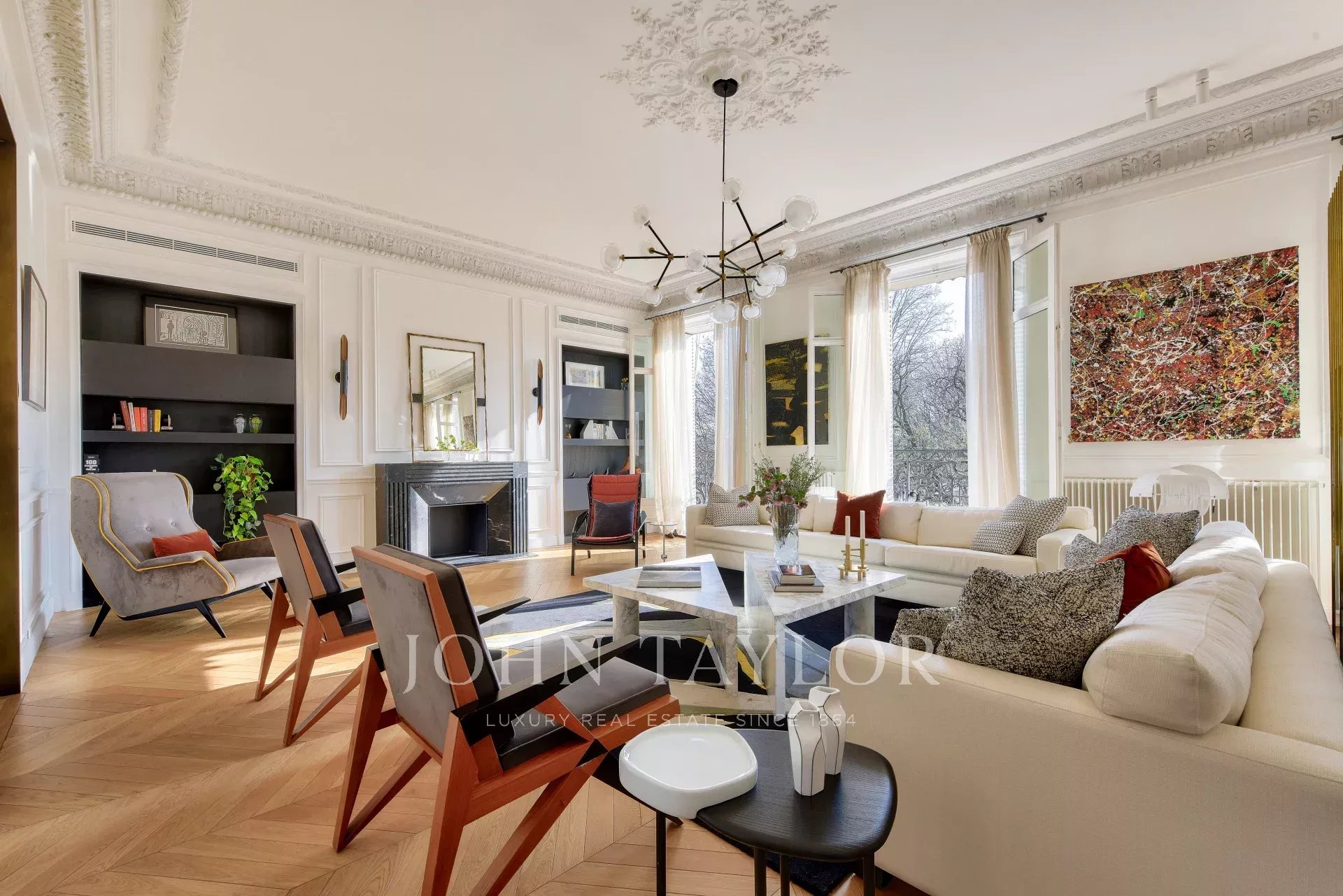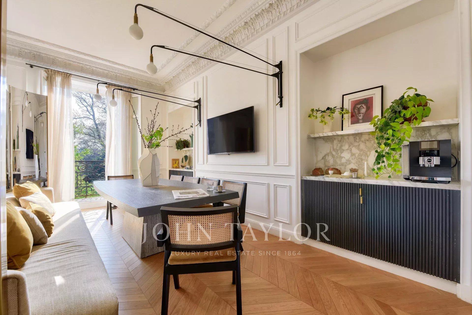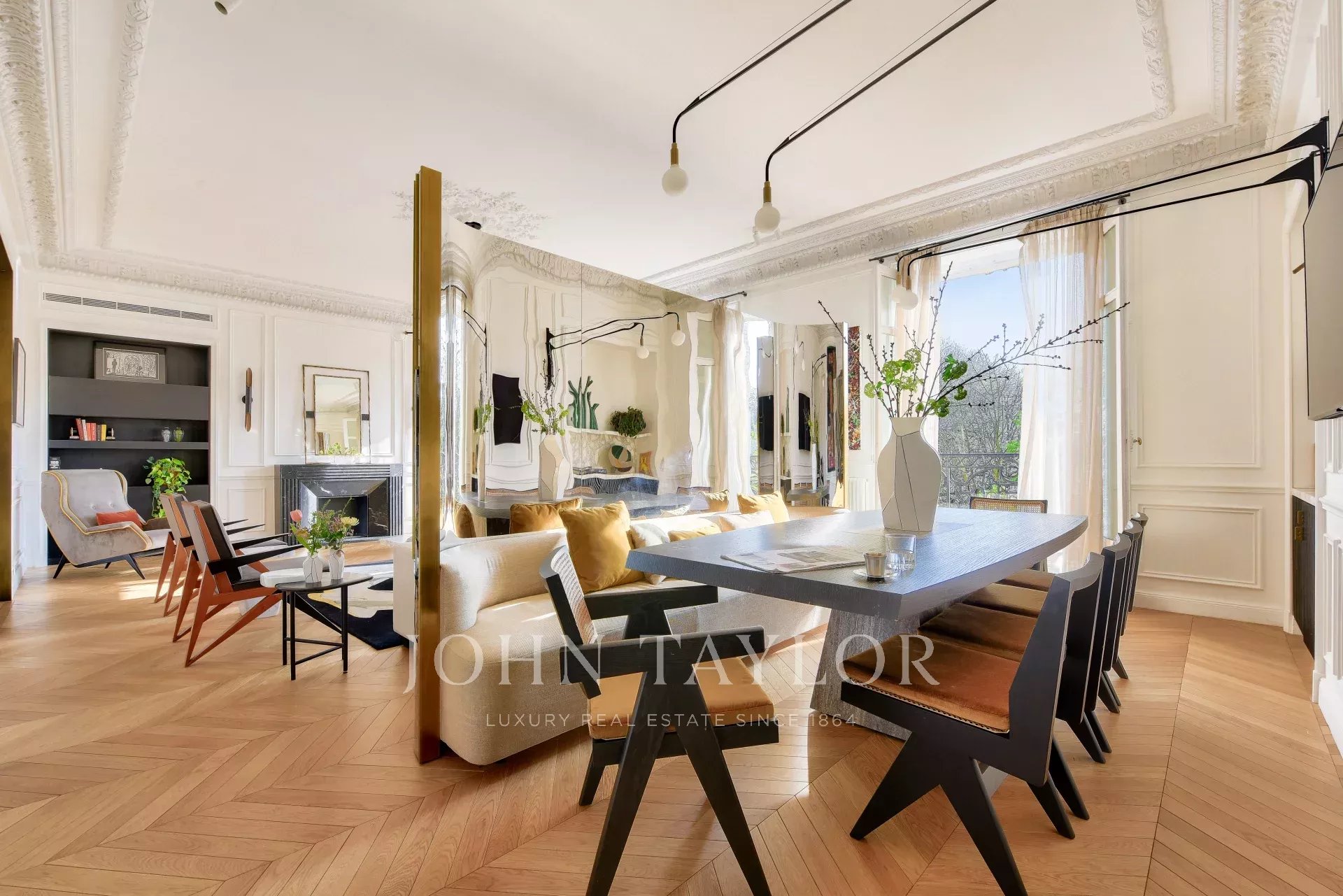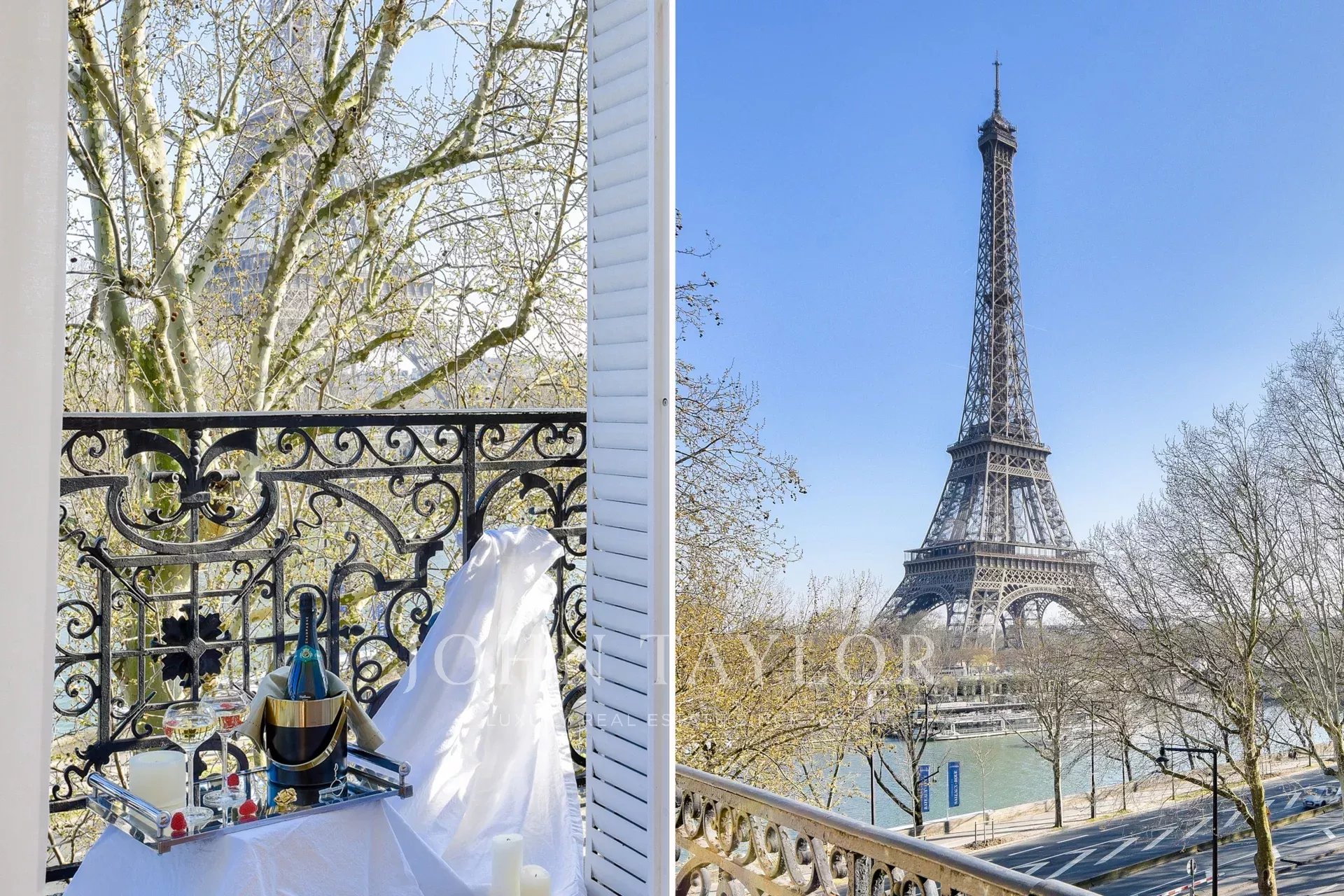 - un vaste séjour - salle à manger donnant sur un balcon filant, avec des vues sur les Jardins du Trocadéro, la Seine et la Tour Eiffel
