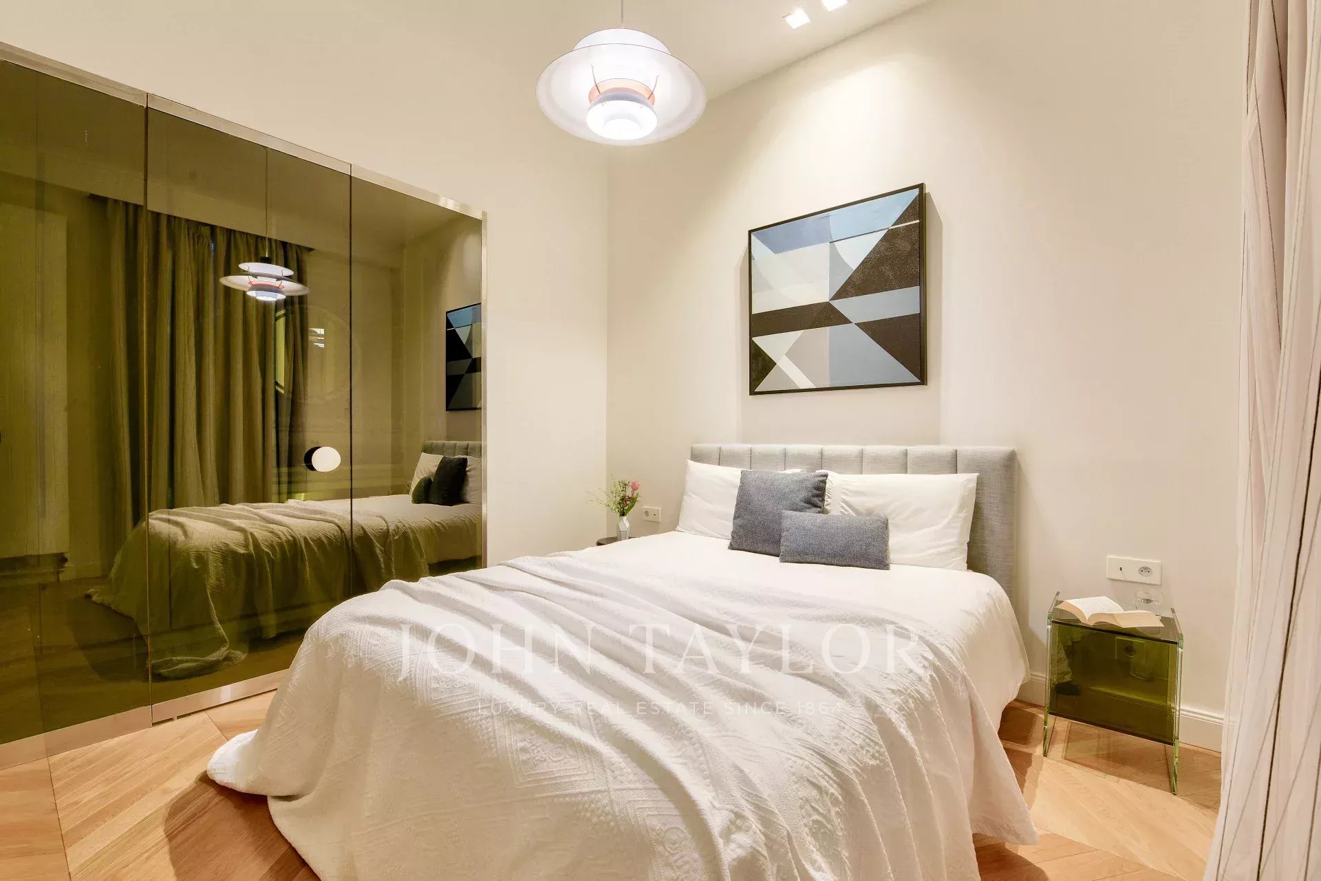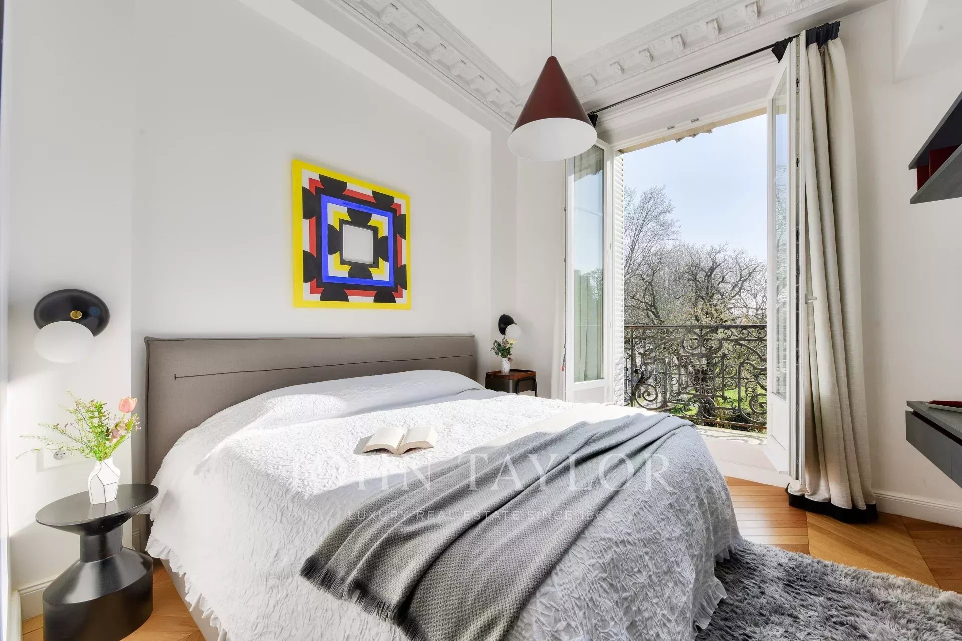 - une spacieuse chambre de maître en angle, avec son dressing, sa salle de bains et offrant des vues directes sur la Tour Eiffel et la Seine