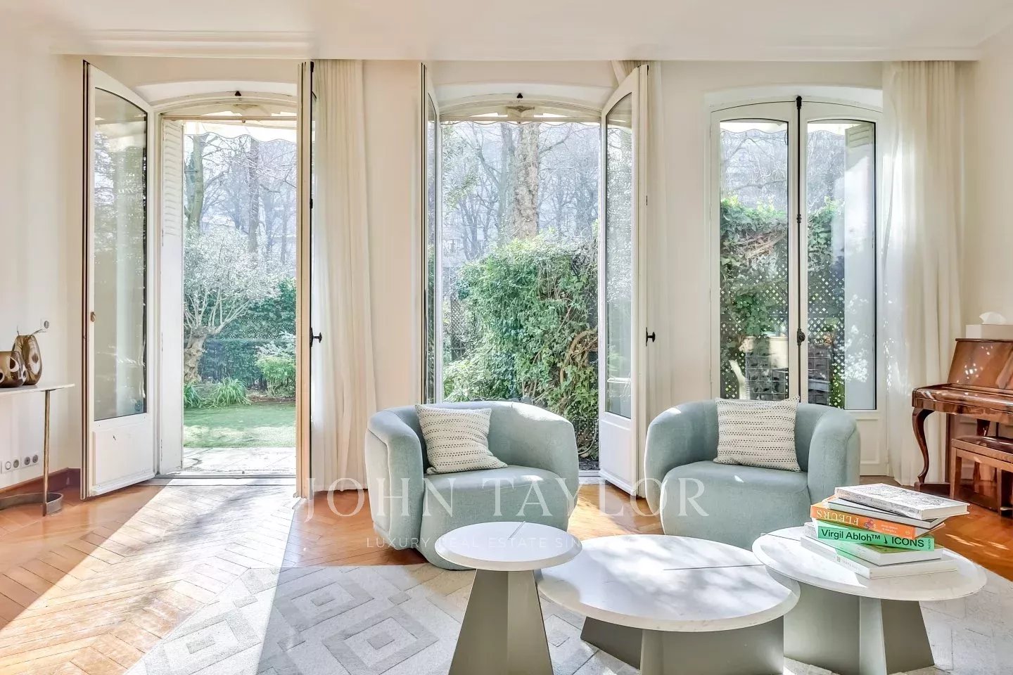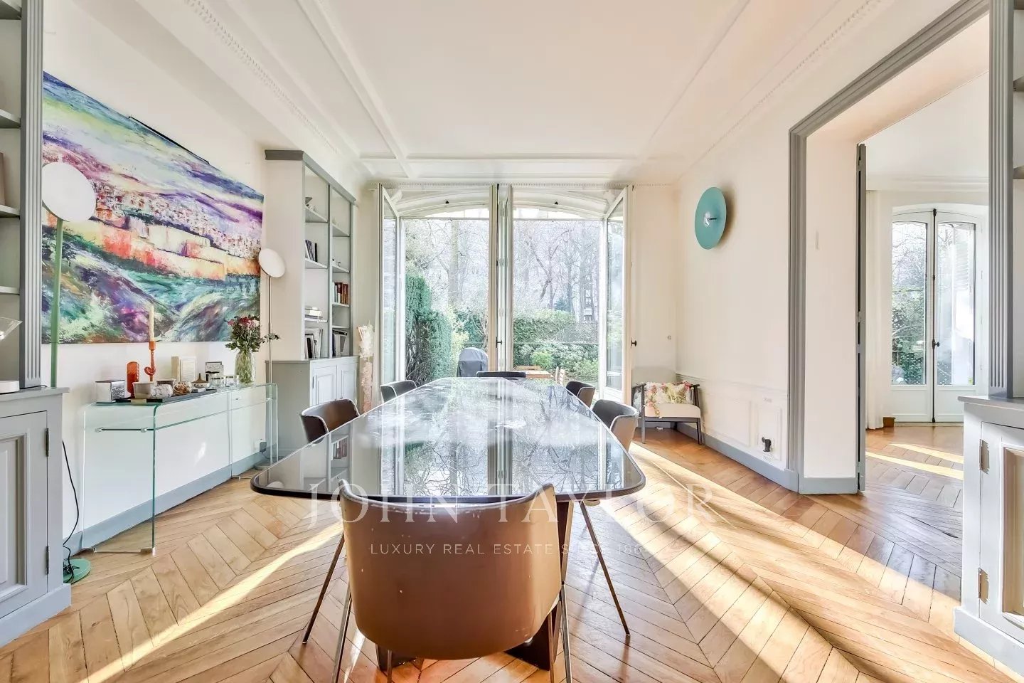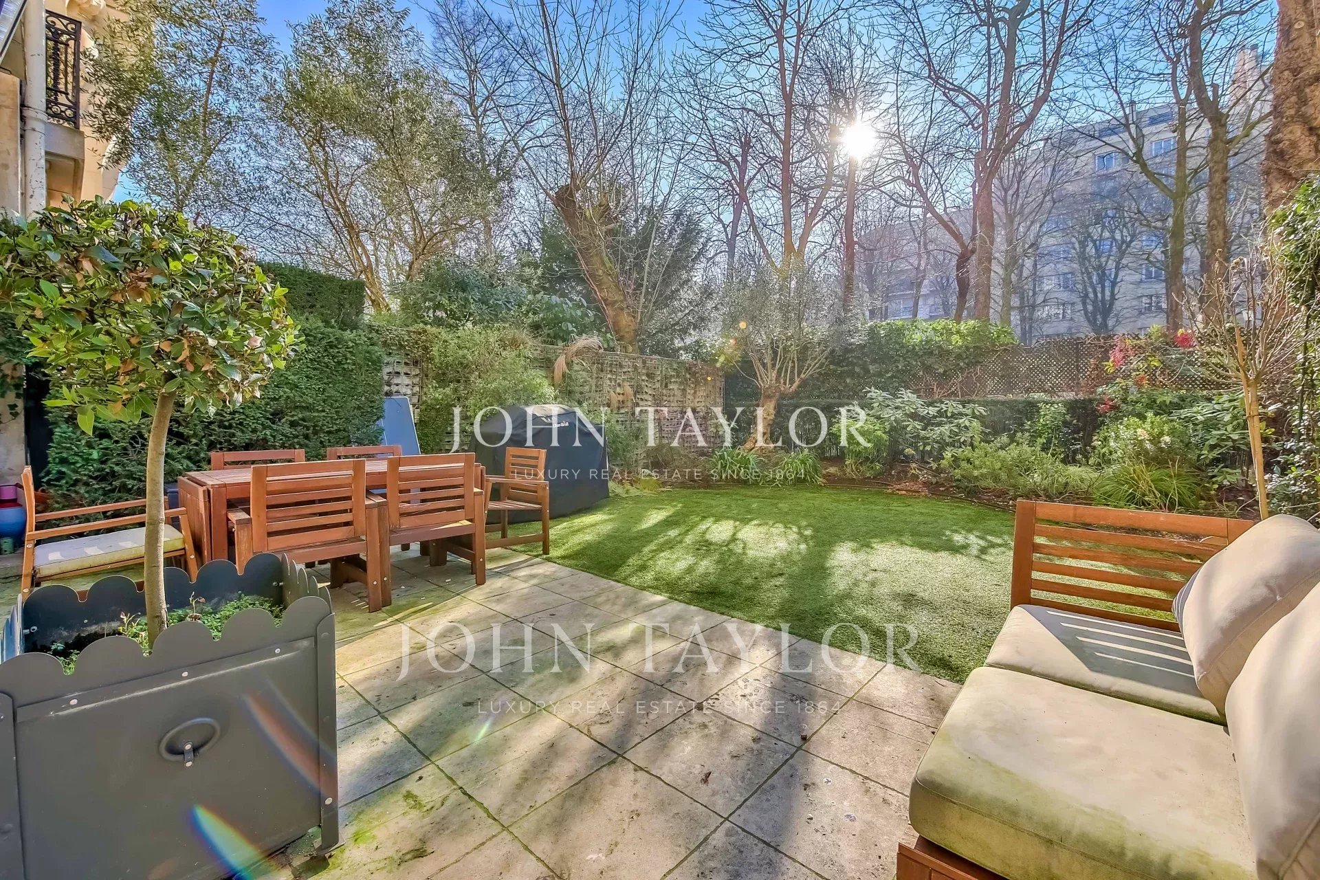 Au coeur des jardins du Ranelagh, dans un immeuble de pierre de taille sécurisé avec un gardien. Nous vous proposons un appartement de réception et familial en rez-de-jardin, explosé plein sud, d'une surface de 226.88m² (loi Carrez).