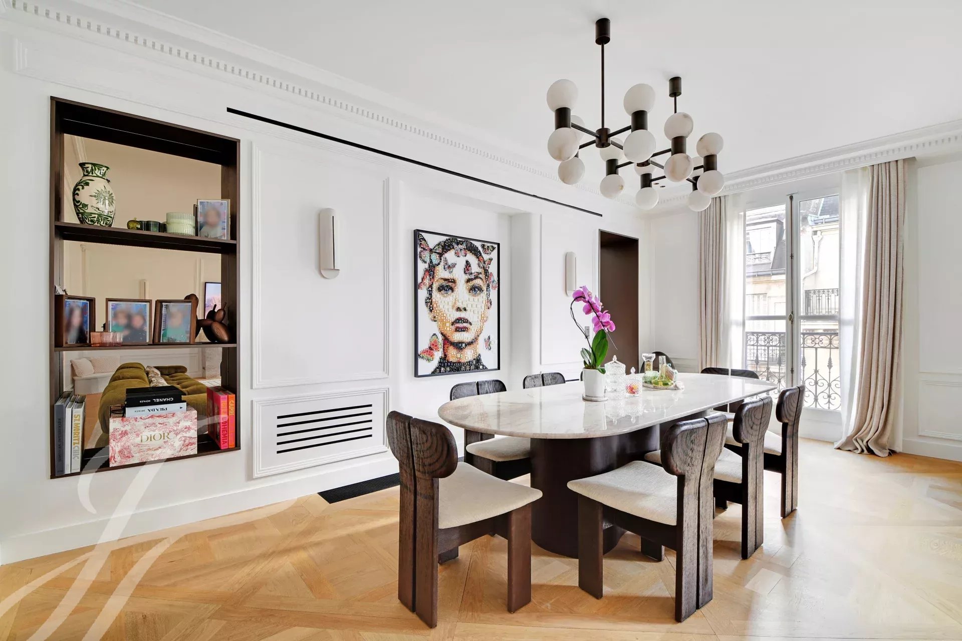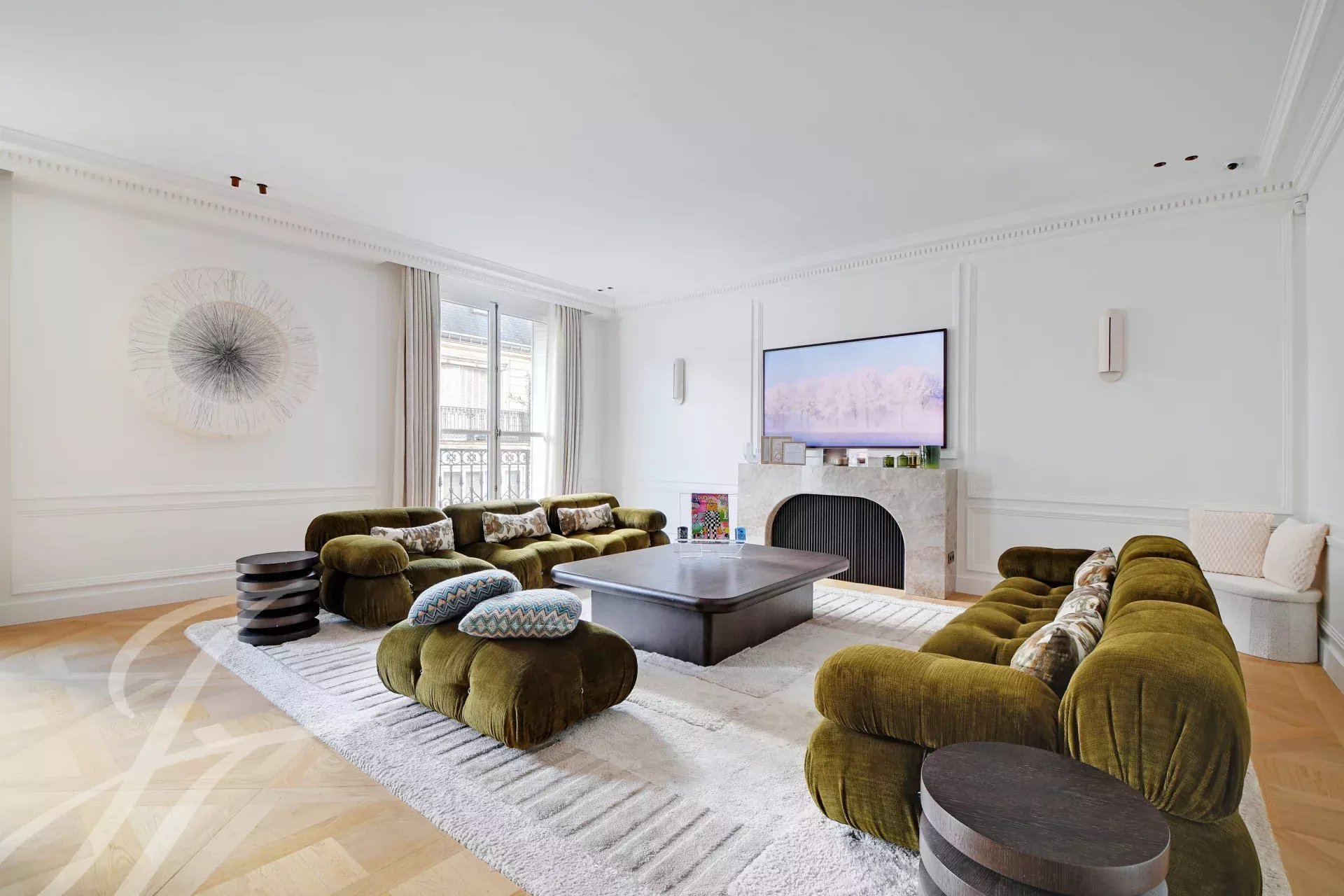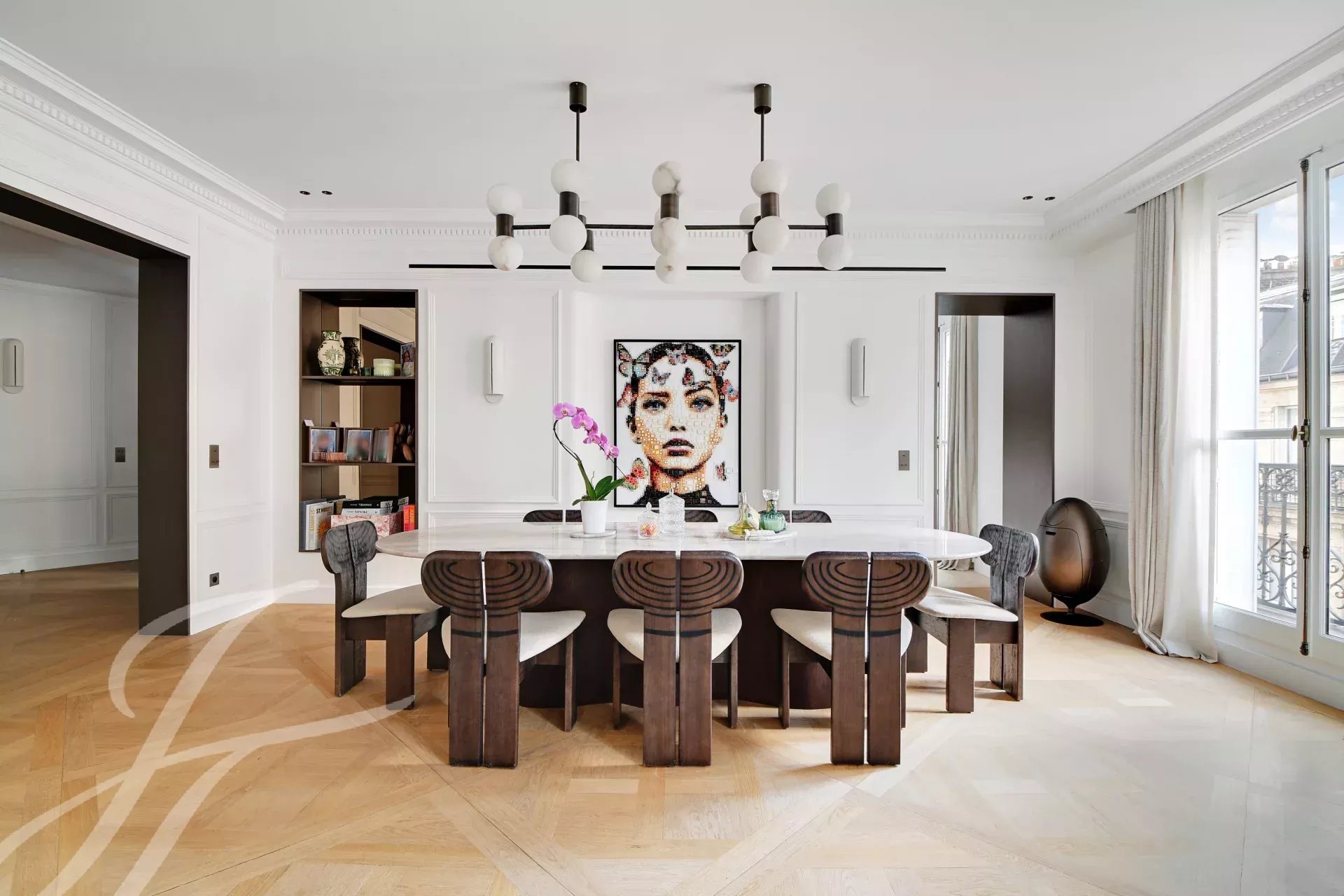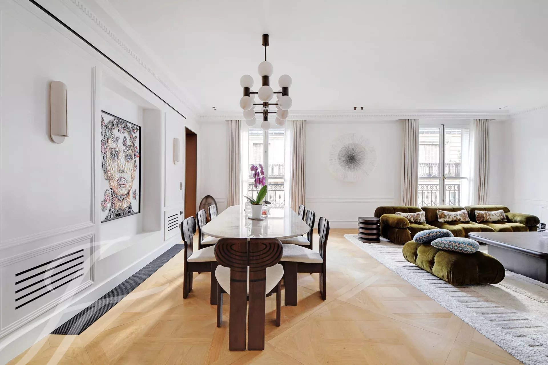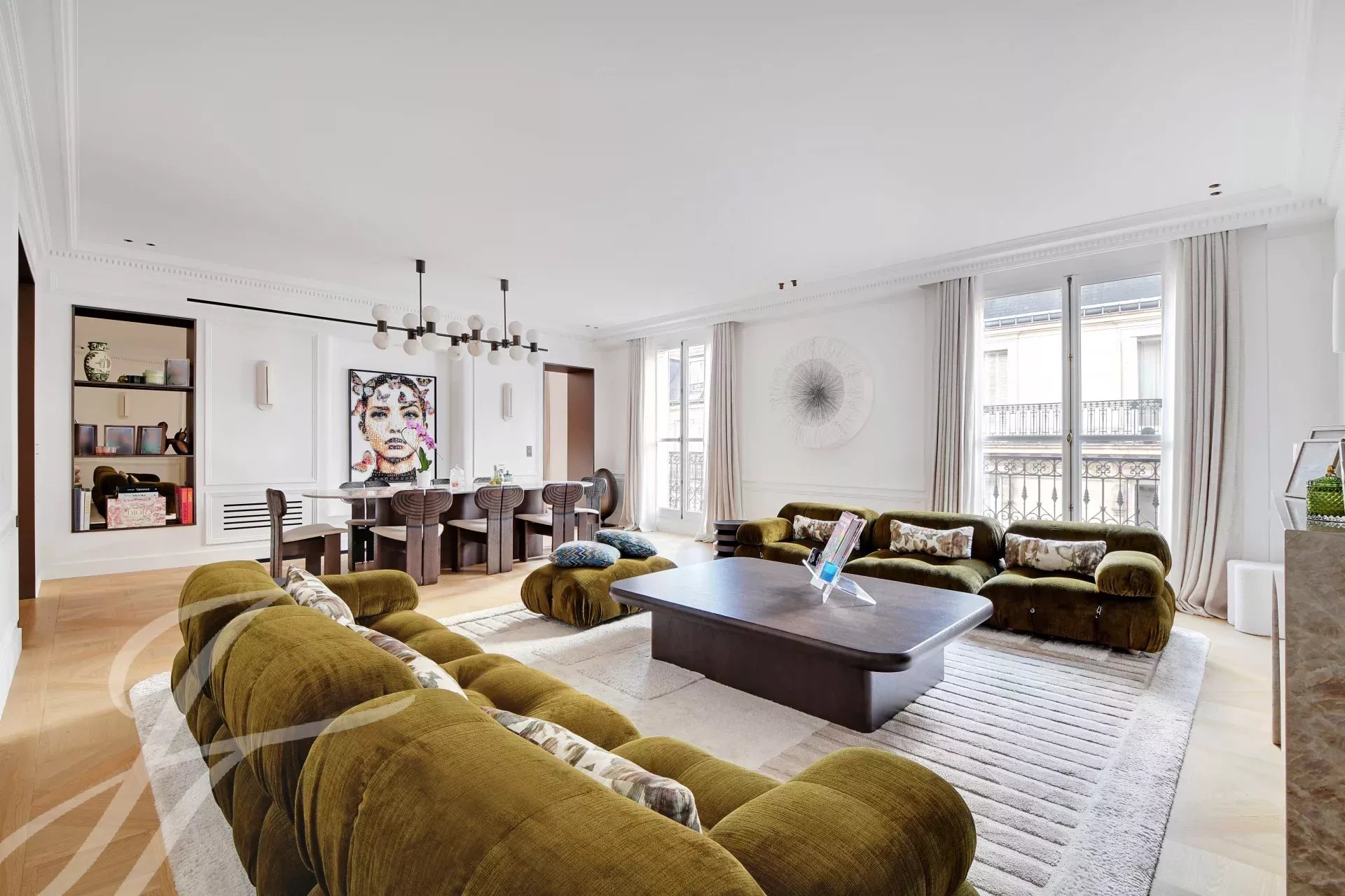 Au 5ème étage d’un immeuble haussmannien de grand standing avec ascenseur, superbe appartement familial et de réception de 152 m² carrez, bénéficiant d’un balcon filant et d’une belle luminosité traversante.