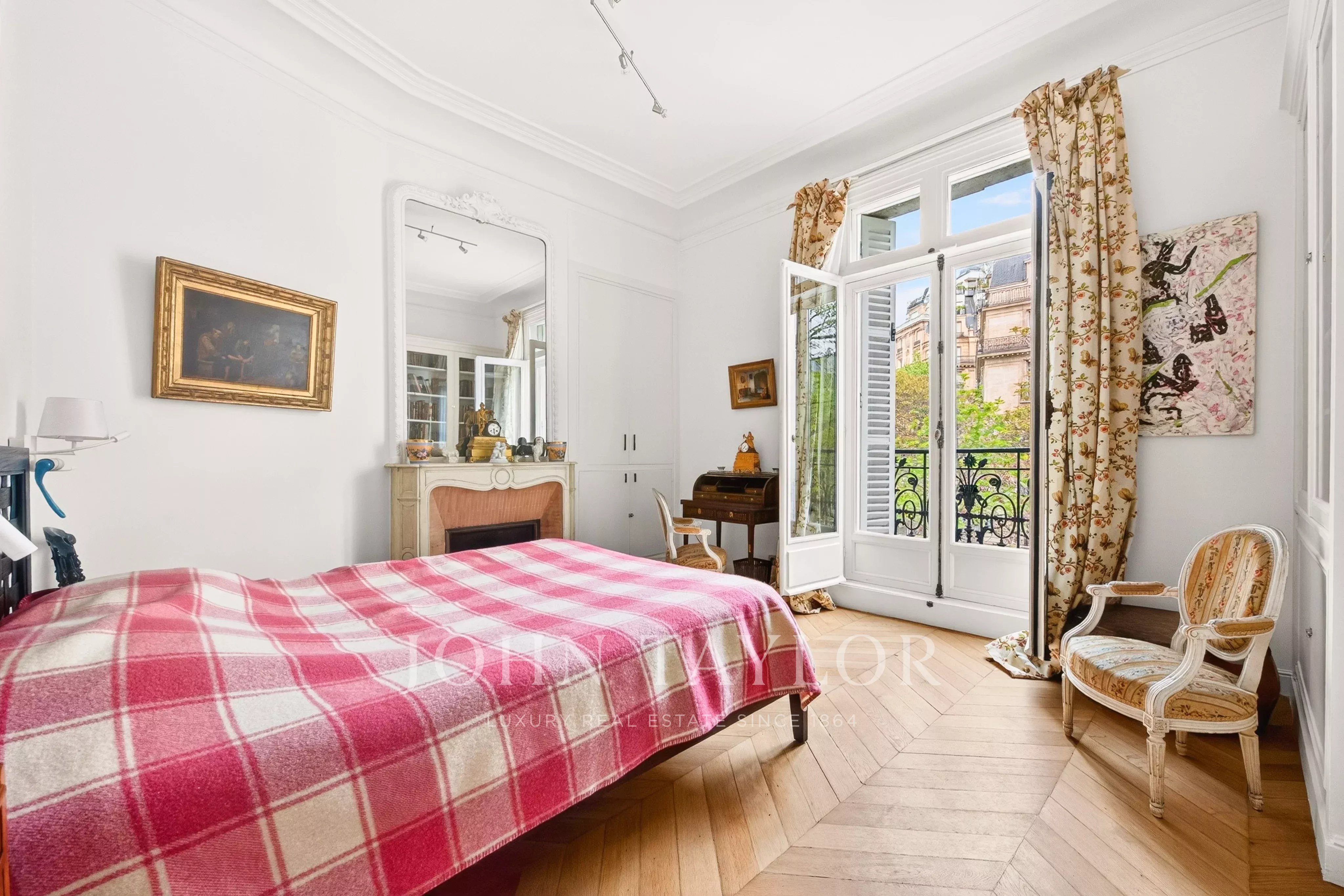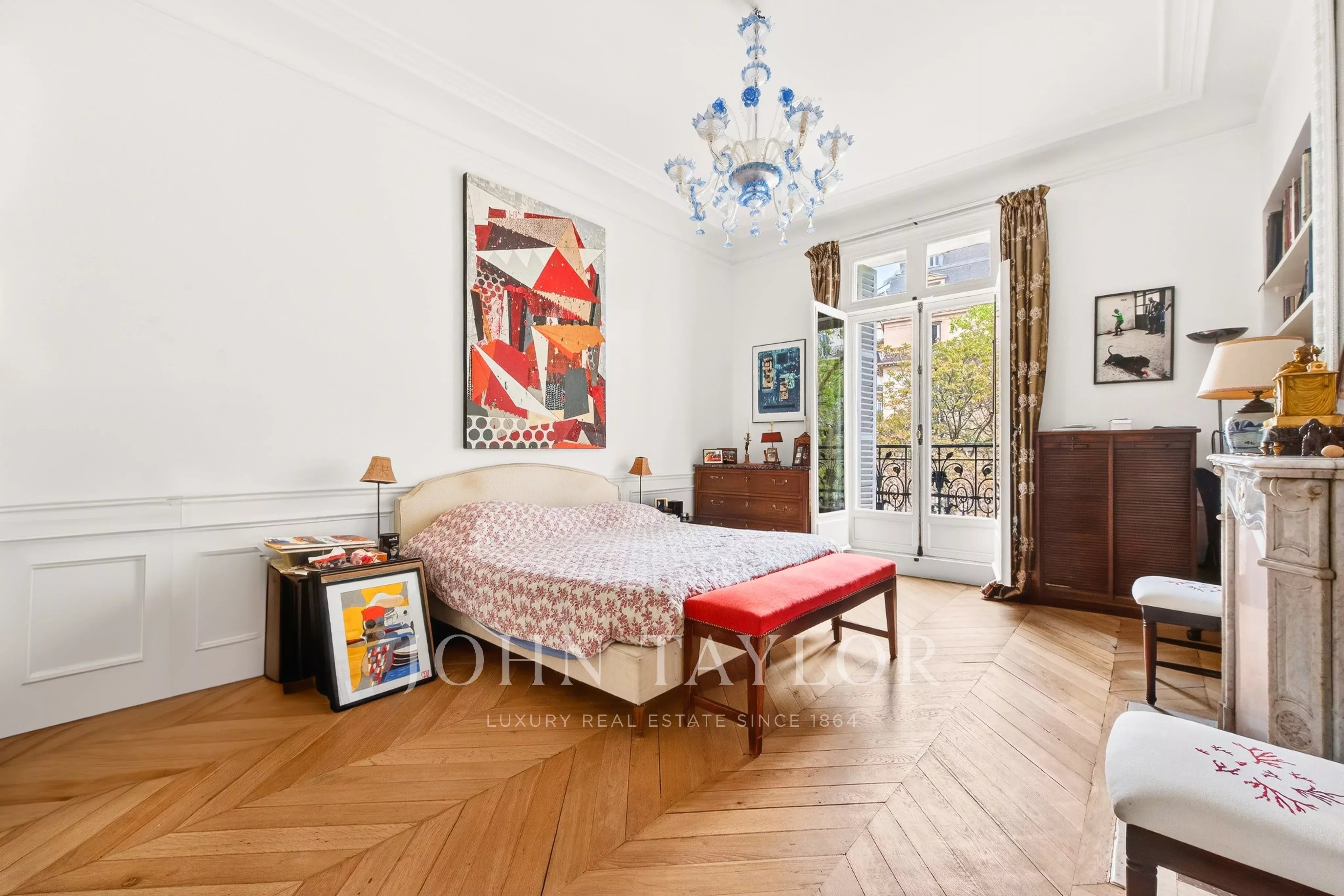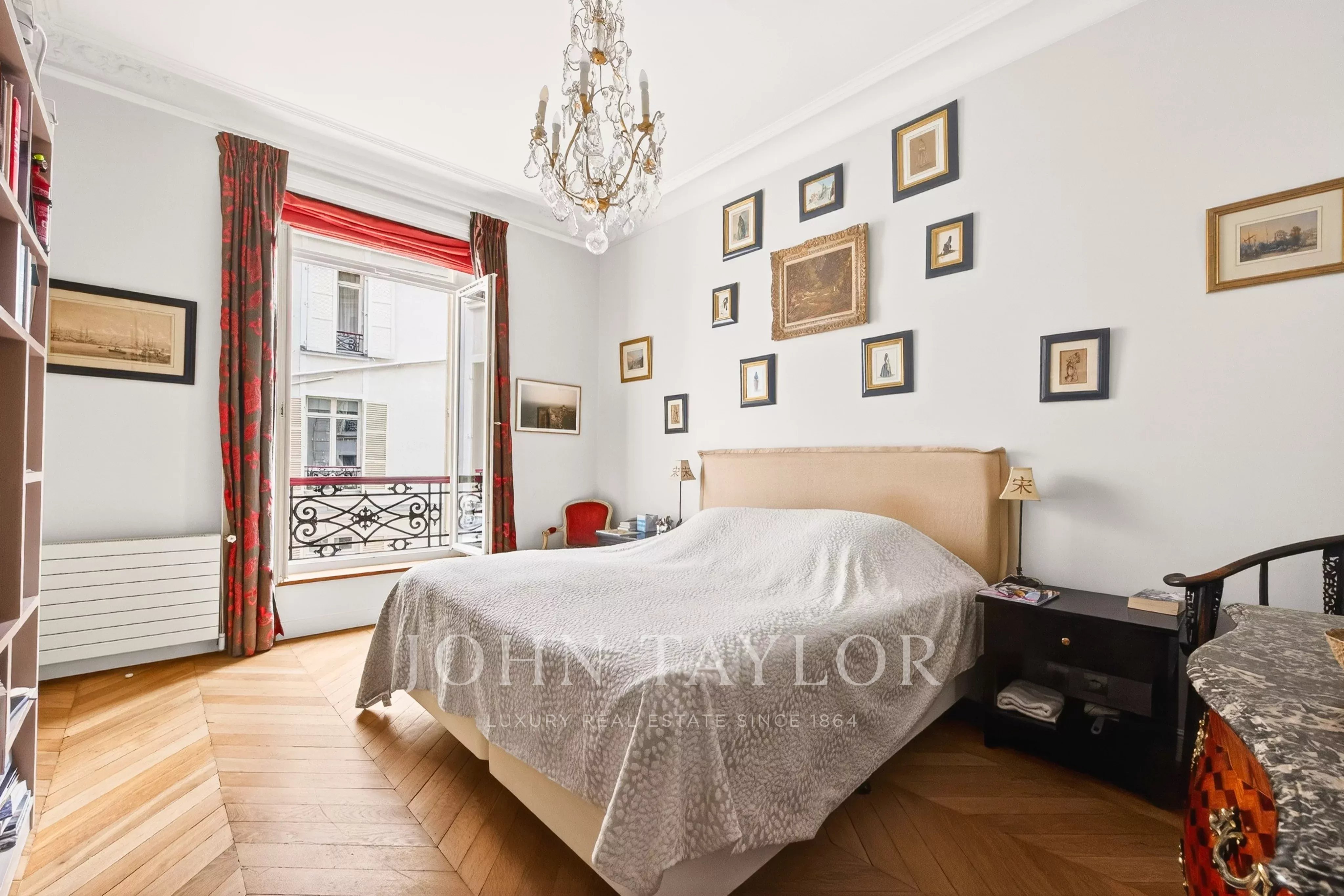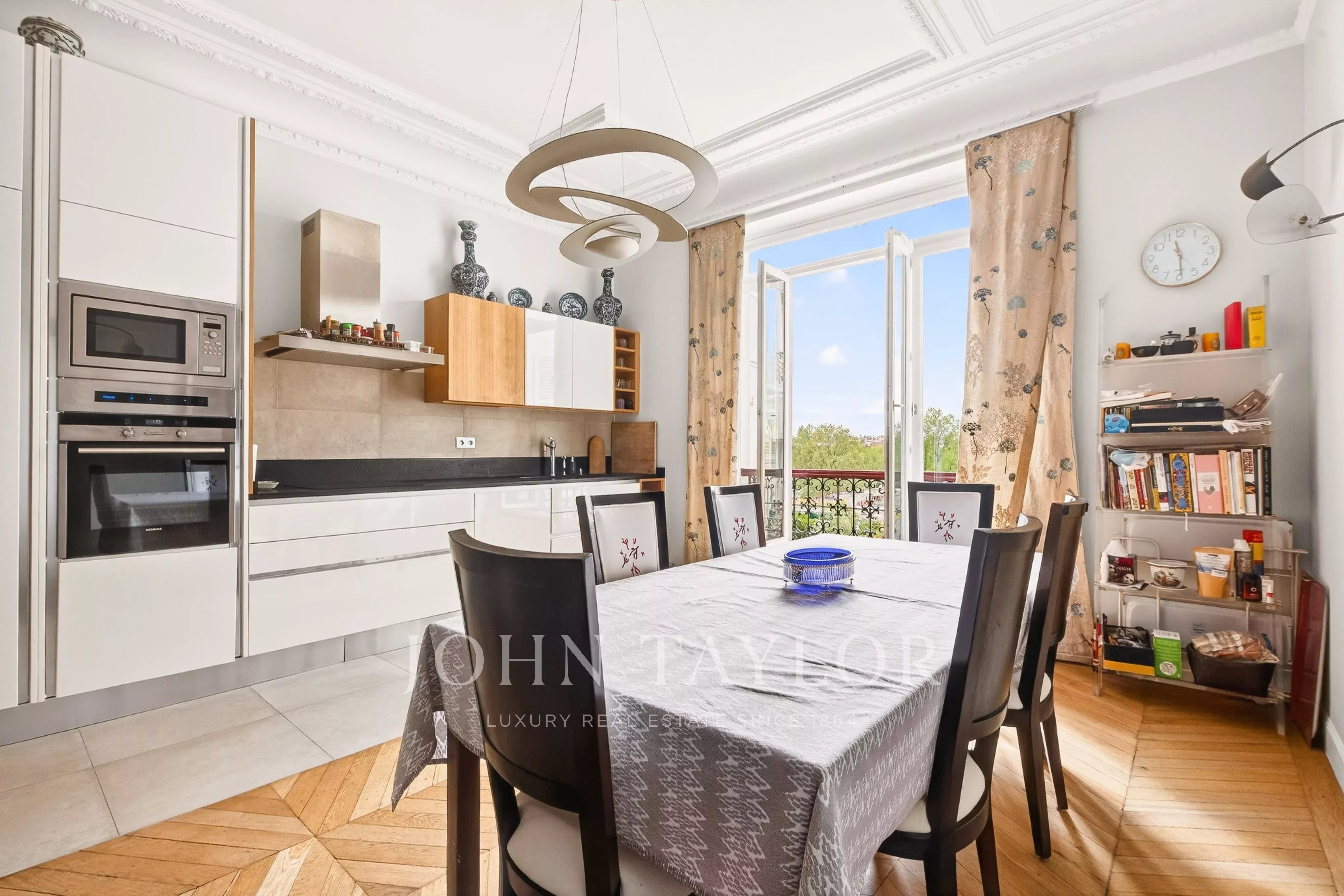 La galerie d’entrée ouvre sur une spacieuse double réception, prolongée par un balcon filant qui offre une vue sur la place d'Iéna et le musée Galliera. La cuisine dînatoire, entièrement aménagée et équipée, bénéficie d’un bel ensoleillement grâce à son exposition sud-ouest et vue dégagée.