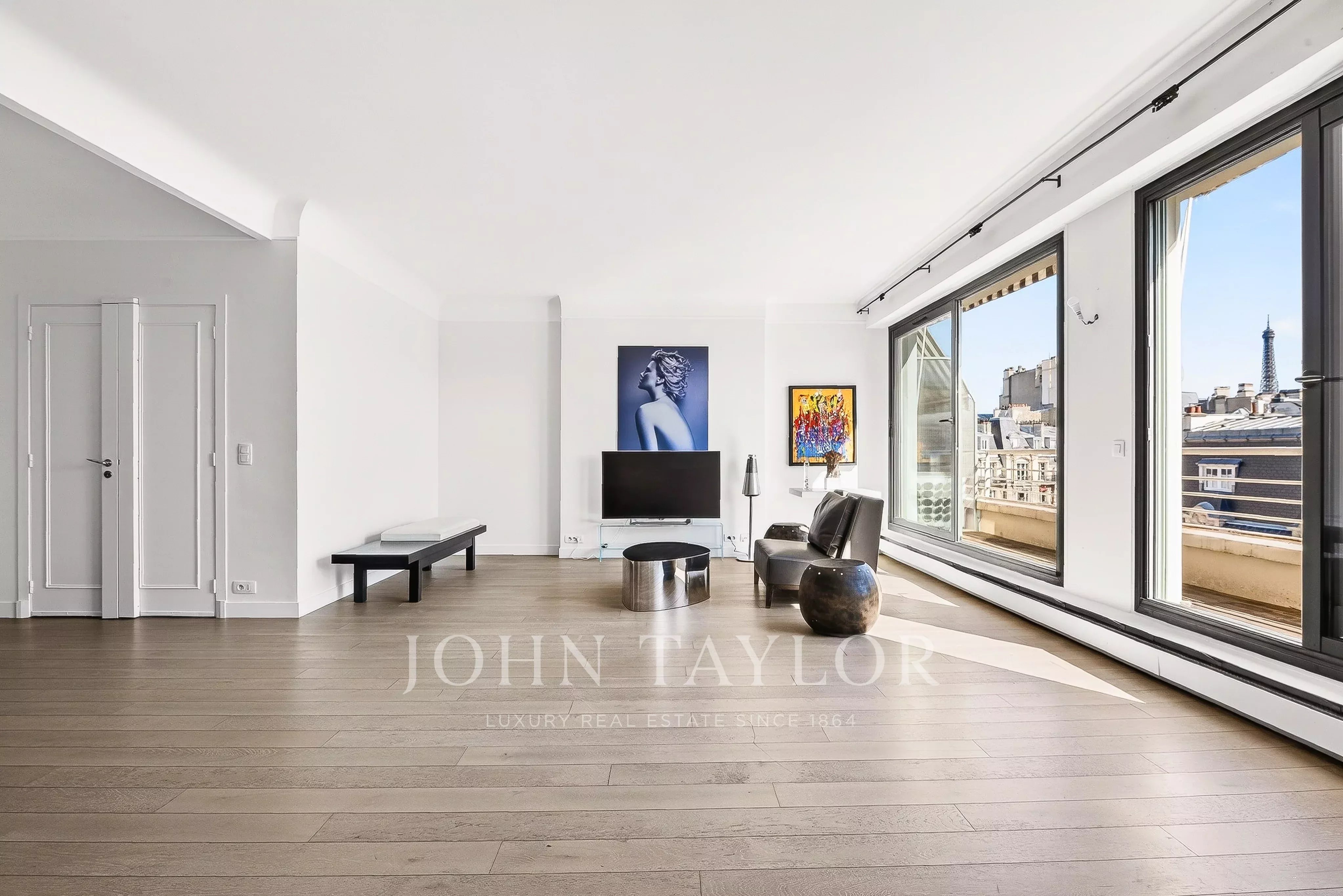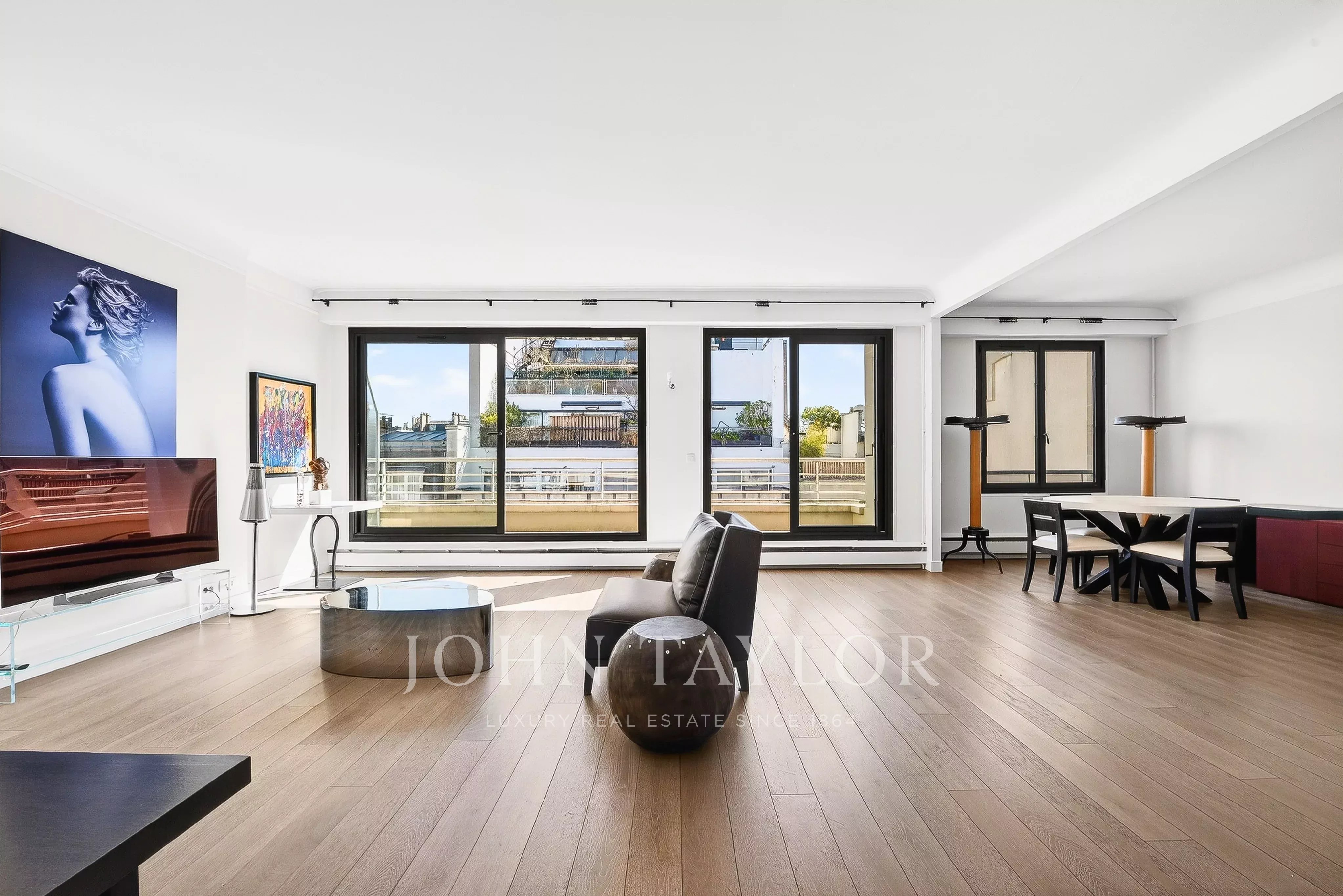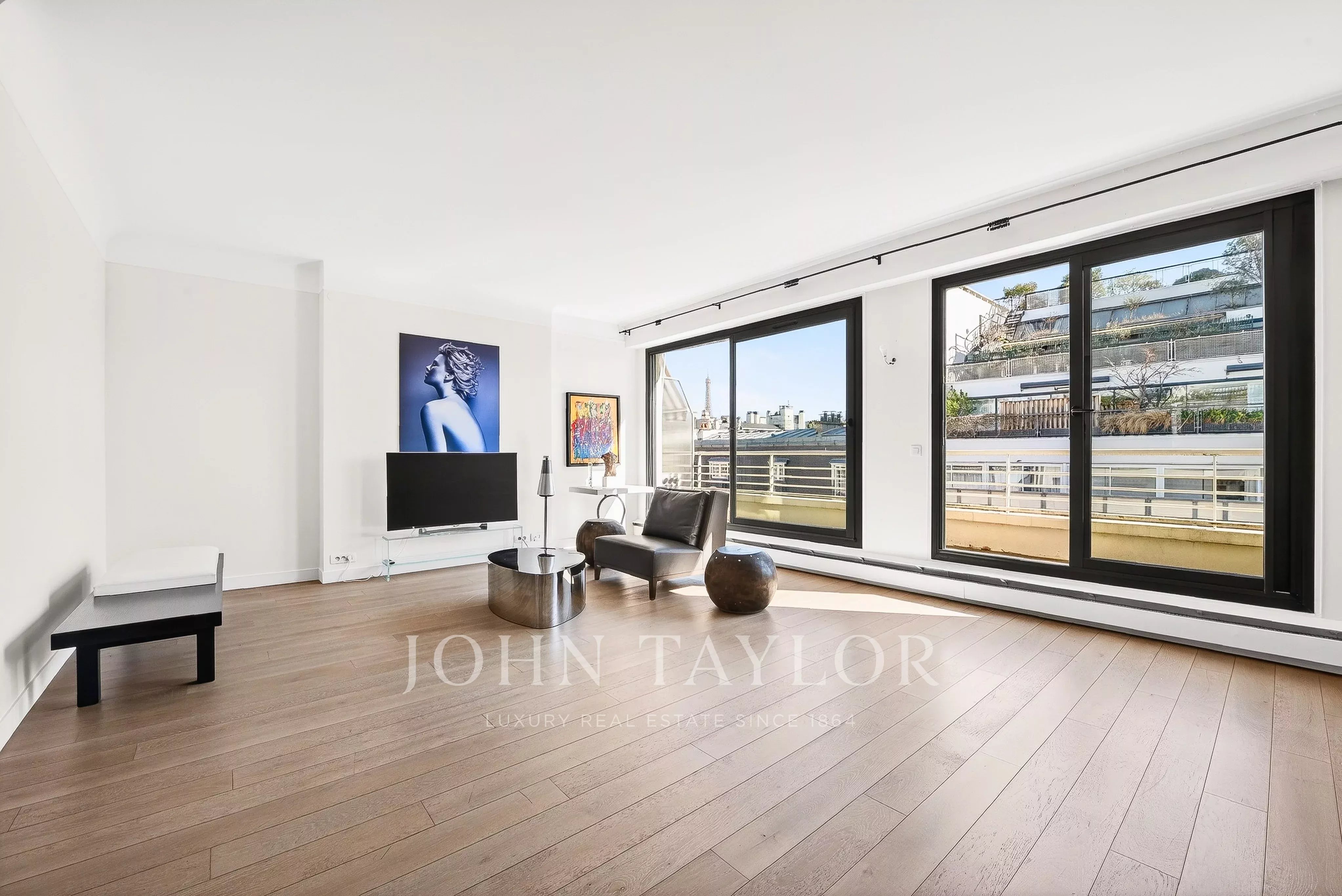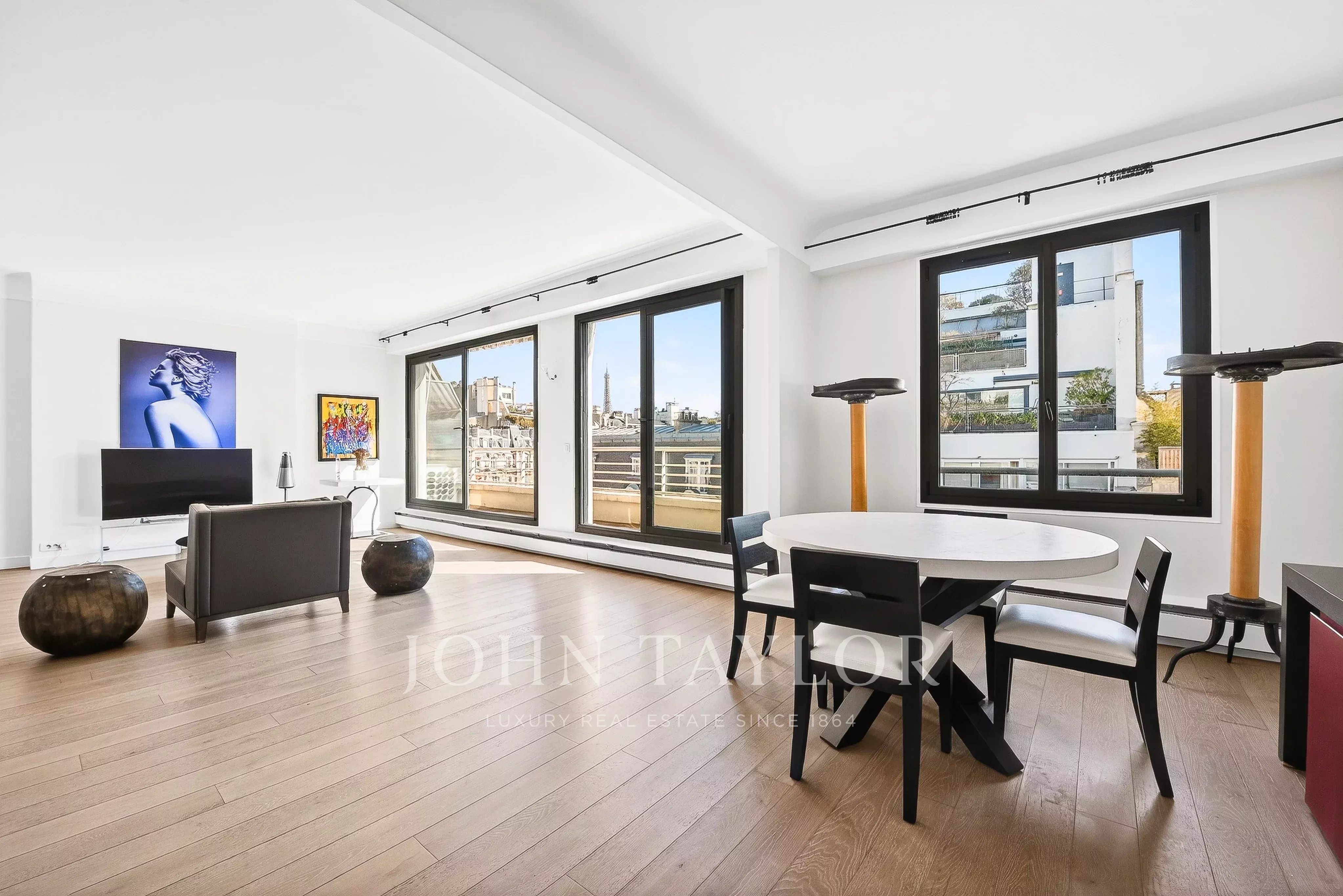 - Un vaste séjour / salle à manger baigné de lumière ouvrant sur un balcon filant avec vue sur la Tour Eiffel,