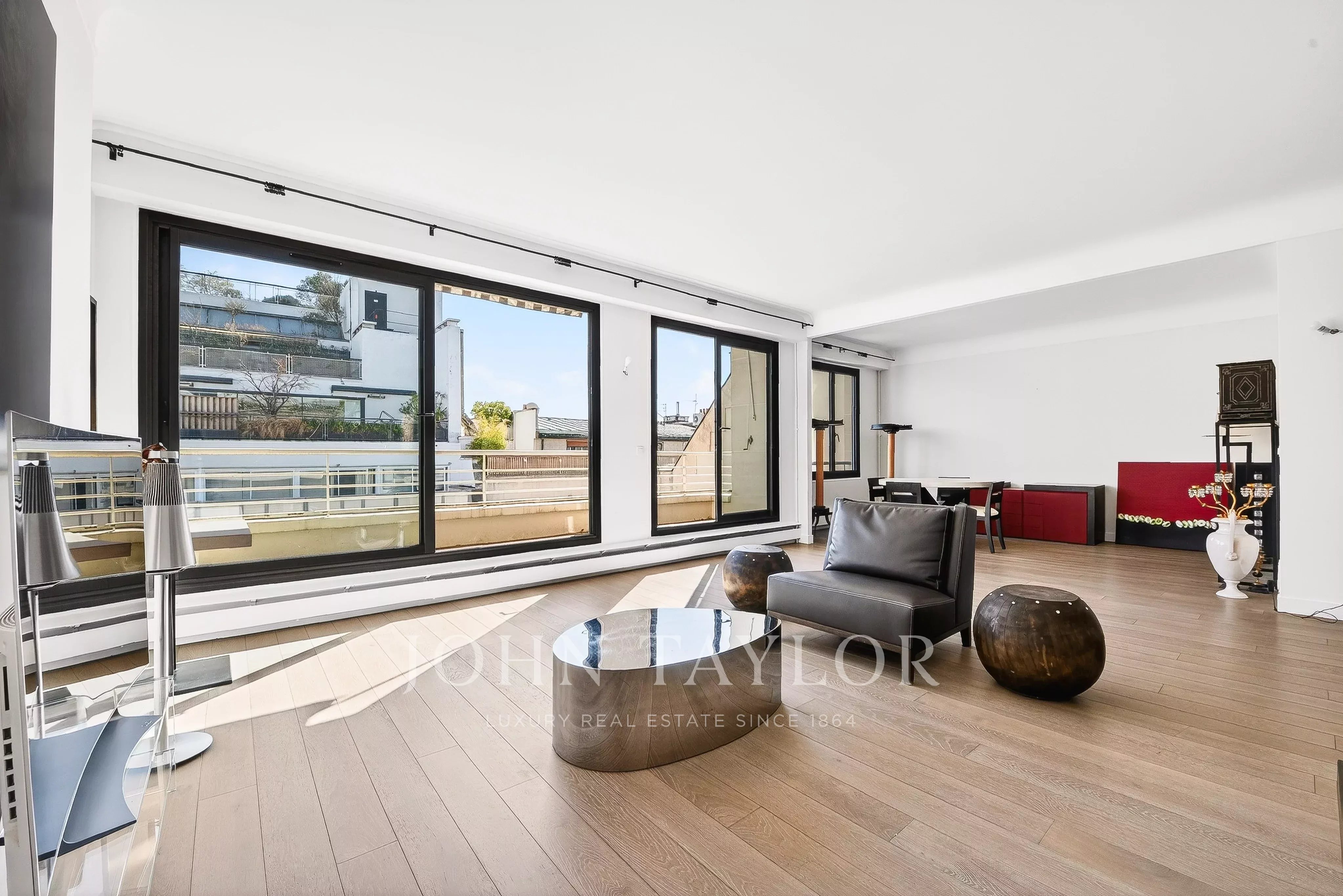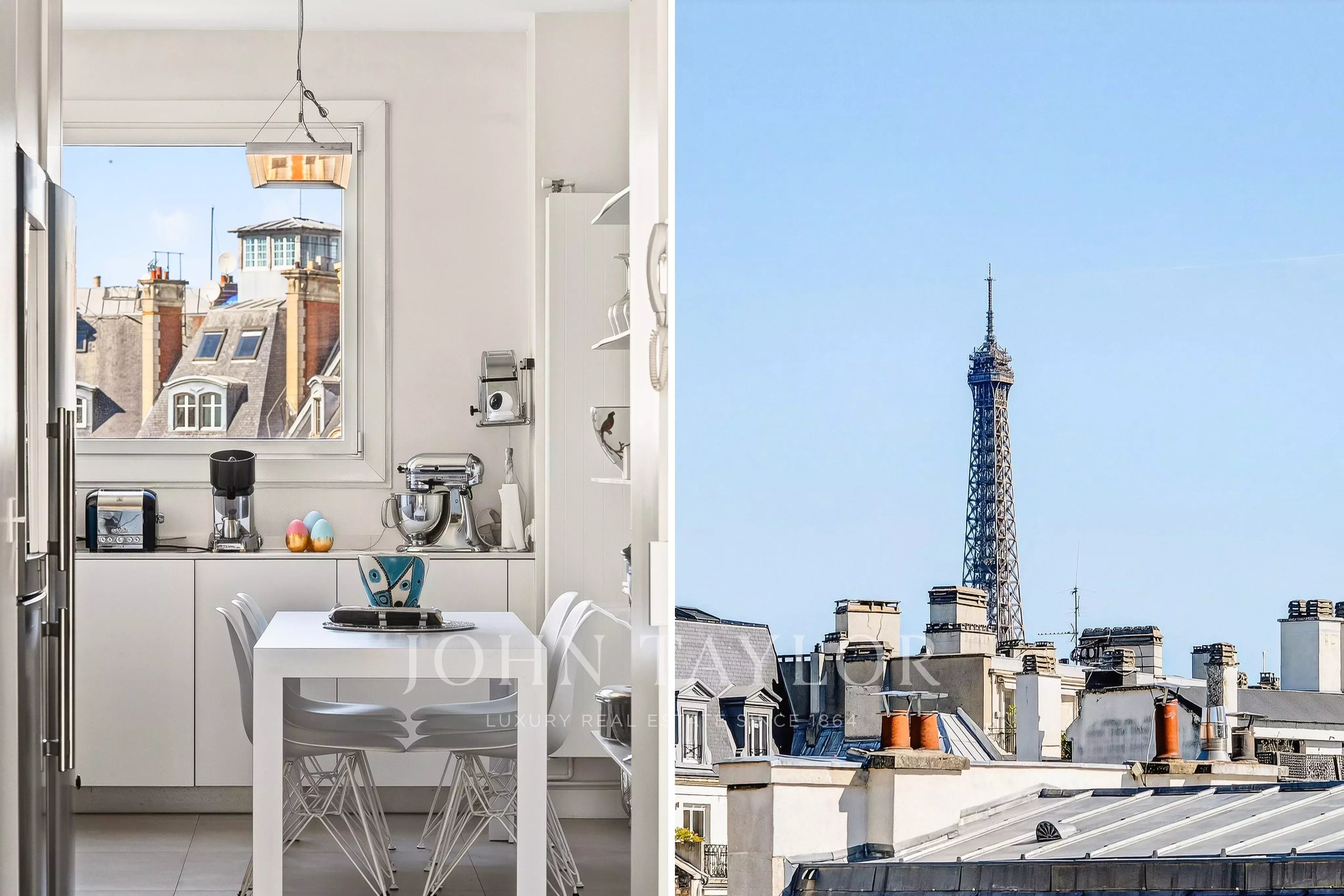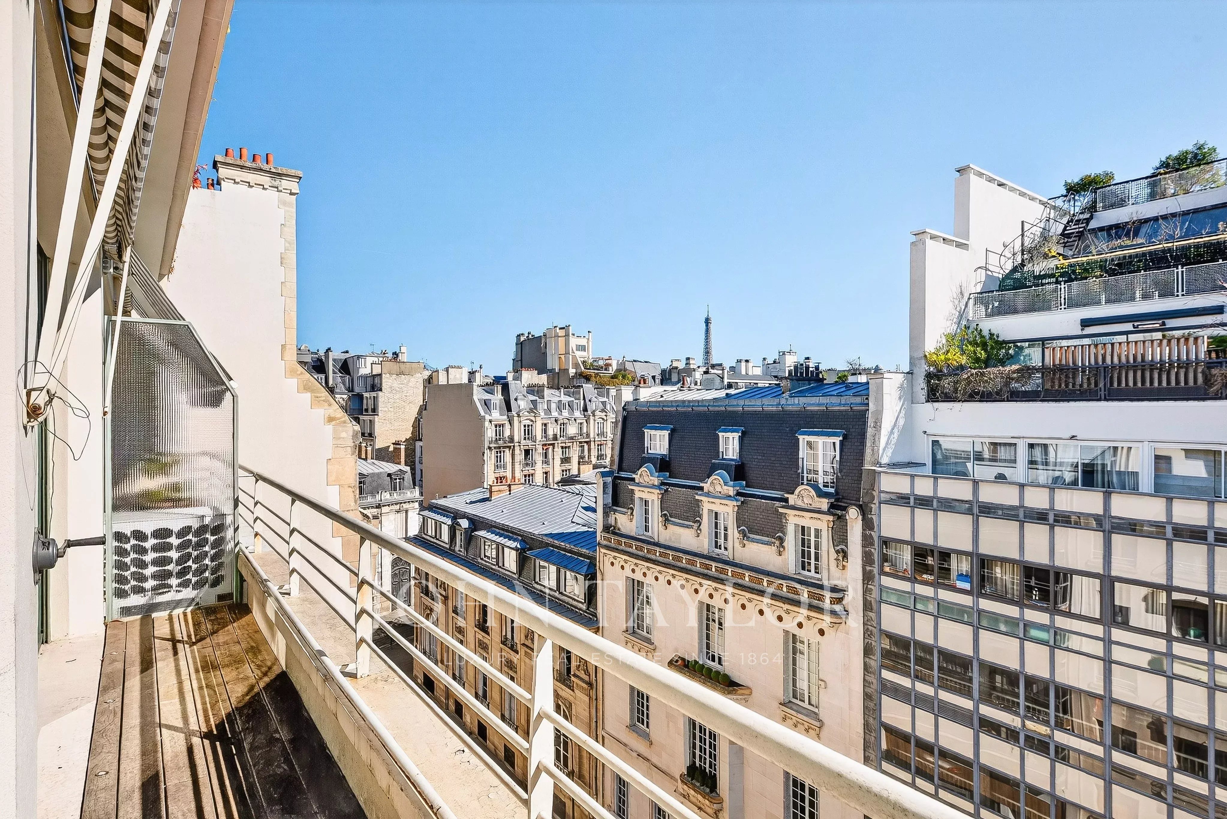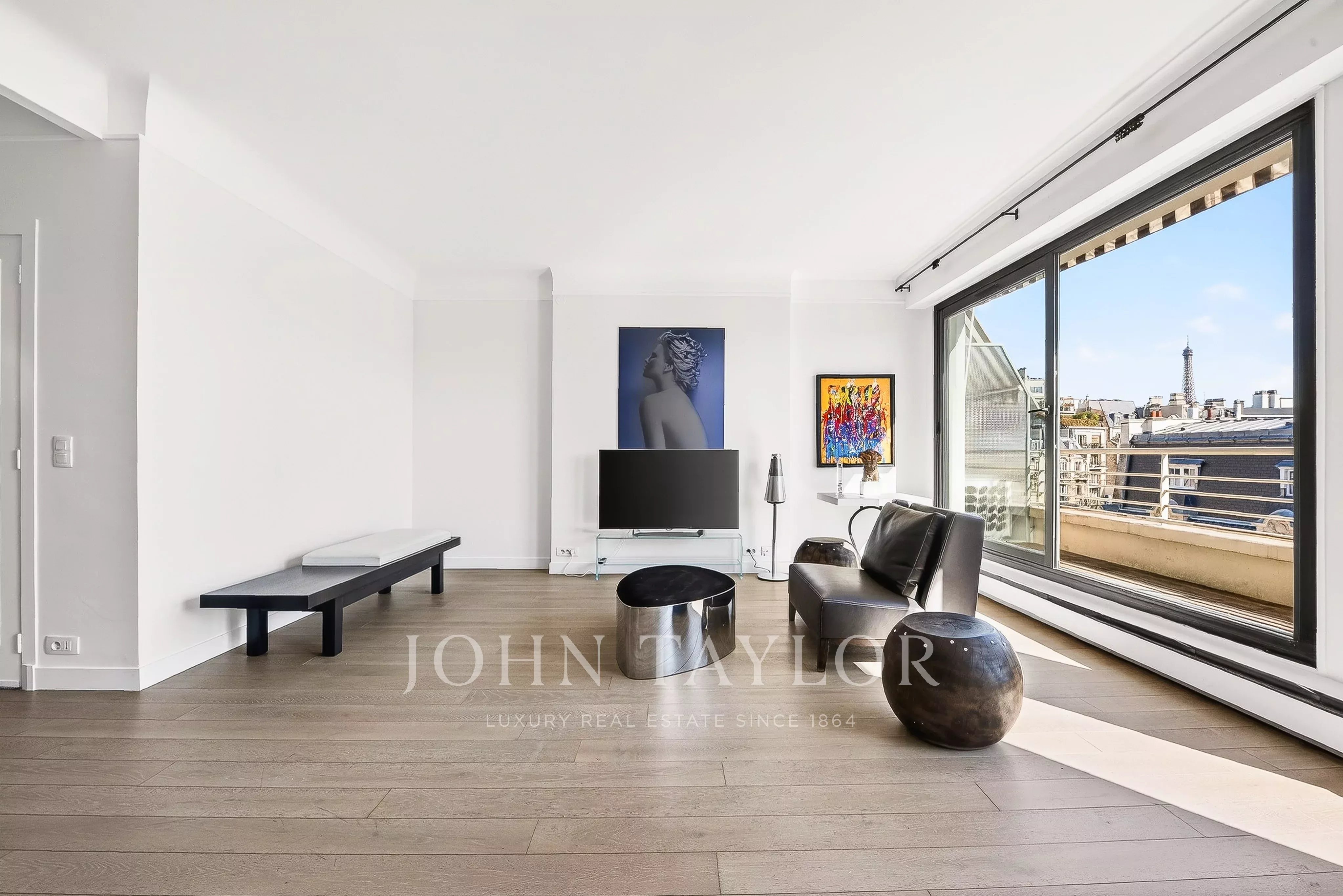 - Un vaste séjour / salle à manger baigné de lumière ouvrant sur un balcon filant avec vue sur la Tour Eiffel,