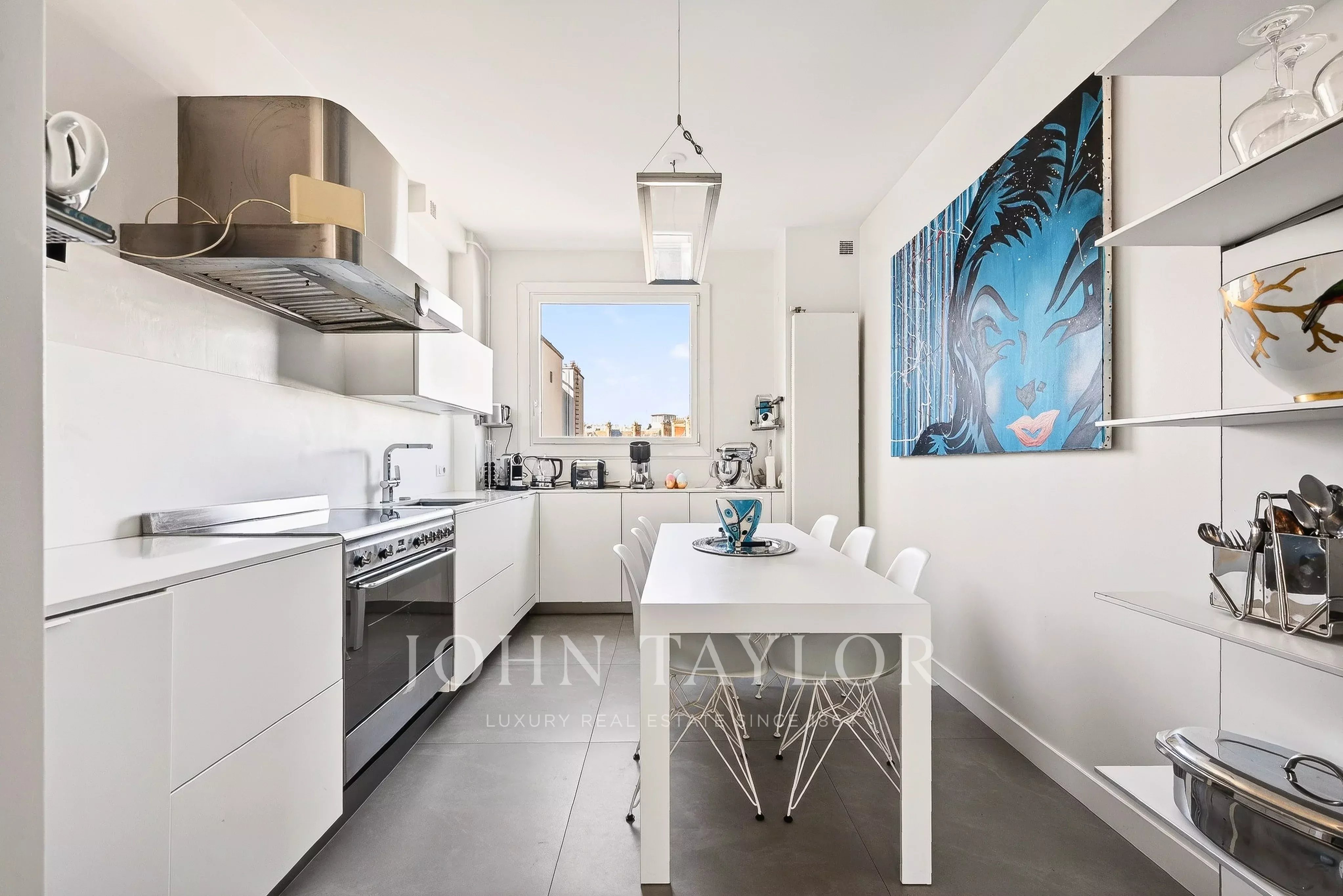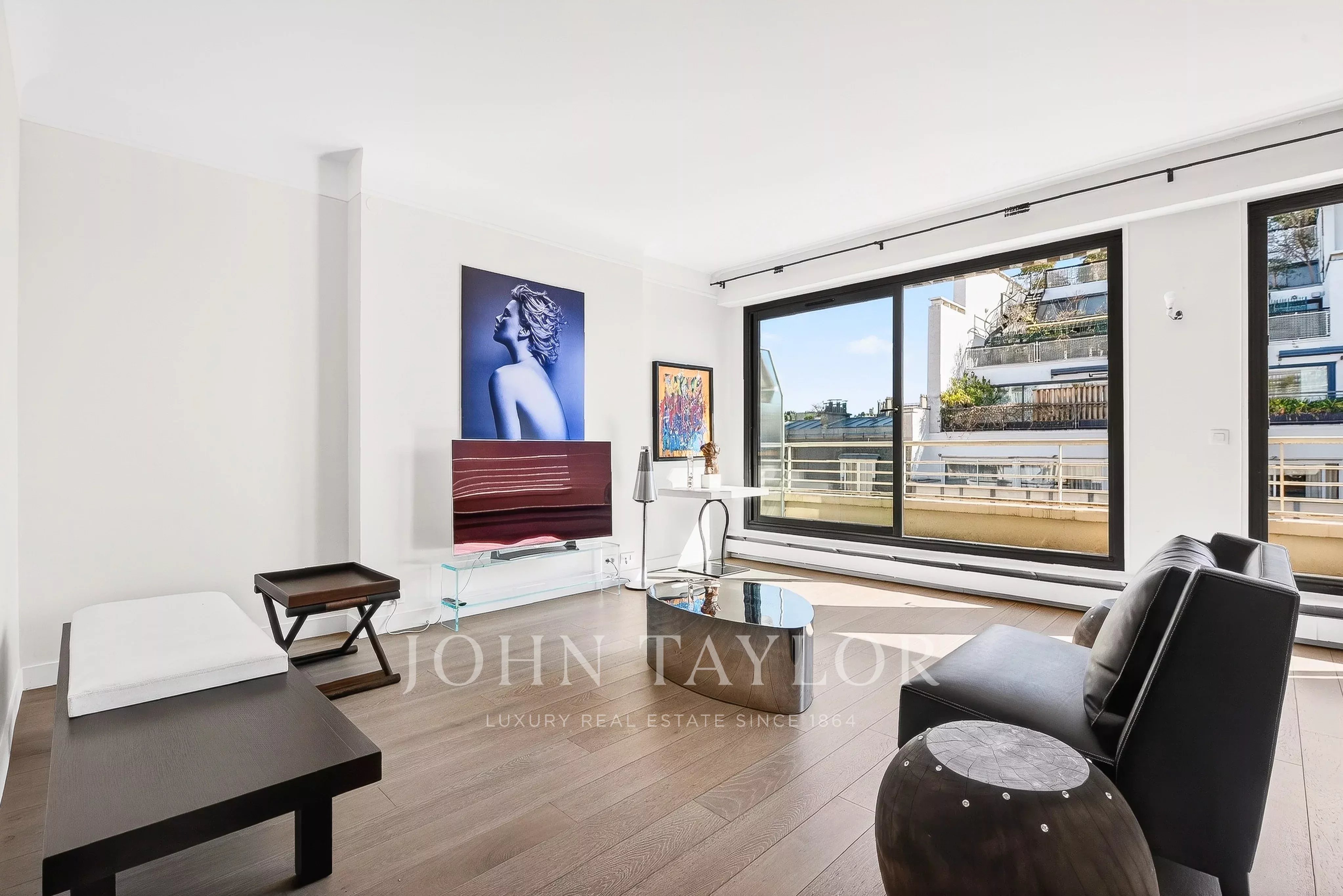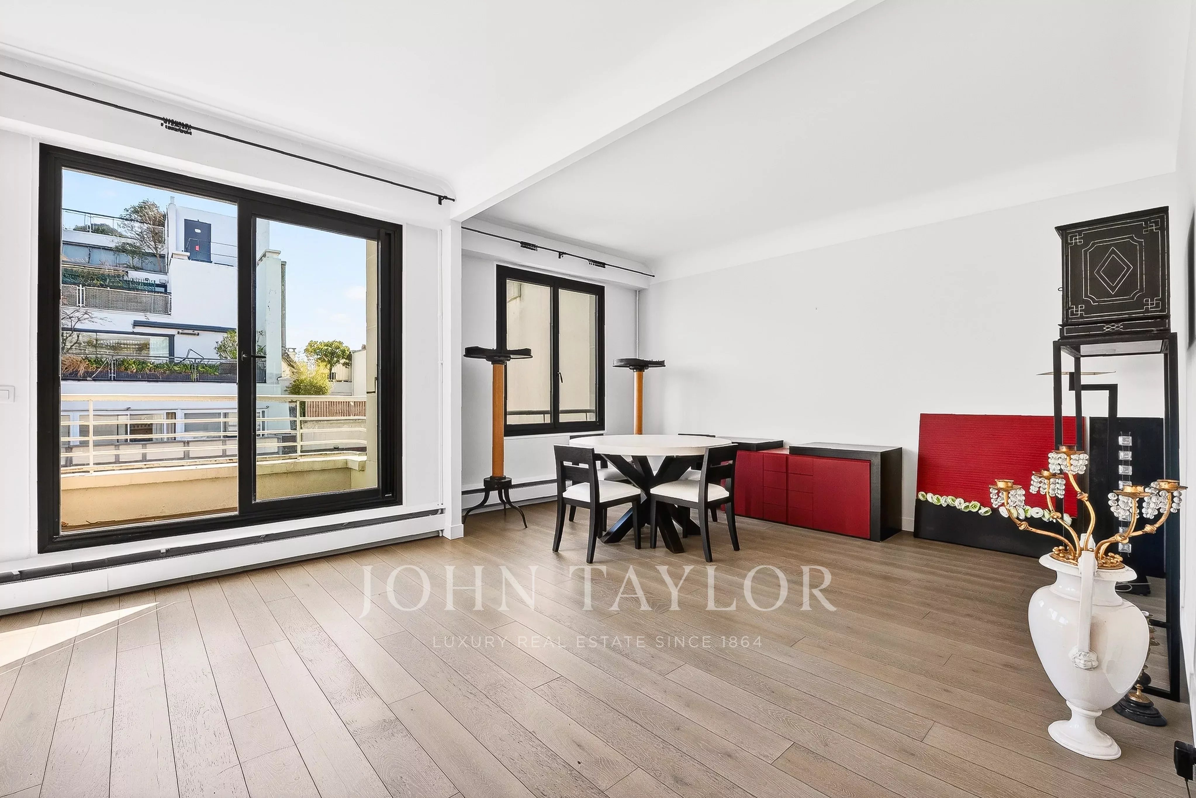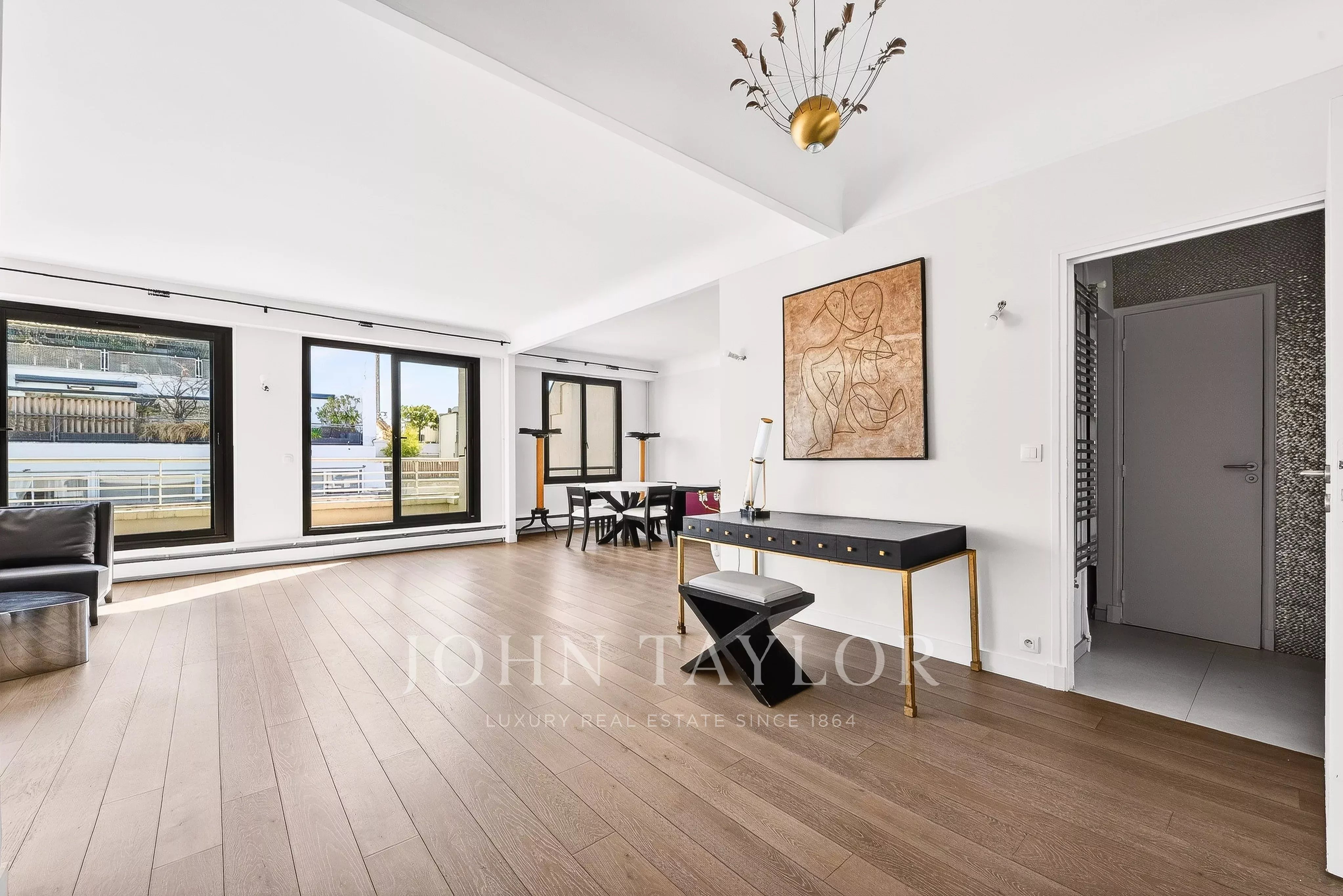 - Un vaste séjour / salle à manger baigné de lumière ouvrant sur un balcon filant avec vue sur la Tour Eiffel,