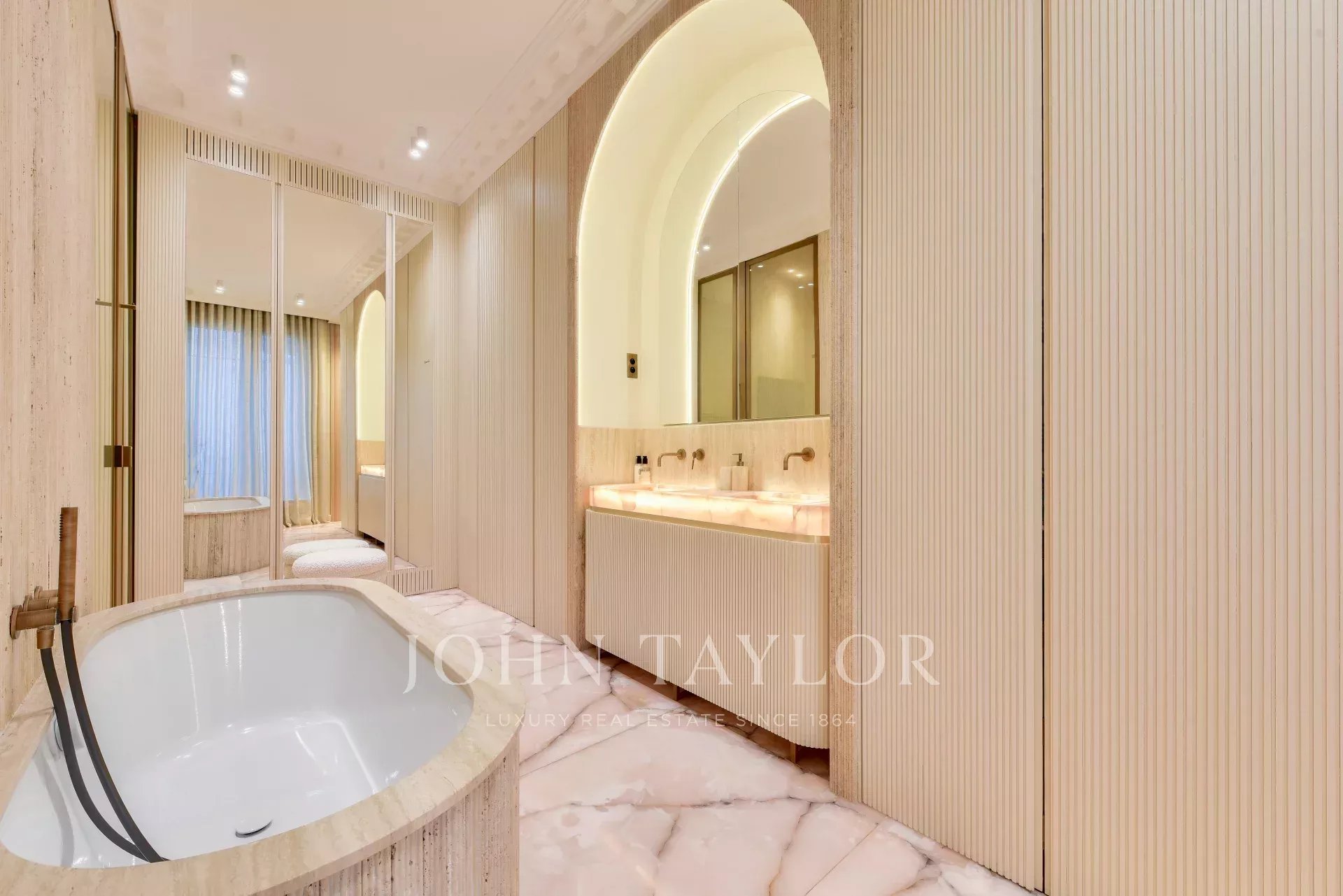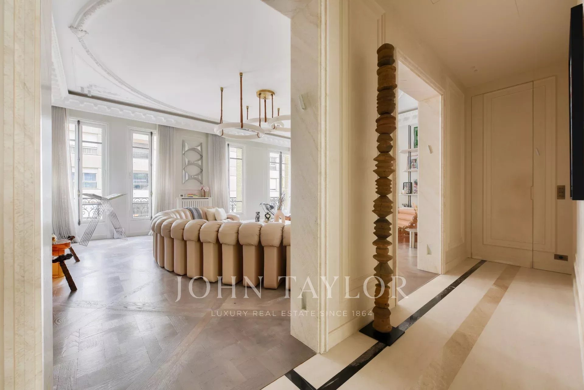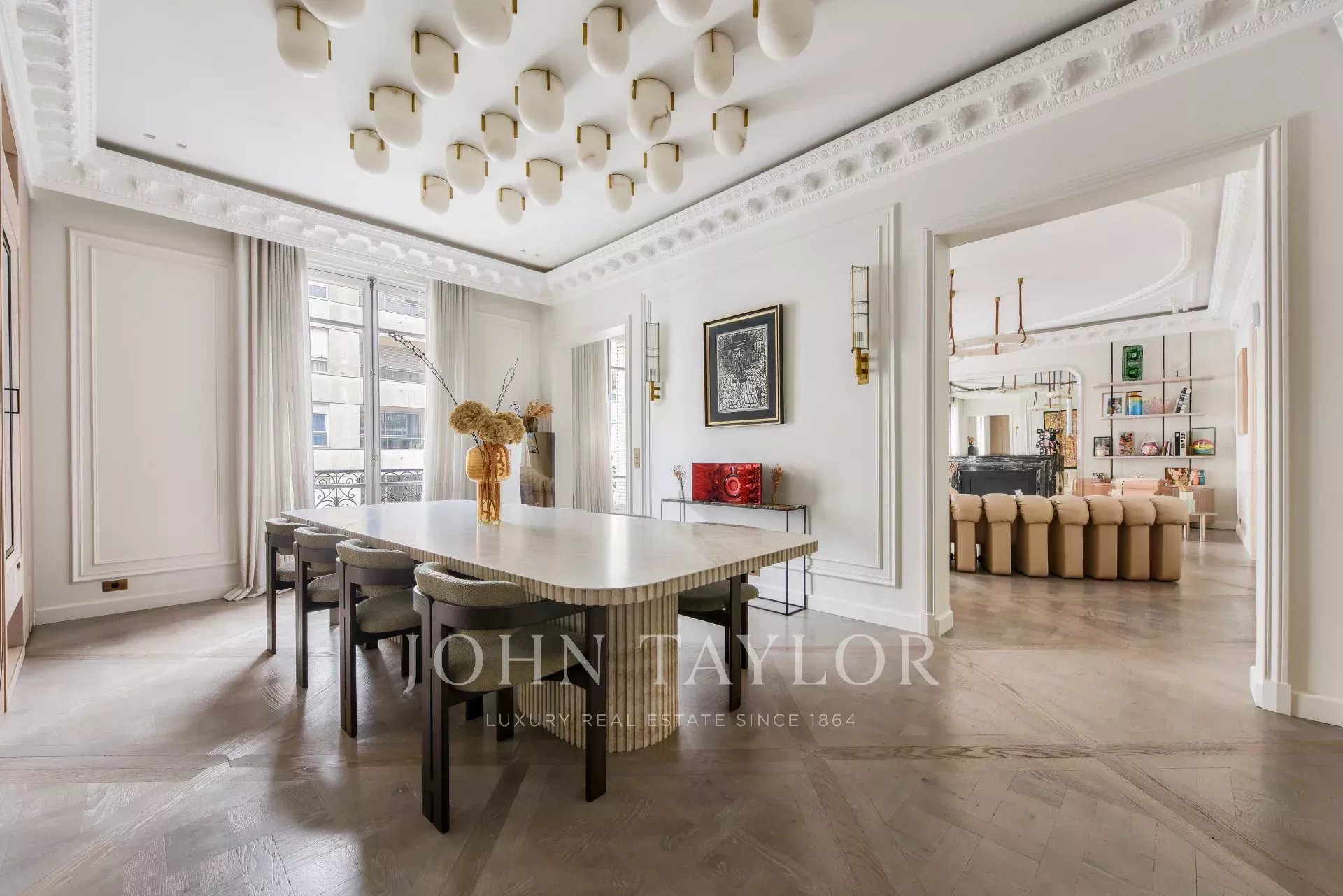 La décoration raffinée, alliée à des matériaux de grande qualité, travertin, parquet Versailles confère à l'appartement une élégance rare.