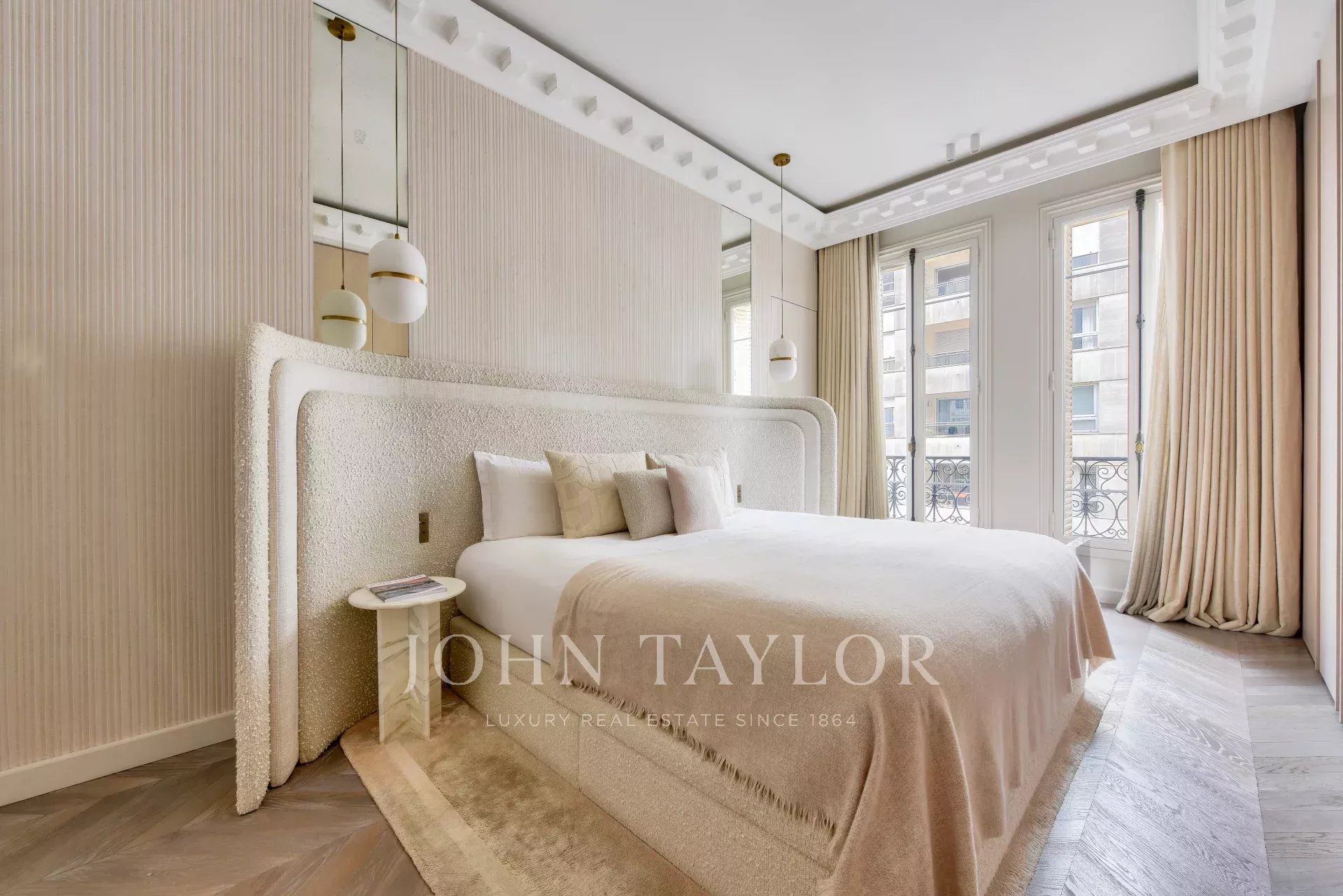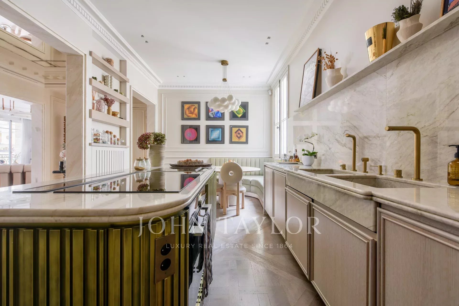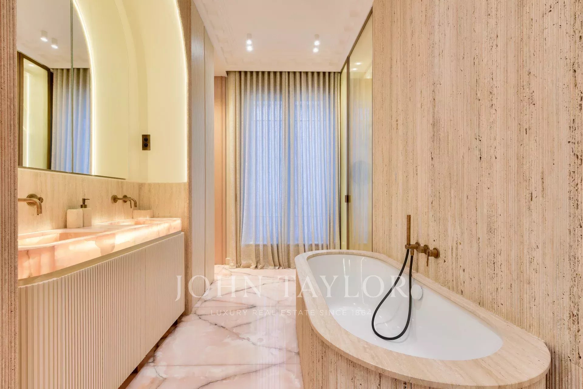 La décoration raffinée, alliée à des matériaux de grande qualité, travertin, parquet Versailles confère à l'appartement une élégance rare.