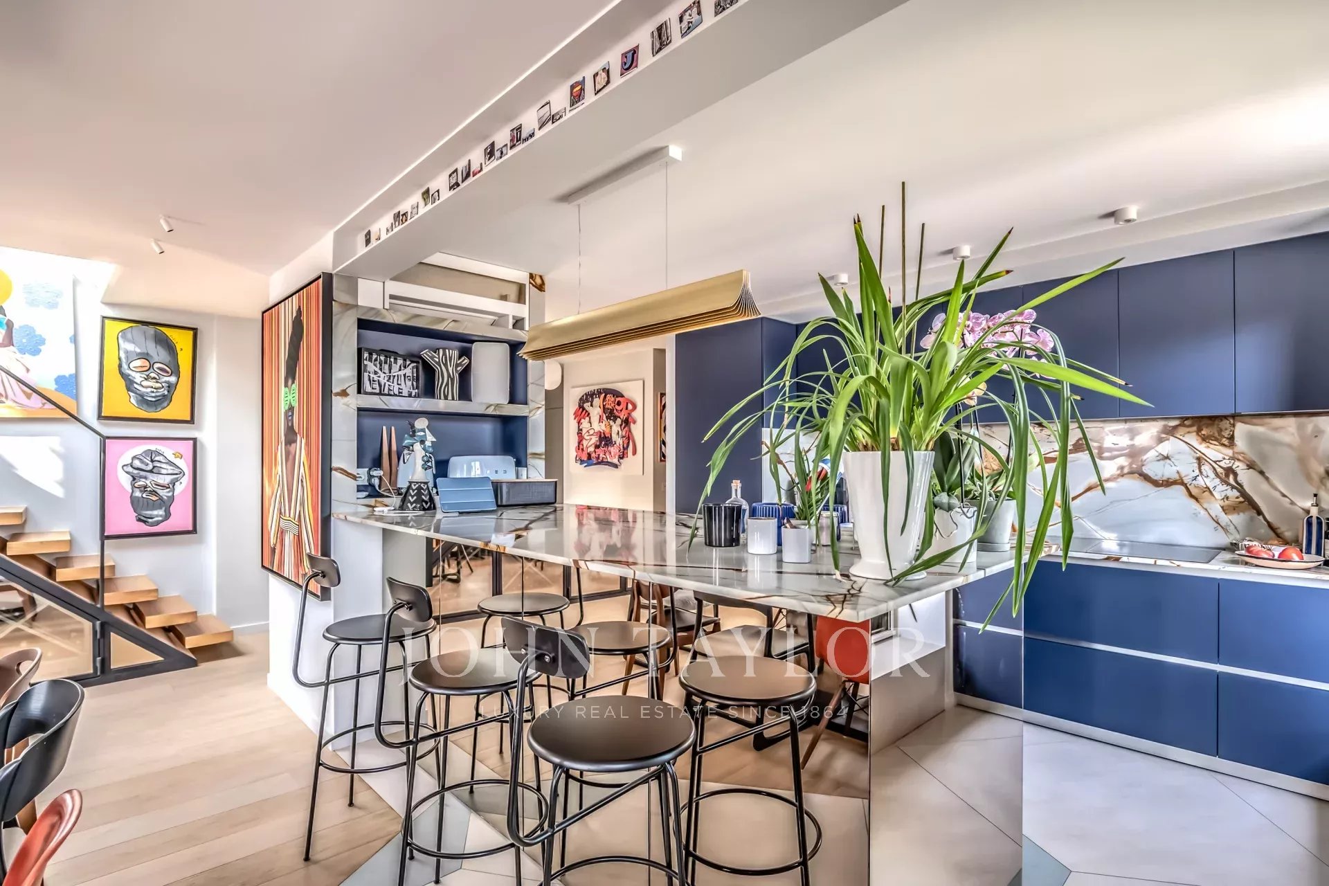 Au cœur des Batignolles, aux derniers étages (7ème et 8ème) par ascenseur d'un immeuble sécurisé récent, nous vous proposons un penthouse unique en duplex de 181.6m2 carrez, plein sud, avec un toit terrasse de 188m2, offrant une vue panoramique sur les toits de Paris et une jolie vue Tour Eiffel.