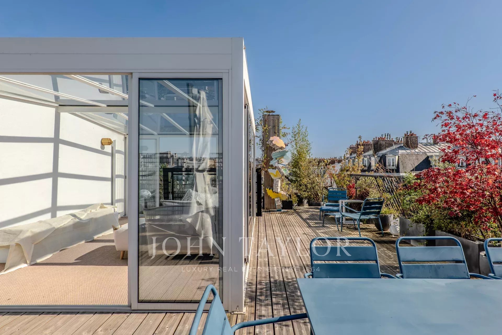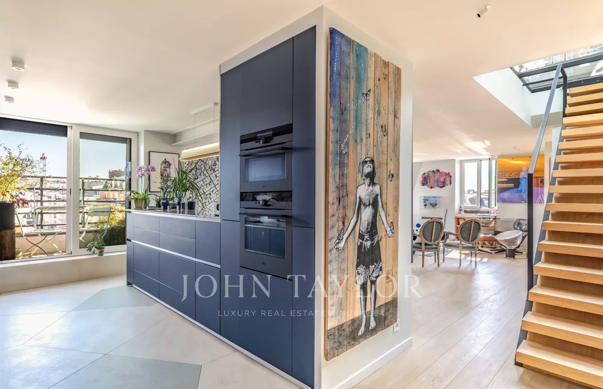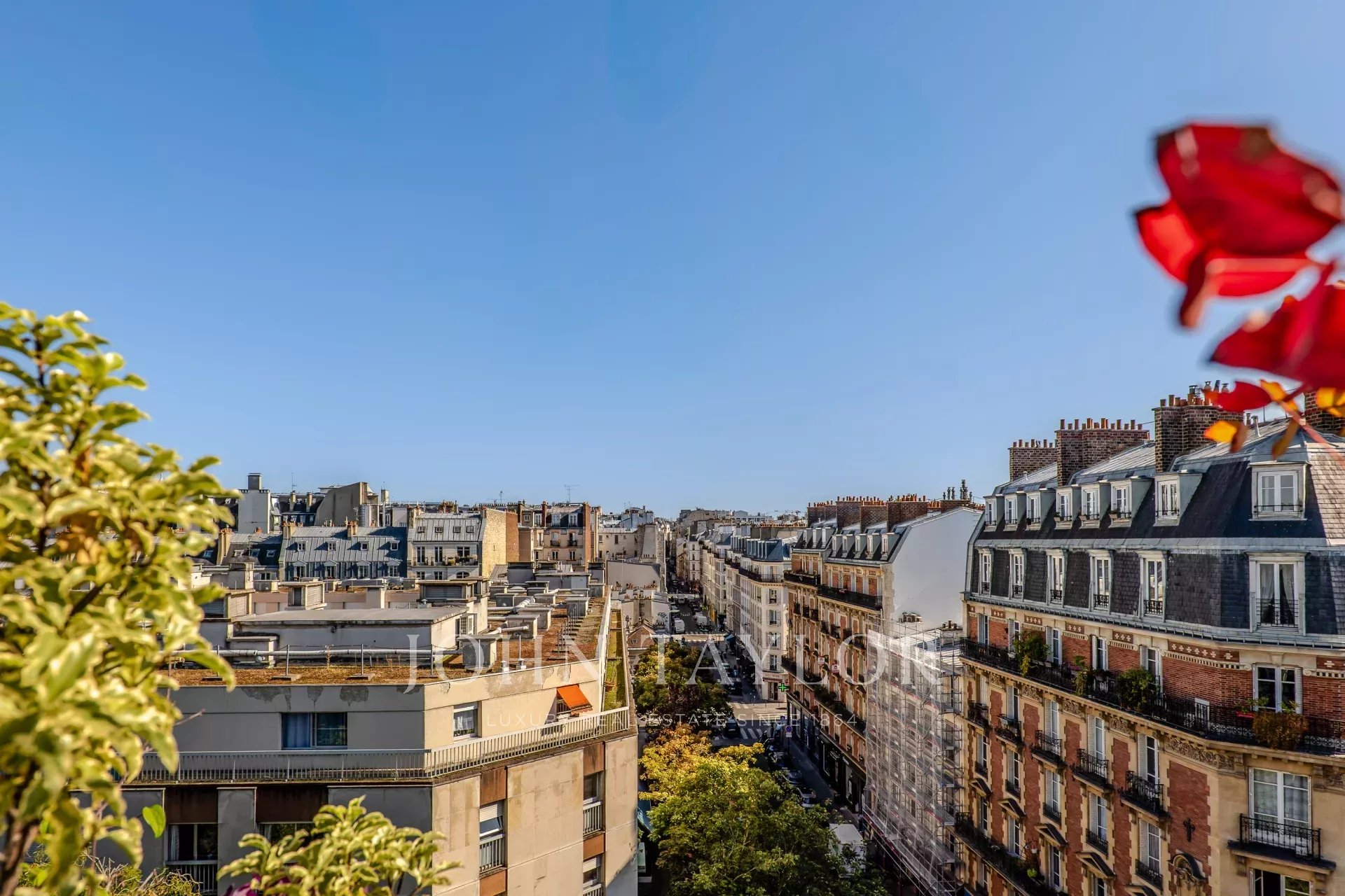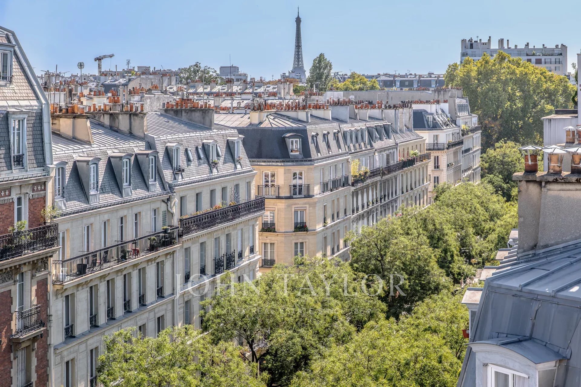 Au cœur des Batignolles, aux derniers étages (7ème et 8ème) par ascenseur d'un immeuble sécurisé récent, nous vous proposons un penthouse unique en duplex de 181.6m2 carrez, plein sud, avec un toit terrasse de 188m2, offrant une vue panoramique sur les toits de Paris et une jolie vue Tour Eiffel.
