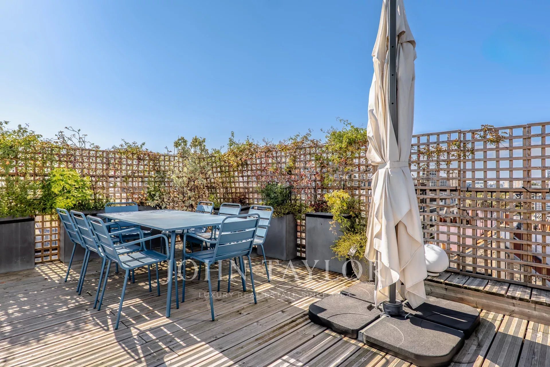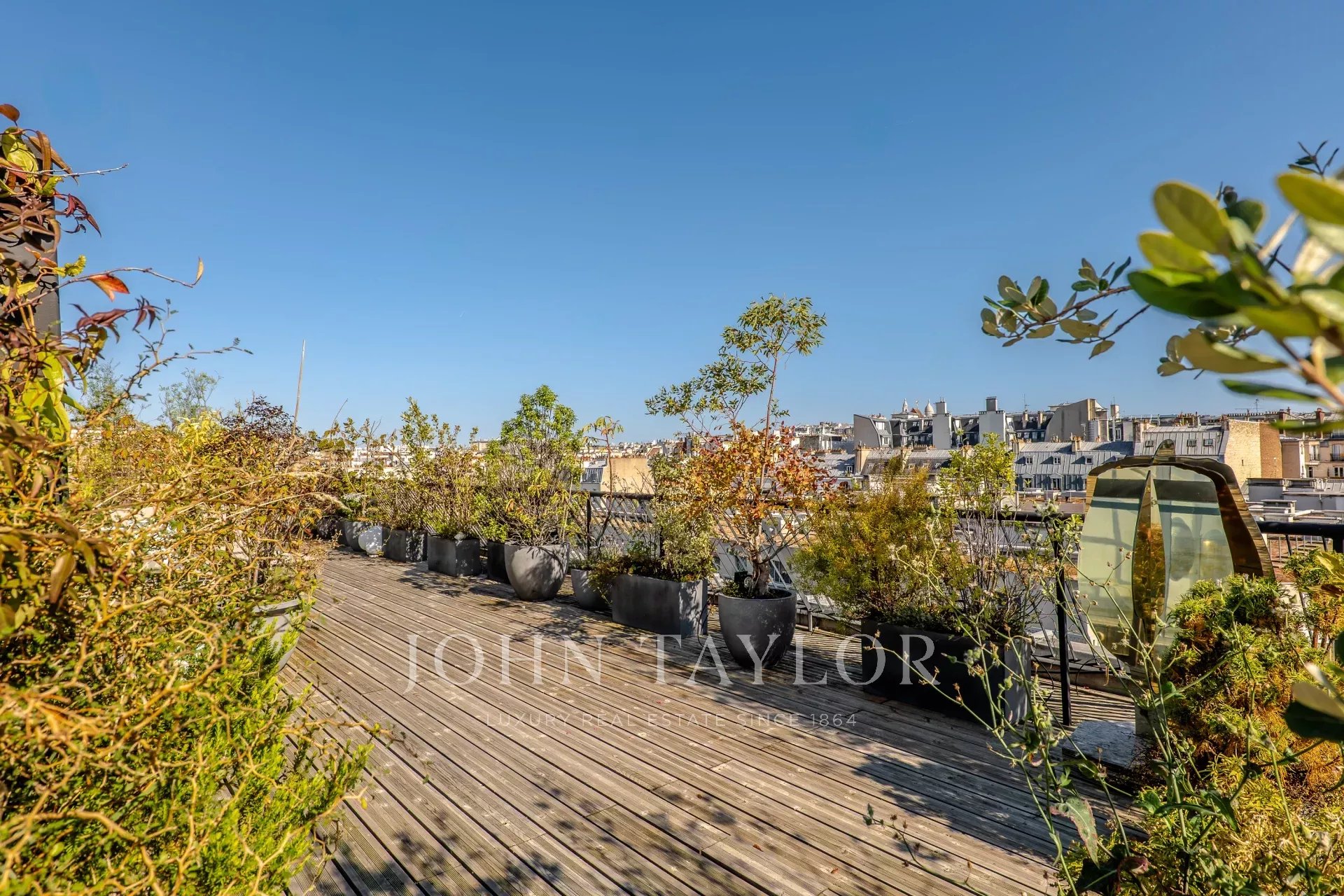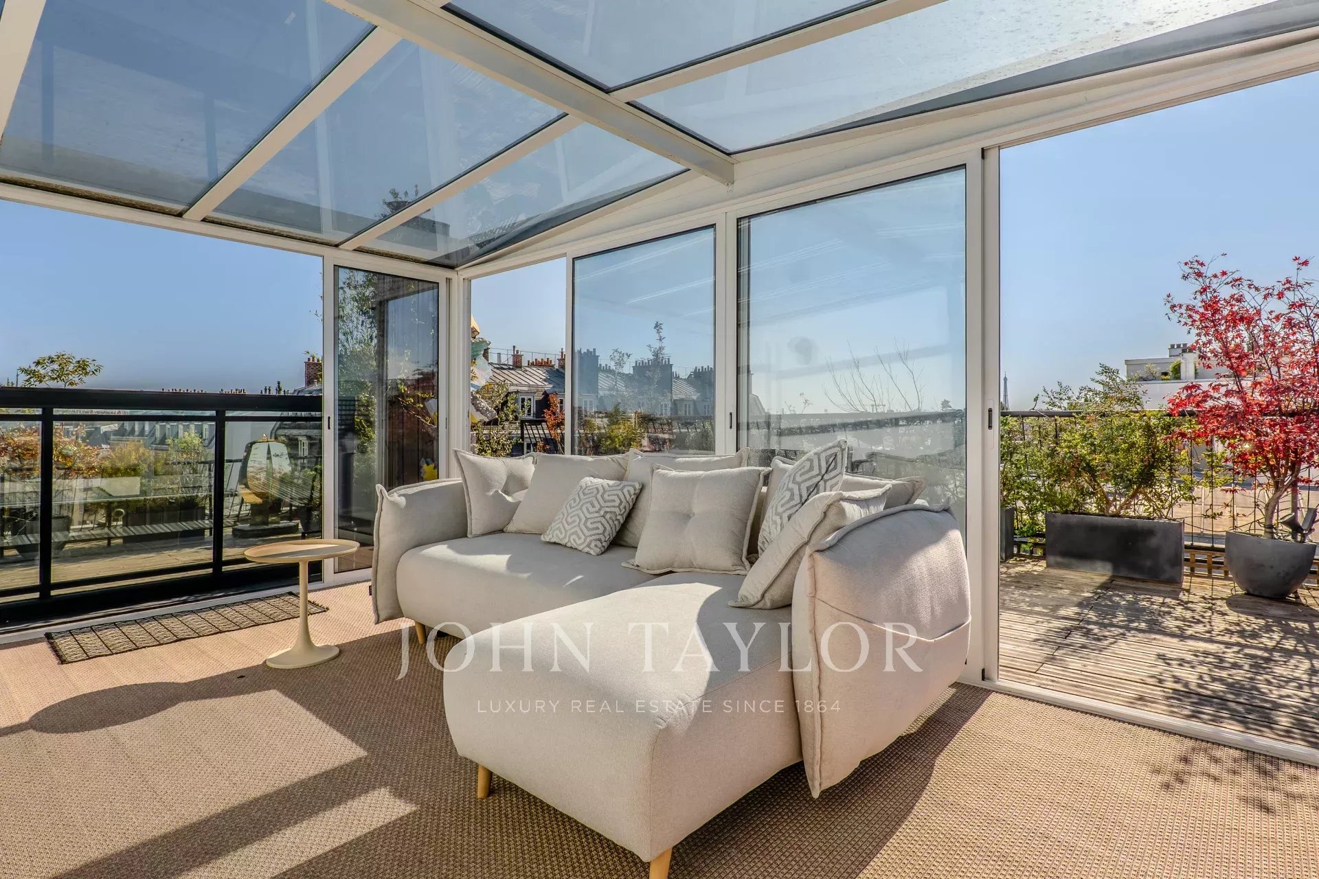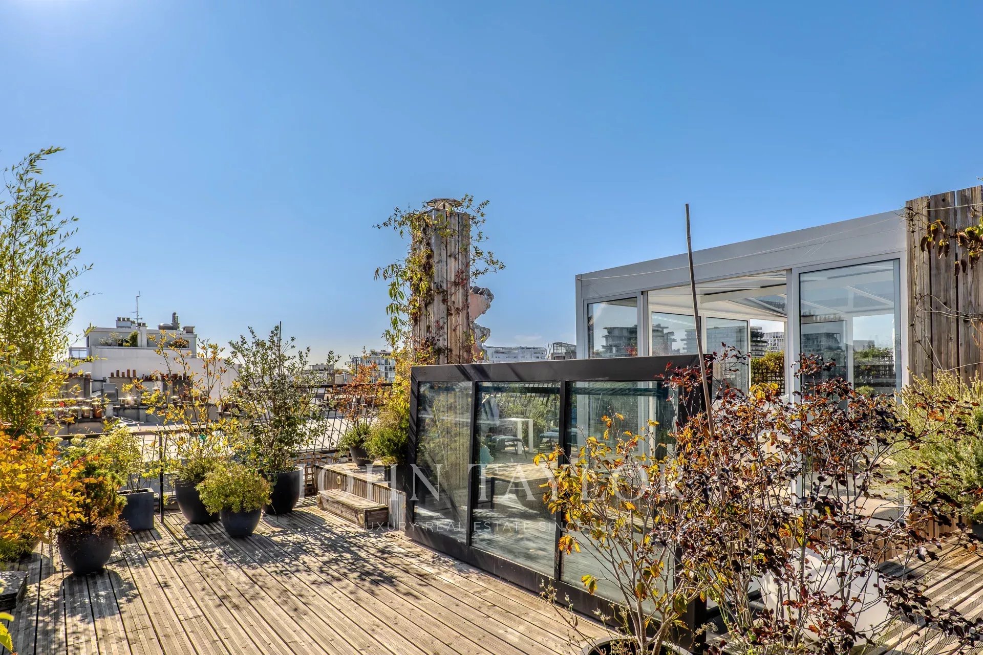 Au cœur des Batignolles, aux derniers étages (7ème et 8ème) par ascenseur d'un immeuble sécurisé récent, nous vous proposons un penthouse unique en duplex de 181.6m2 carrez, plein sud, avec un toit terrasse de 188m2, offrant une vue panoramique sur les toits de Paris et une jolie vue Tour Eiffel.