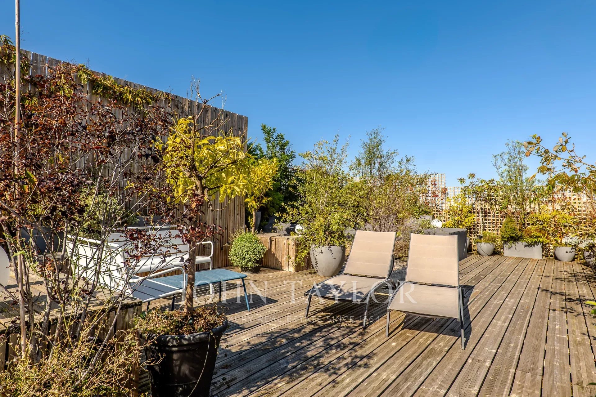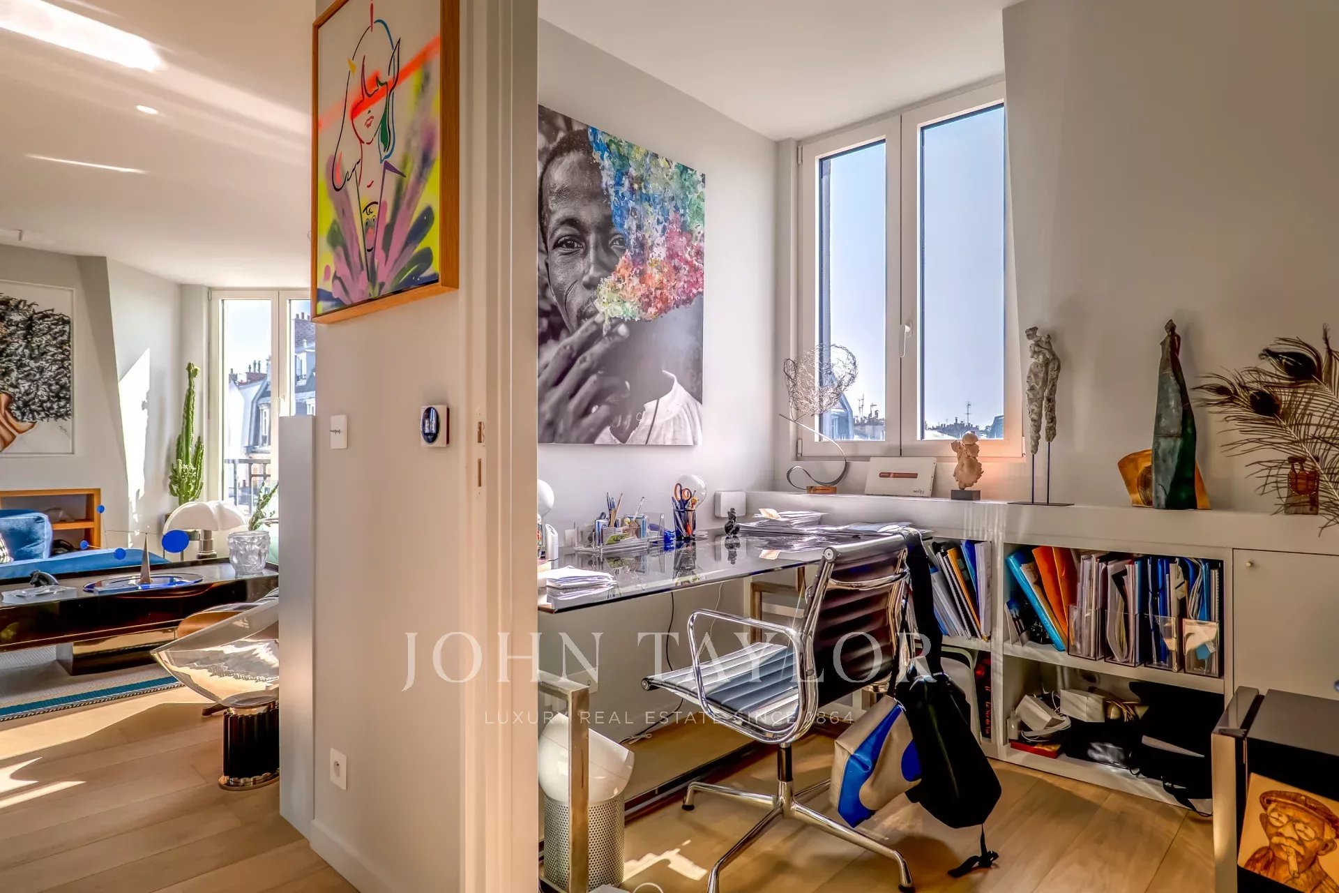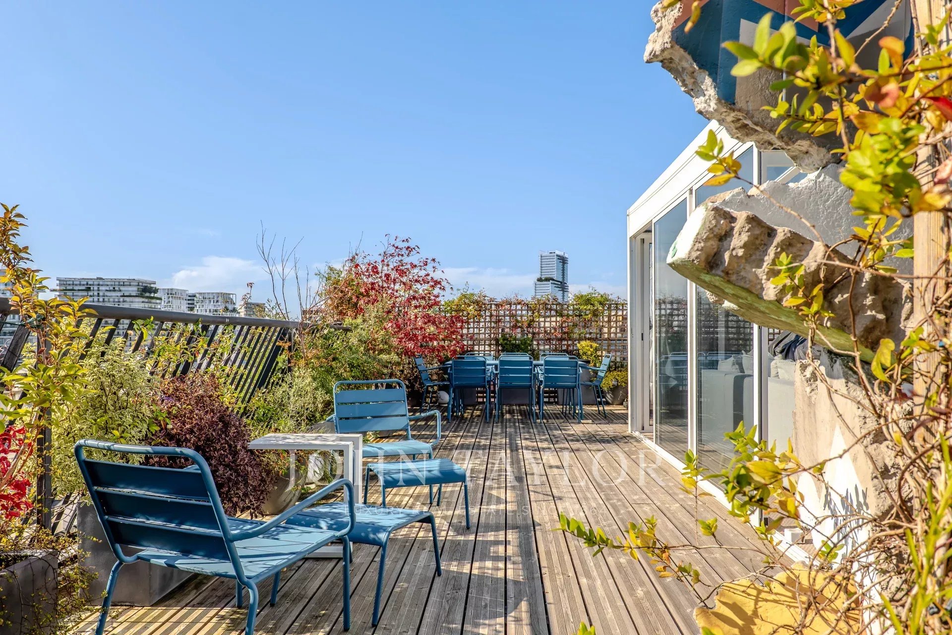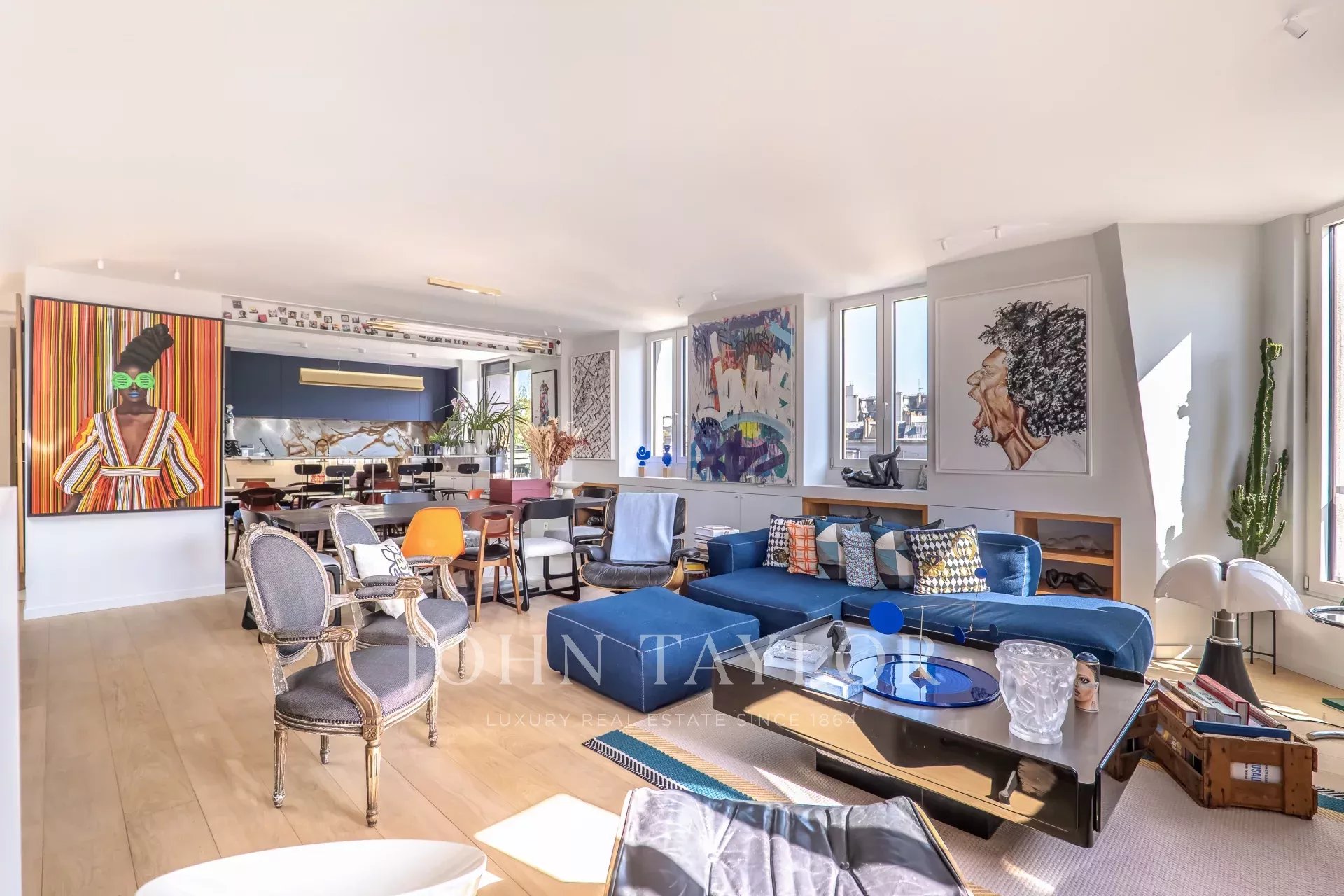 Au cœur des Batignolles, aux derniers étages (7ème et 8ème) par ascenseur d'un immeuble sécurisé récent, nous vous proposons un penthouse unique en duplex de 181.6m2 carrez, plein sud, avec un toit terrasse de 188m2, offrant une vue panoramique sur les toits de Paris et une jolie vue Tour Eiffel.