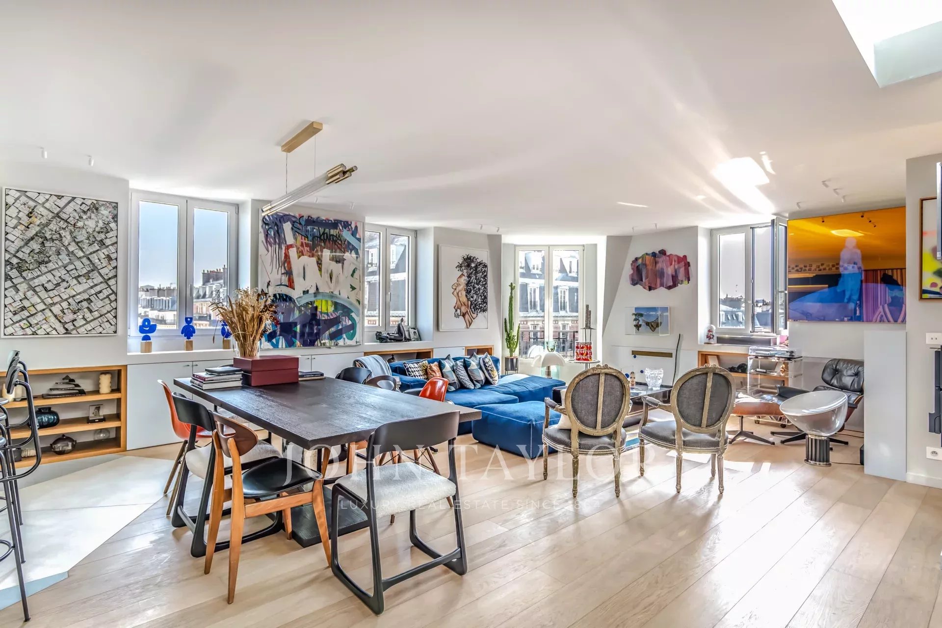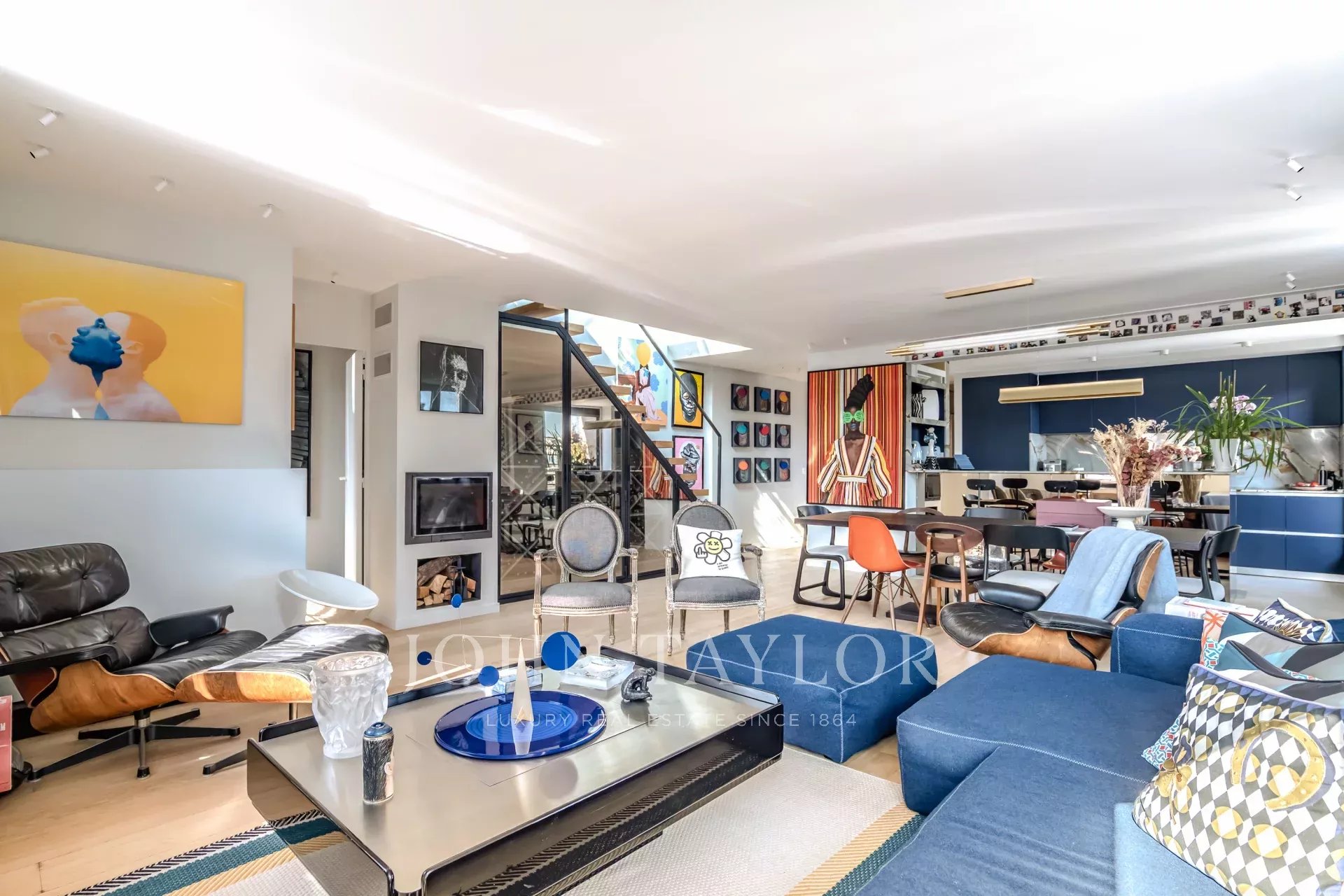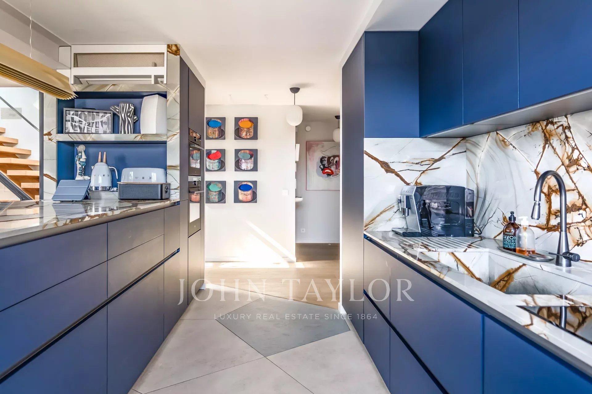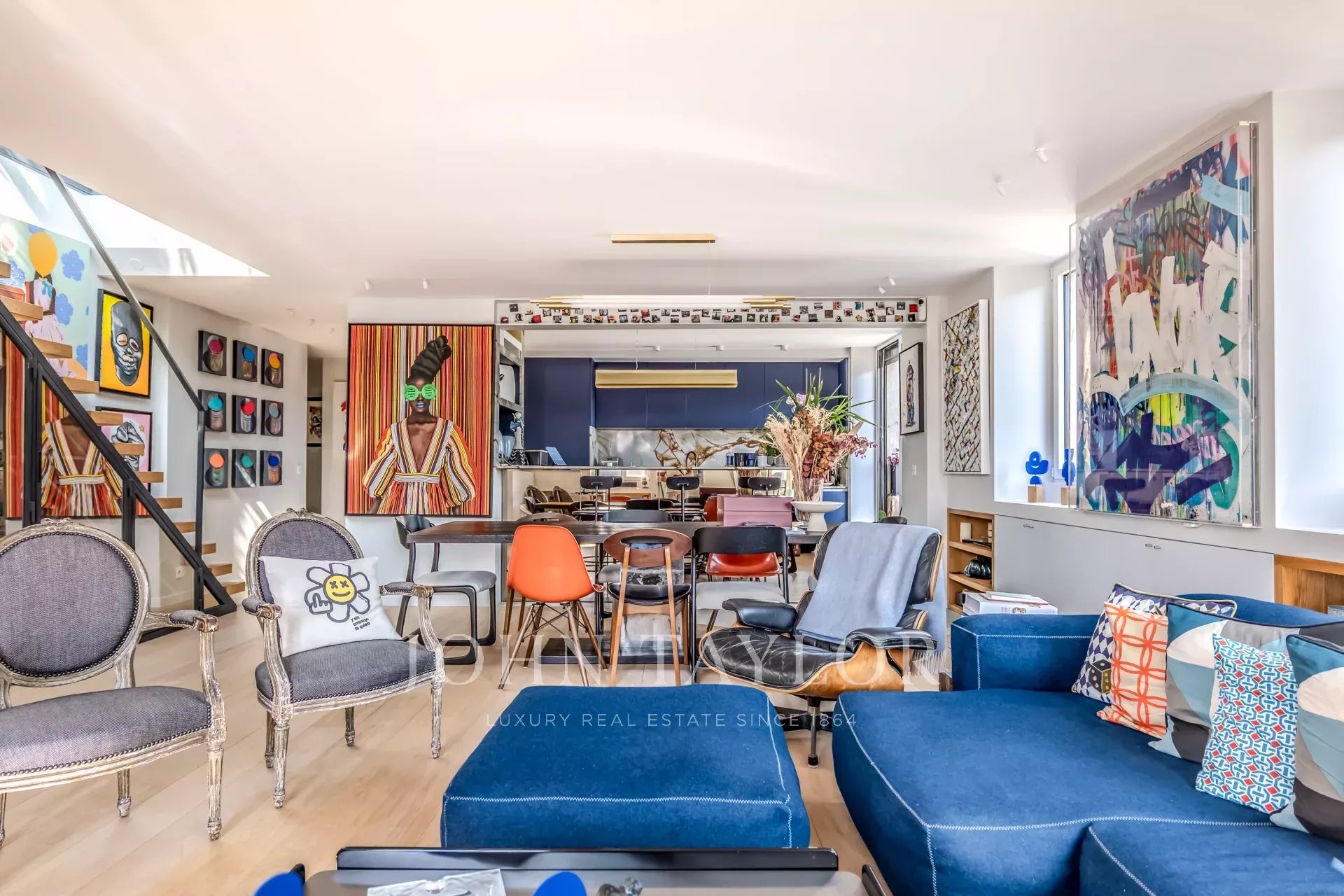 Au cœur des Batignolles, aux derniers étages (7ème et 8ème) par ascenseur d'un immeuble sécurisé récent, nous vous proposons un penthouse unique en duplex de 181.6m2 carrez, plein sud, avec un toit terrasse de 188m2, offrant une vue panoramique sur les toits de Paris et une jolie vue Tour Eiffel.