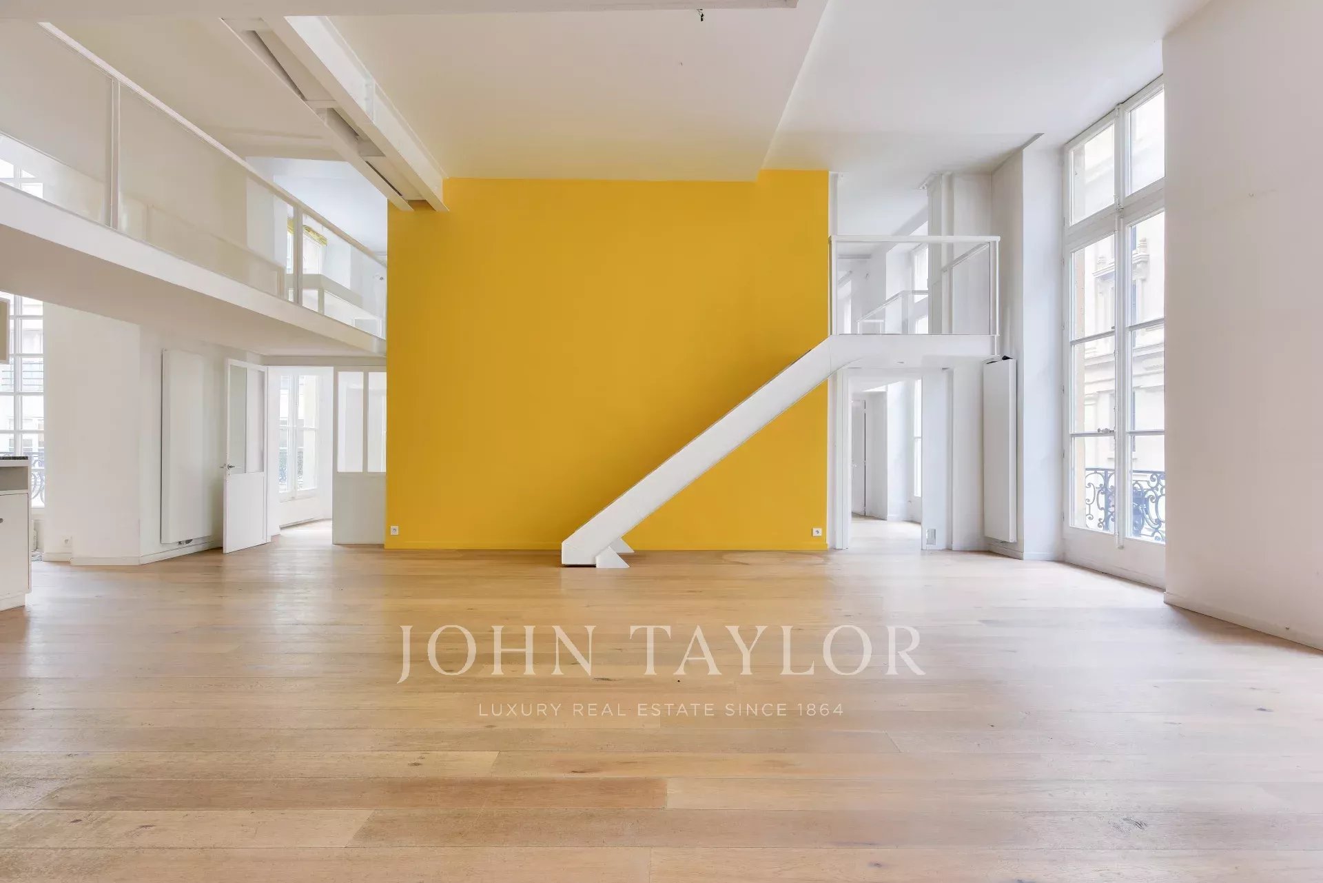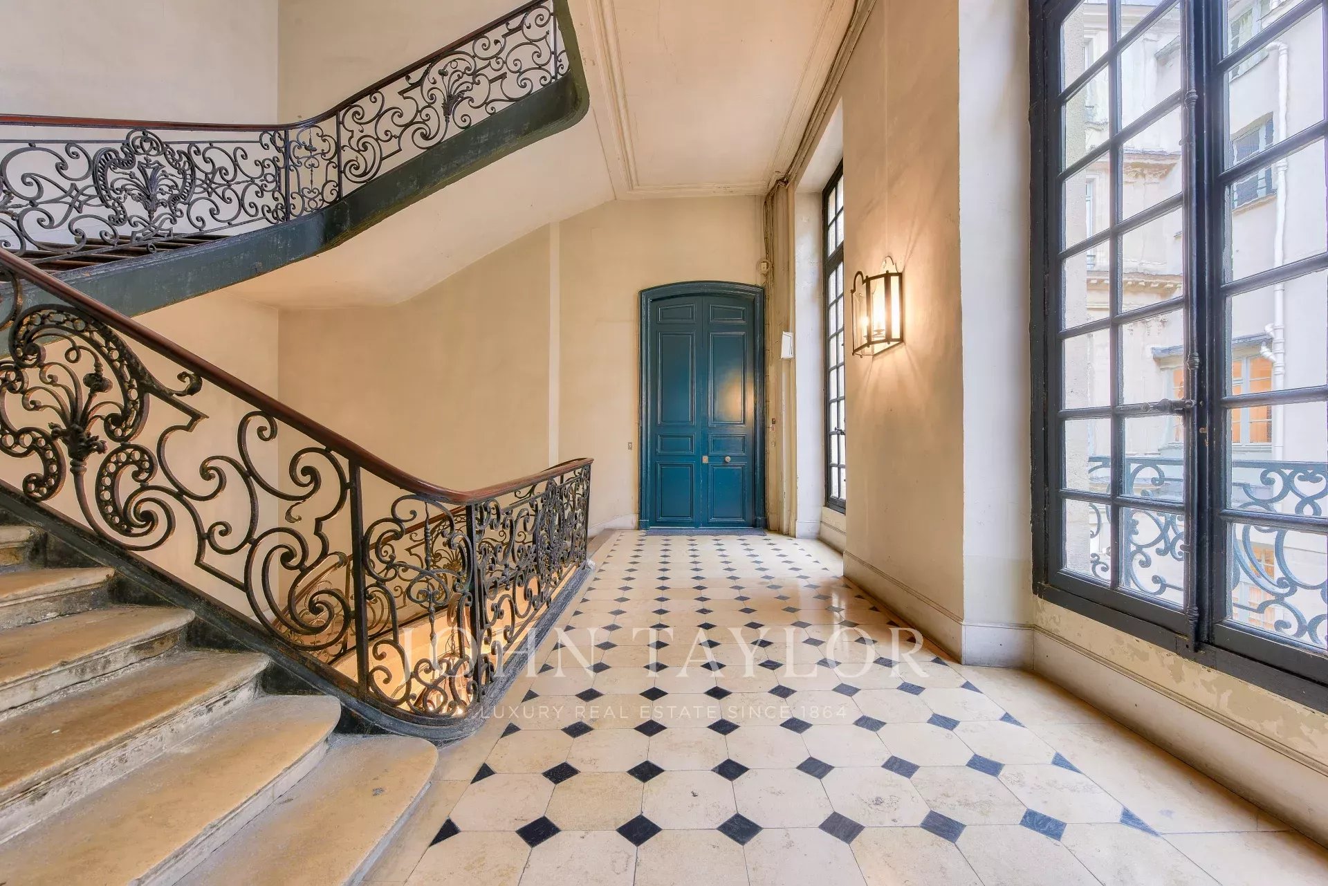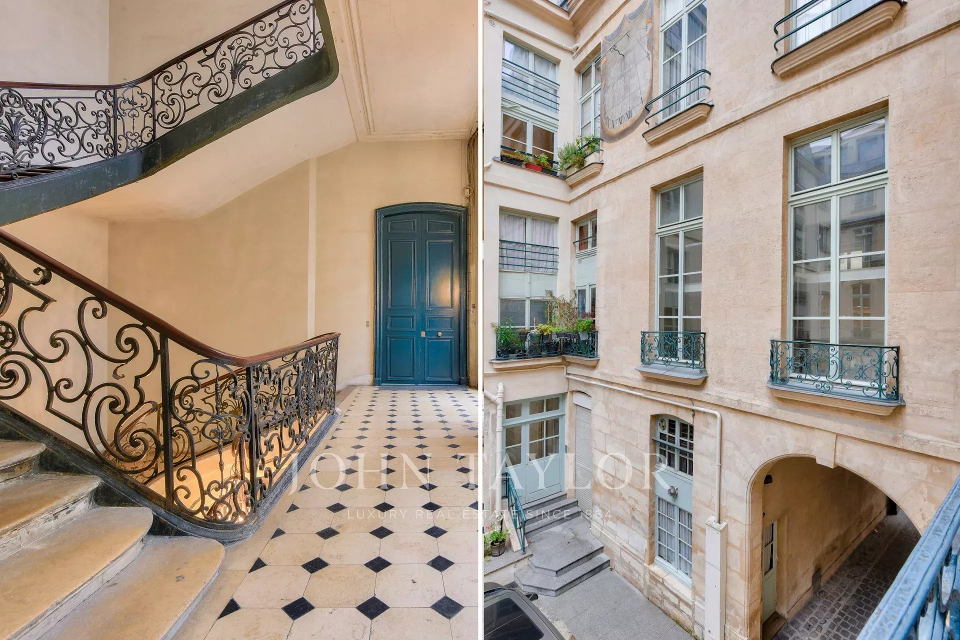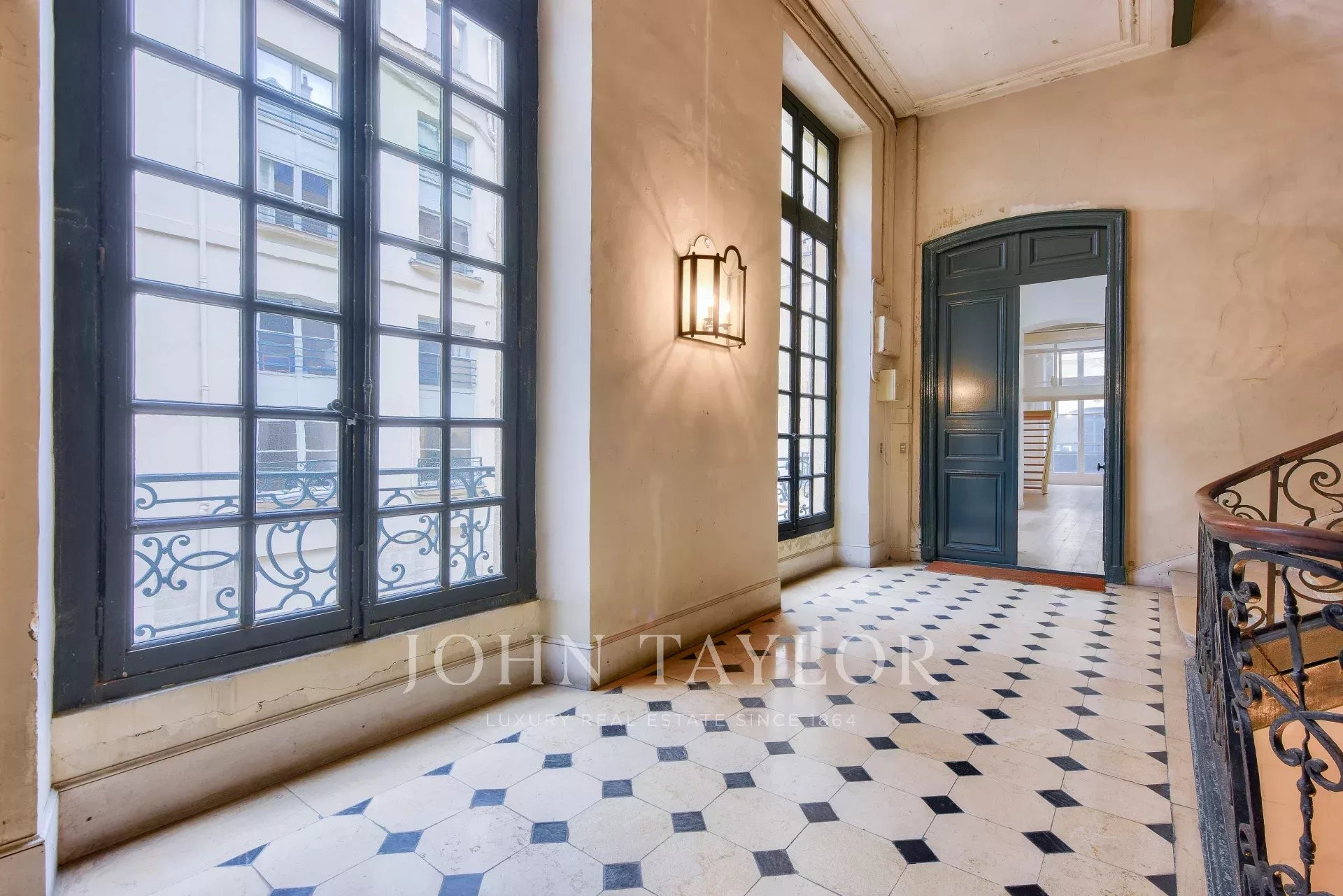 À deux pas de la place des Victoires et de la fondation Pinault, à l’étage noble d’un hôtel particulier du XVIIe siècle avec escalier classé, un appartement traversant, baigné de lumière, aux volumes impressionnants, d'une superficie de 233,03 m² Carrez.