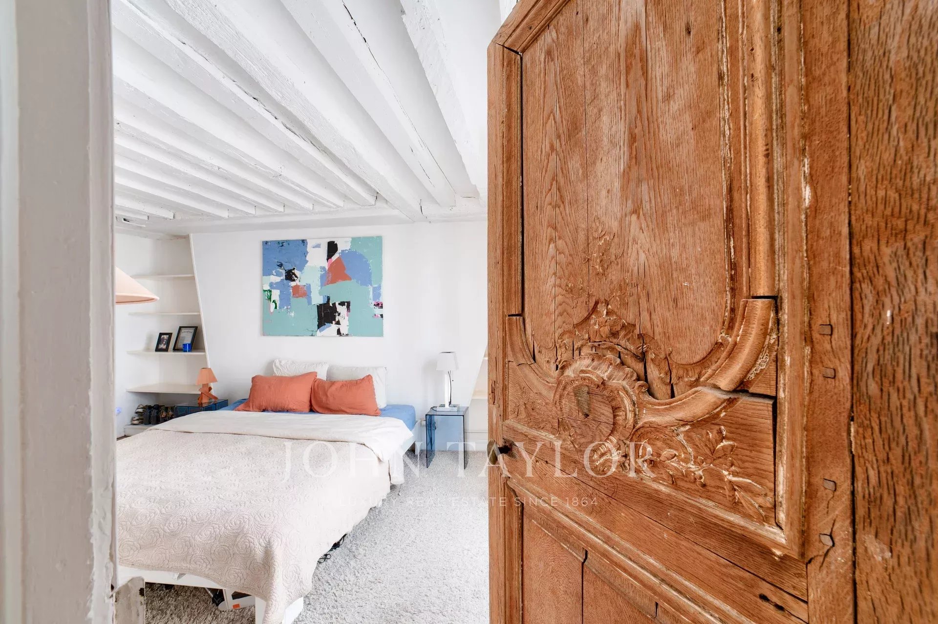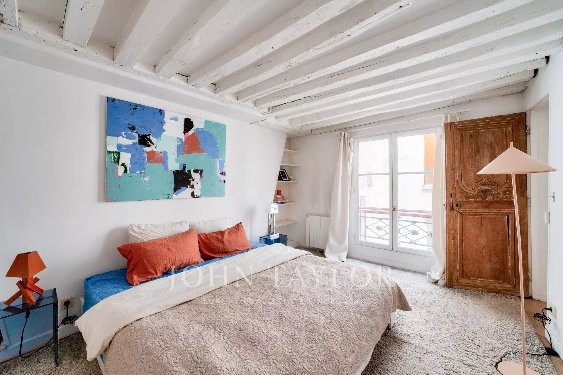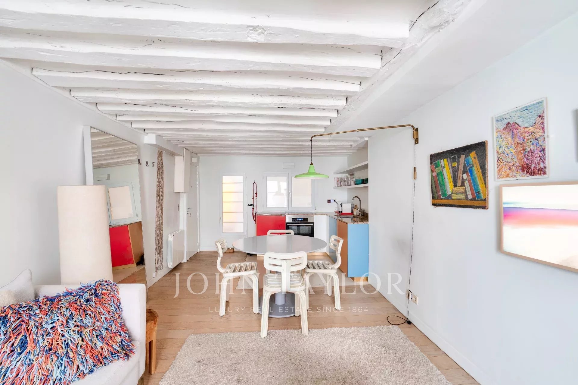 Parquet, poutres apparentes et tommettes d'époque dans les parties communes, ce bien a conservé tous les codes architecturaux du Marais. Idéal pied-à-terre ou investissement locatif.