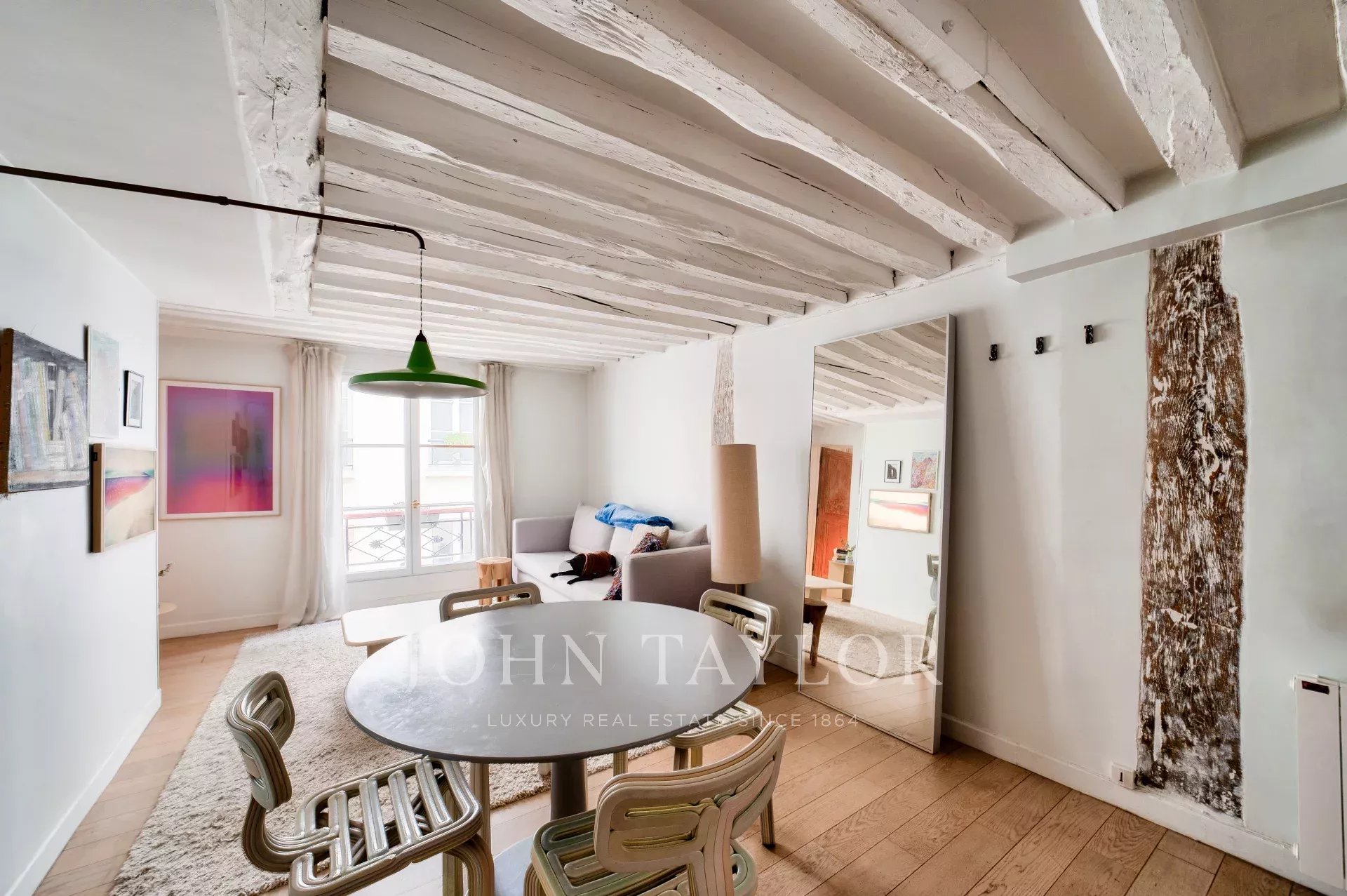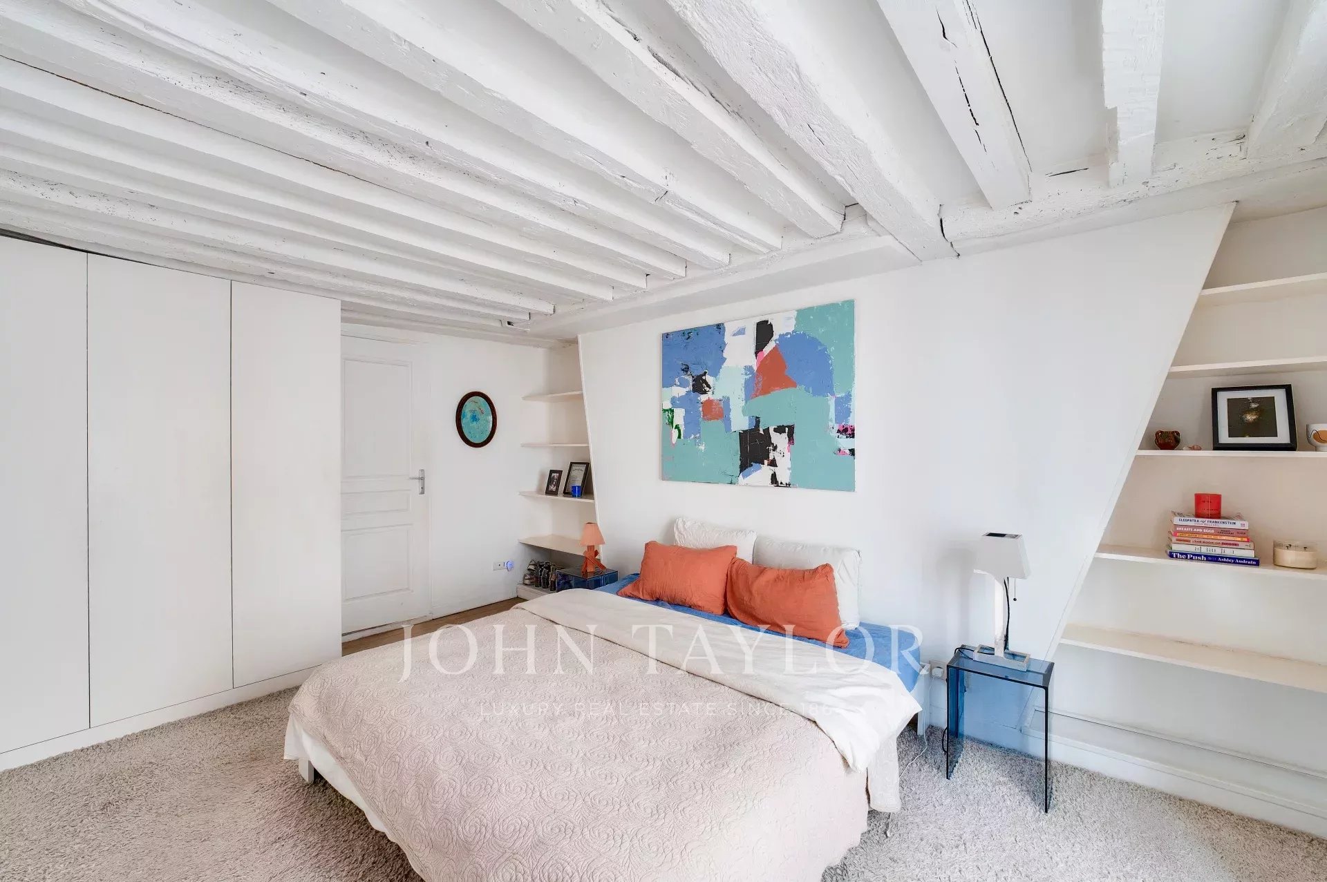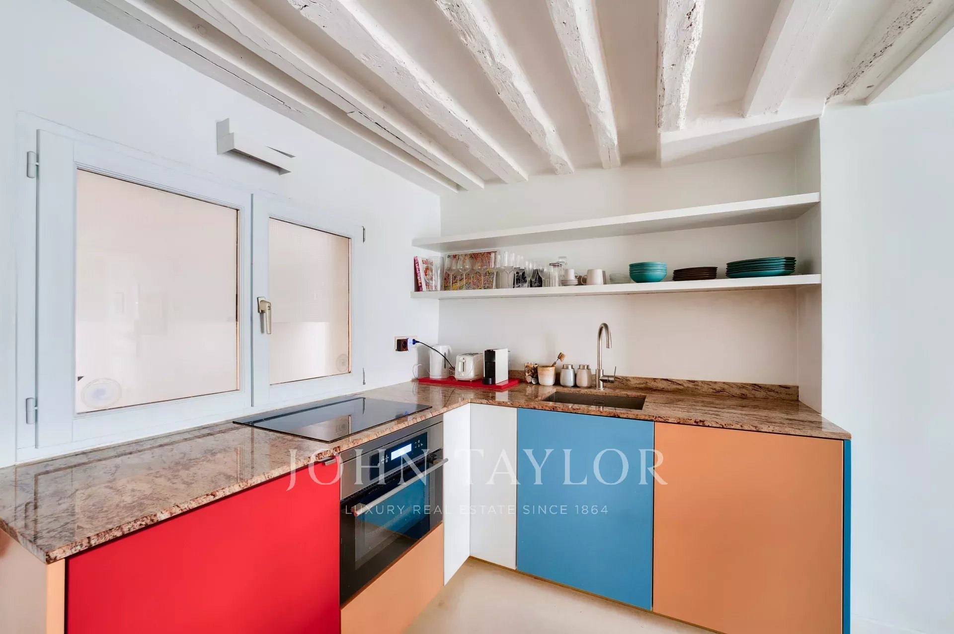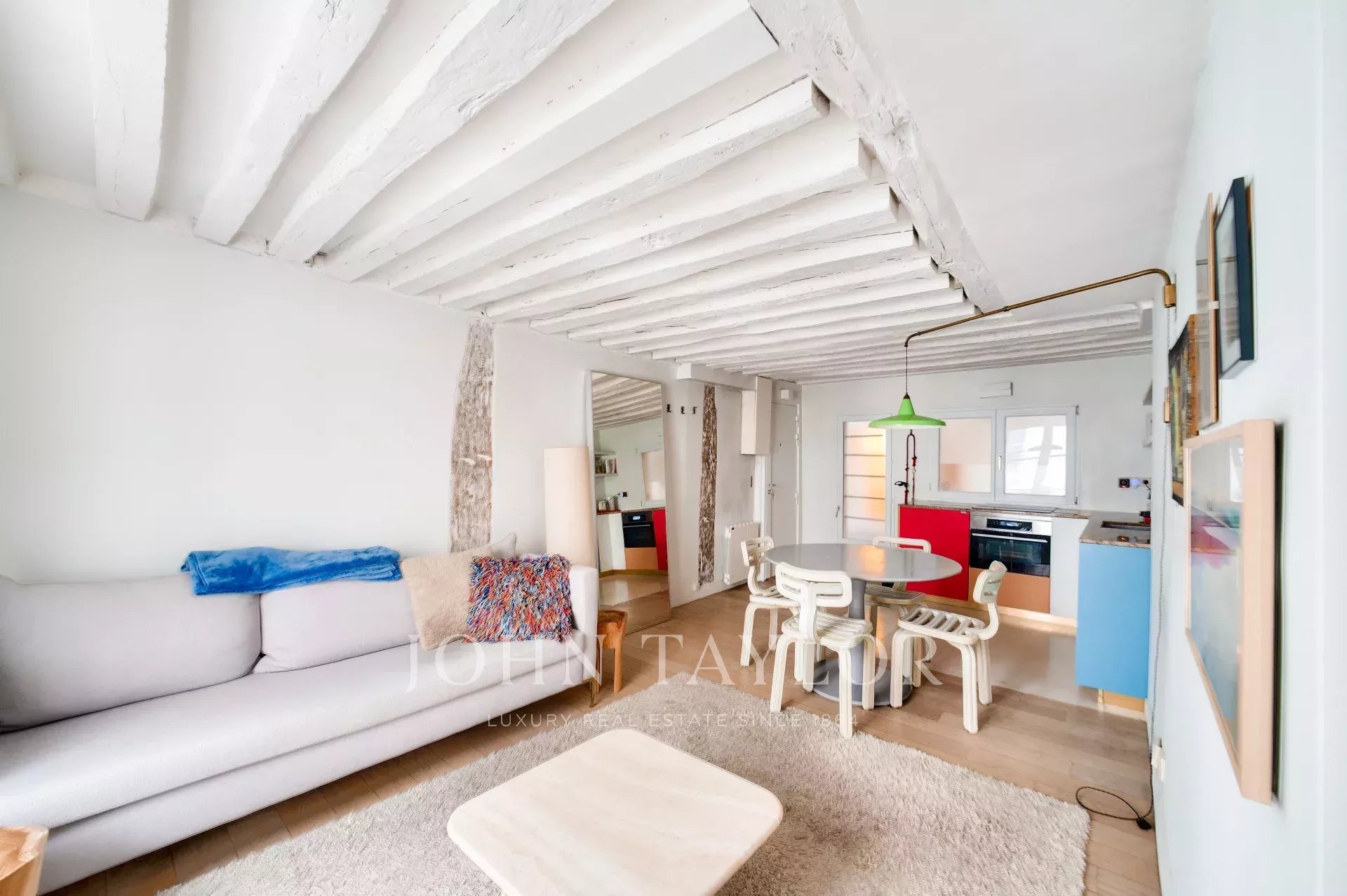 Parquet, poutres apparentes et tommettes d'époque dans les parties communes, ce bien a conservé tous les codes architecturaux du Marais. Idéal pied-à-terre ou investissement locatif.