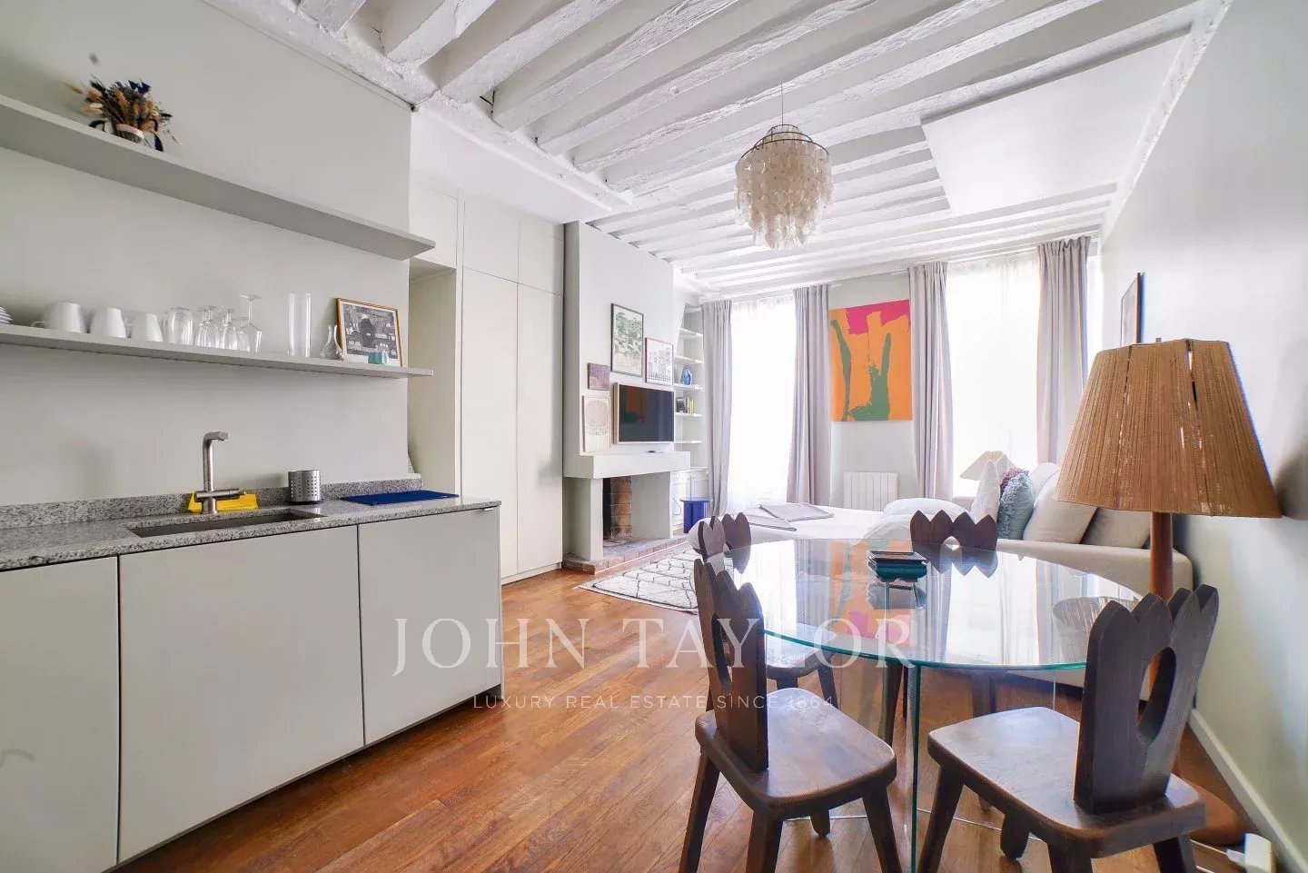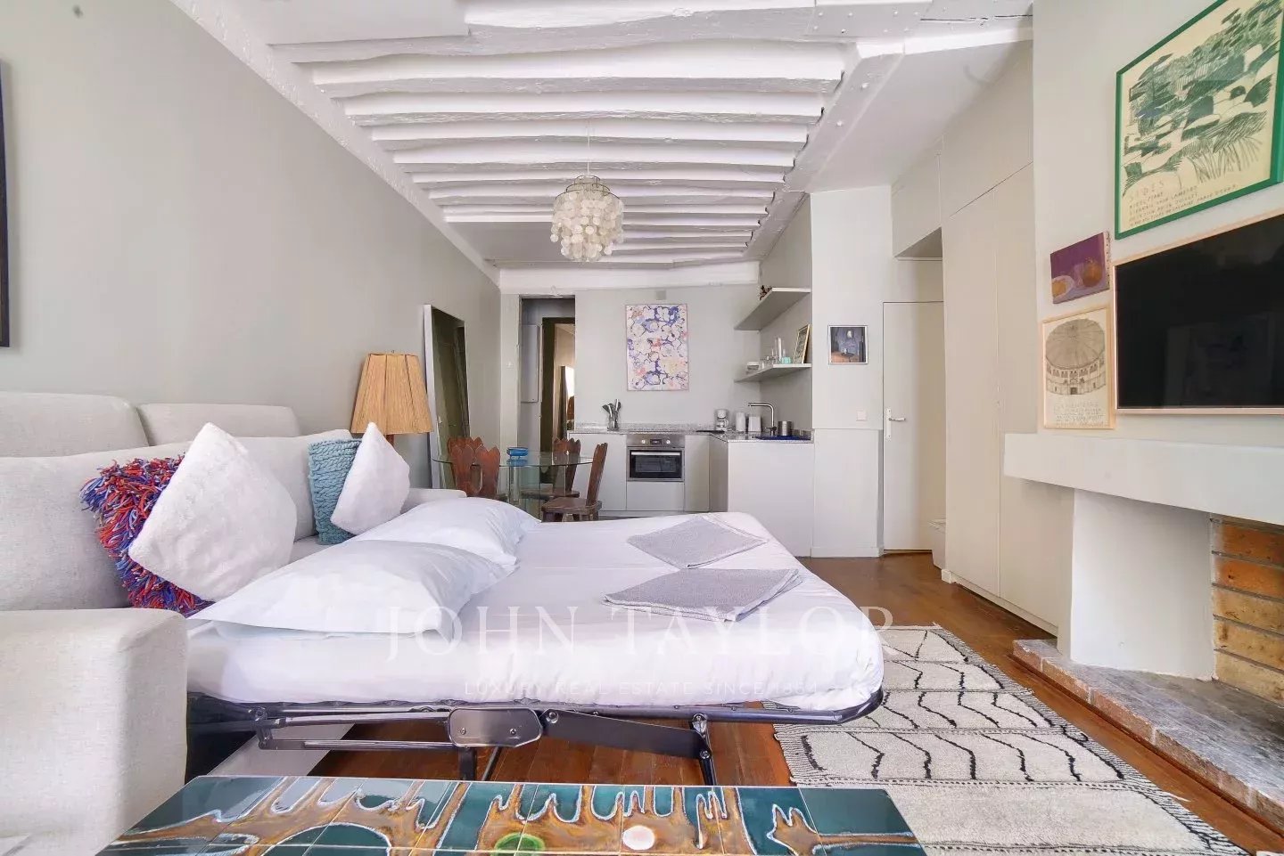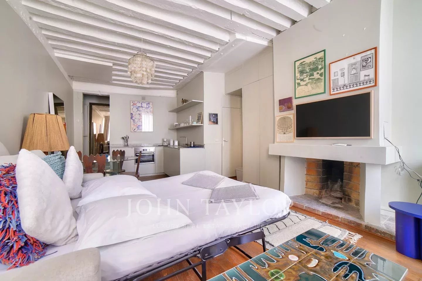 Sa rénovation soignée a su mettre en valeur tous les éléments caractéristiques du Marais, à savoir la belle hauteur sous plafond, la grand cheminée d'époque, les hautes fenêtres ainsi que les poutres apparente pour faire de ce studio le pied-à-terre ou l'investissement locatif idéal.