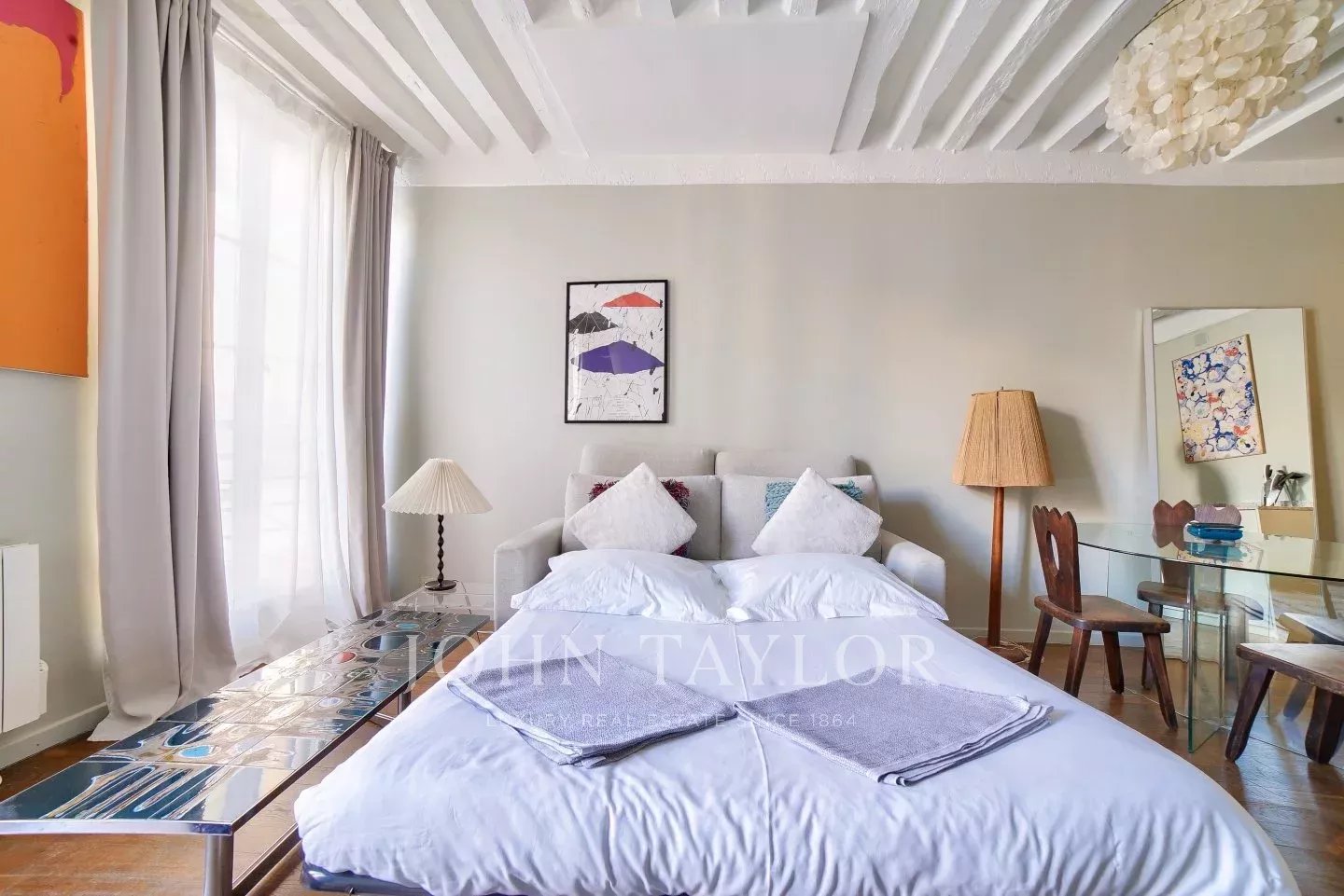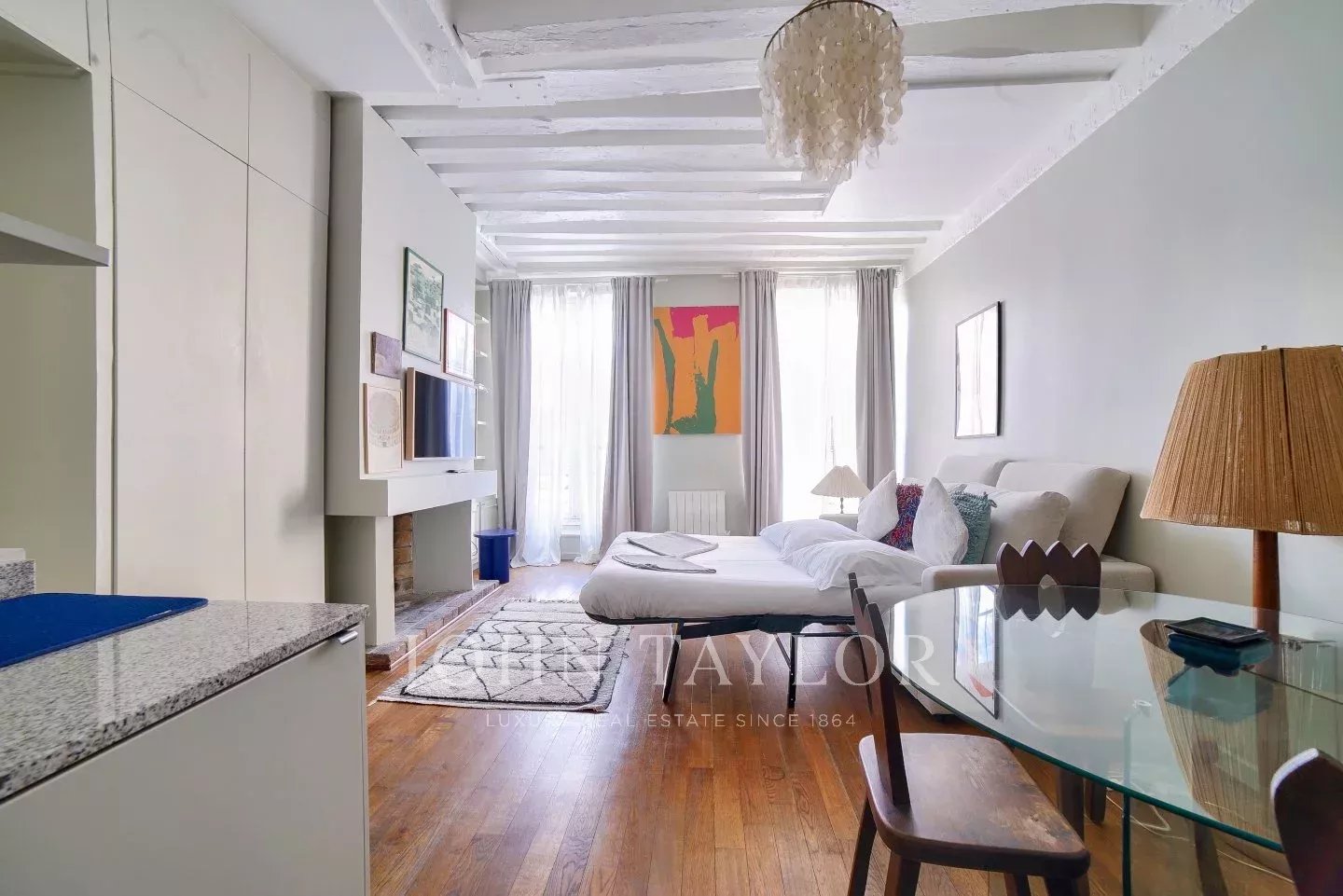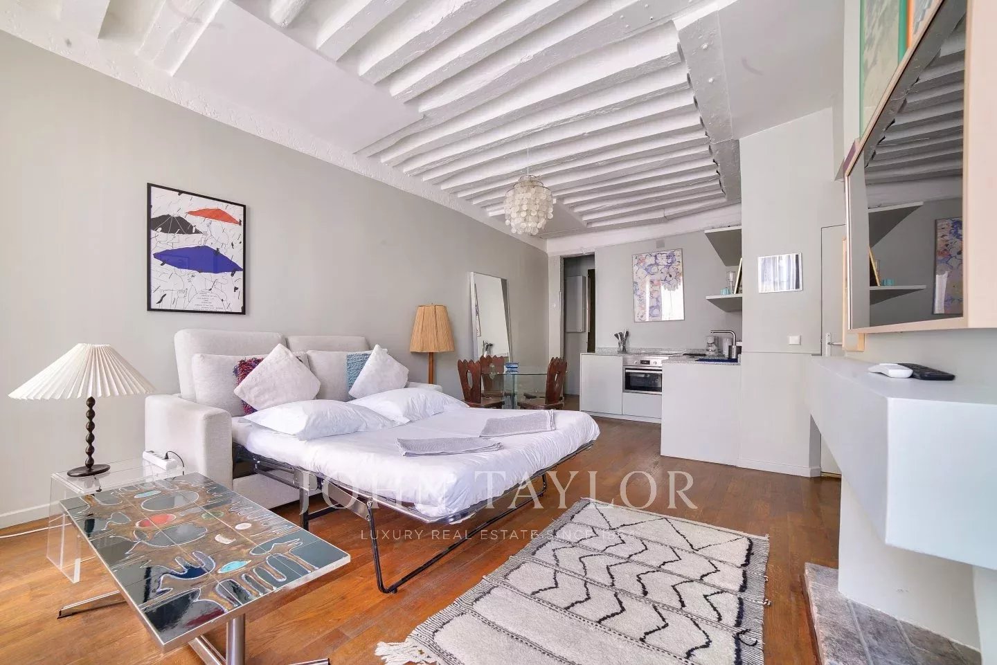 Sa rénovation soignée a su mettre en valeur tous les éléments caractéristiques du Marais, à savoir la belle hauteur sous plafond, la grand cheminée d'époque, les hautes fenêtres ainsi que les poutres apparente pour faire de ce studio le pied-à-terre ou l'investissement locatif idéal.