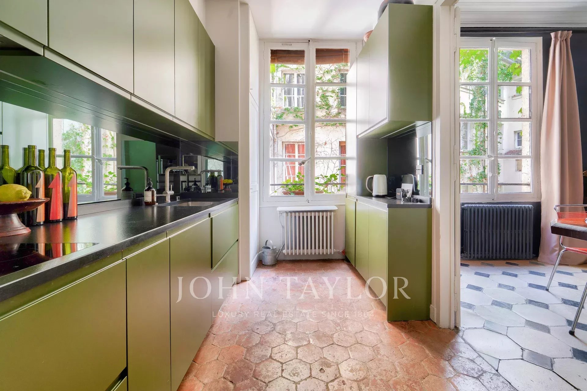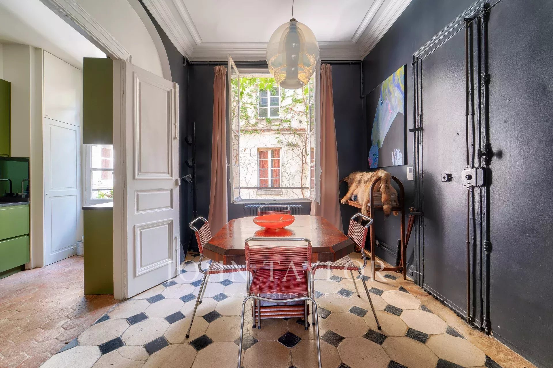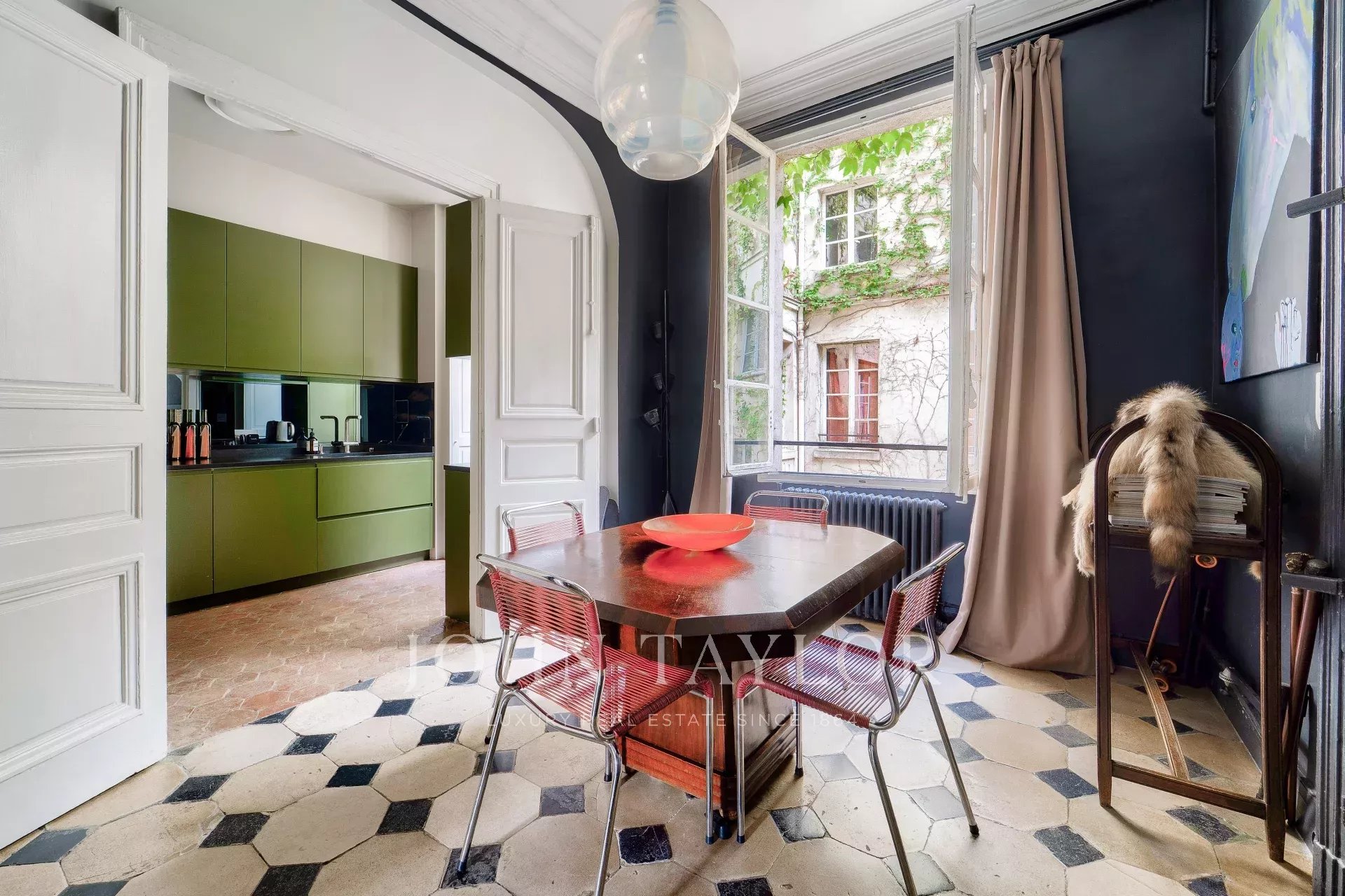 3.5m de hauteur sous plafond, parquet de Versailles, tomettes, pierre de Bourgogne, boiseries, moulures, volets intérieurs, cheminée d’époque, etc. Chaque détail évoque l’élégance d’un intérieur parisien classique.