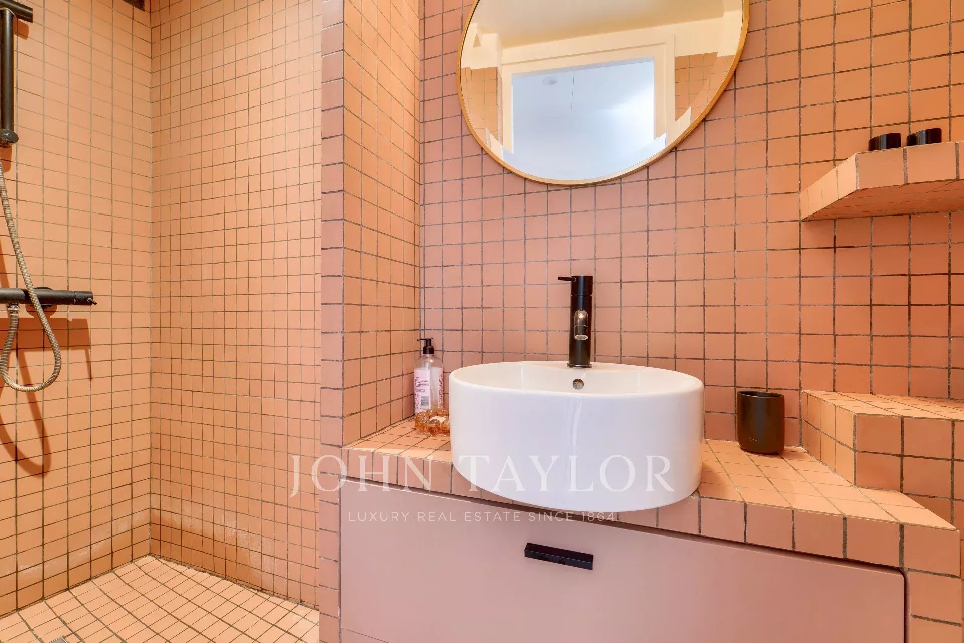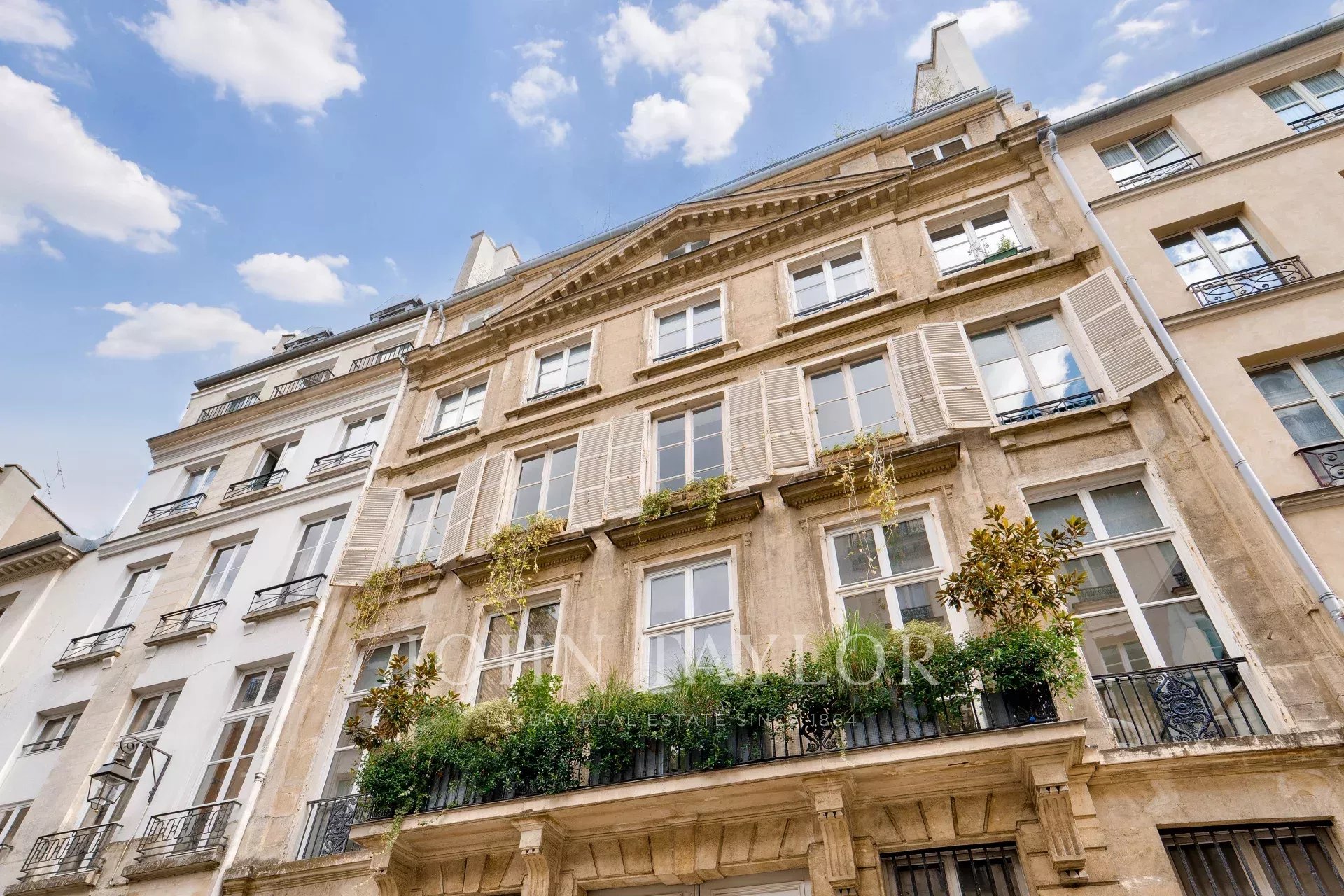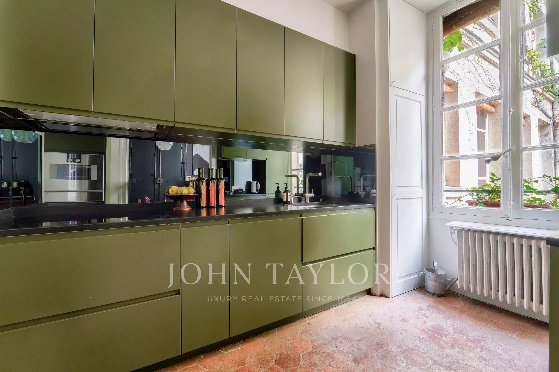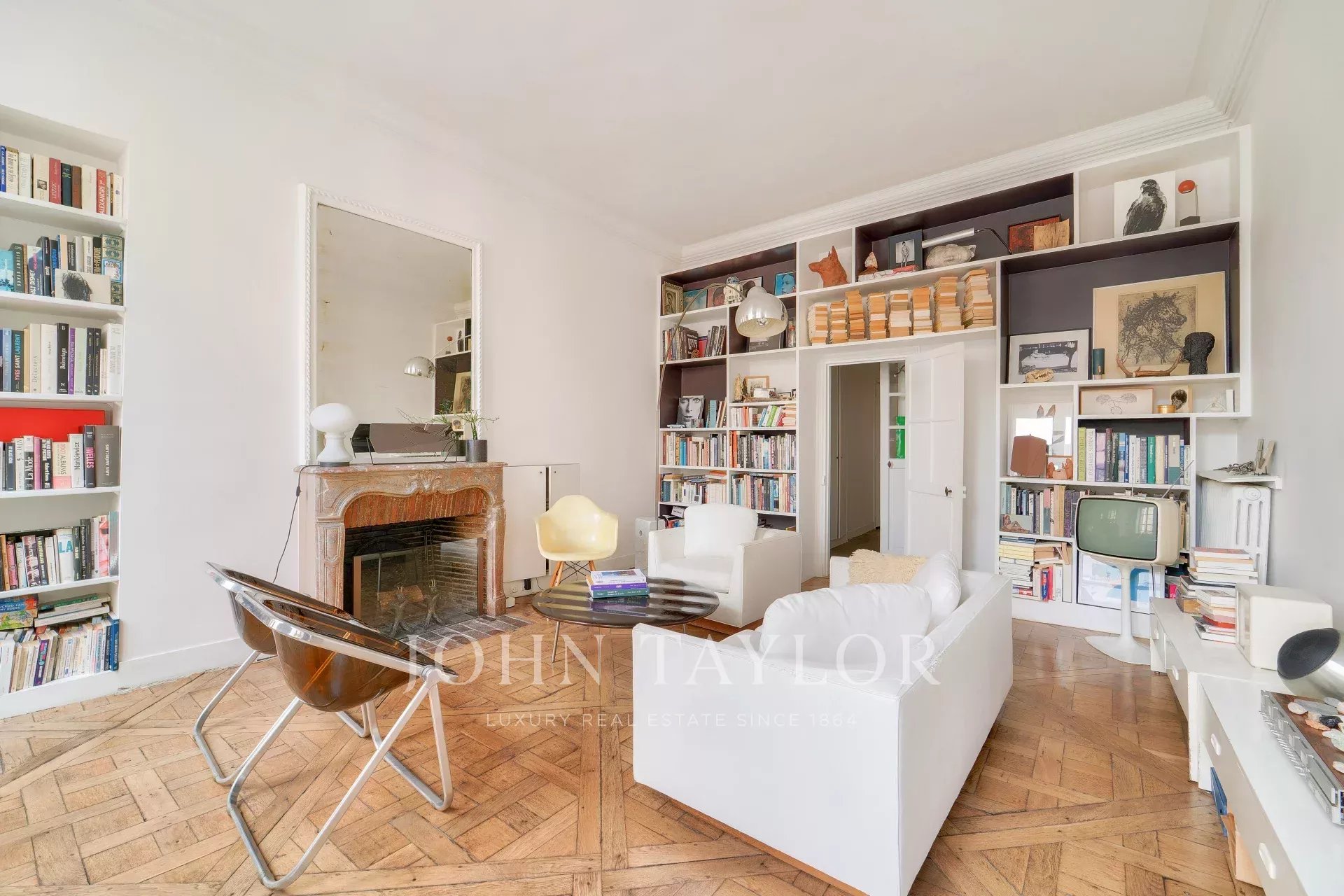 3.5m de hauteur sous plafond, parquet de Versailles, tomettes, pierre de Bourgogne, boiseries, moulures, volets intérieurs, cheminée d’époque, etc. Chaque détail évoque l’élégance d’un intérieur parisien classique.