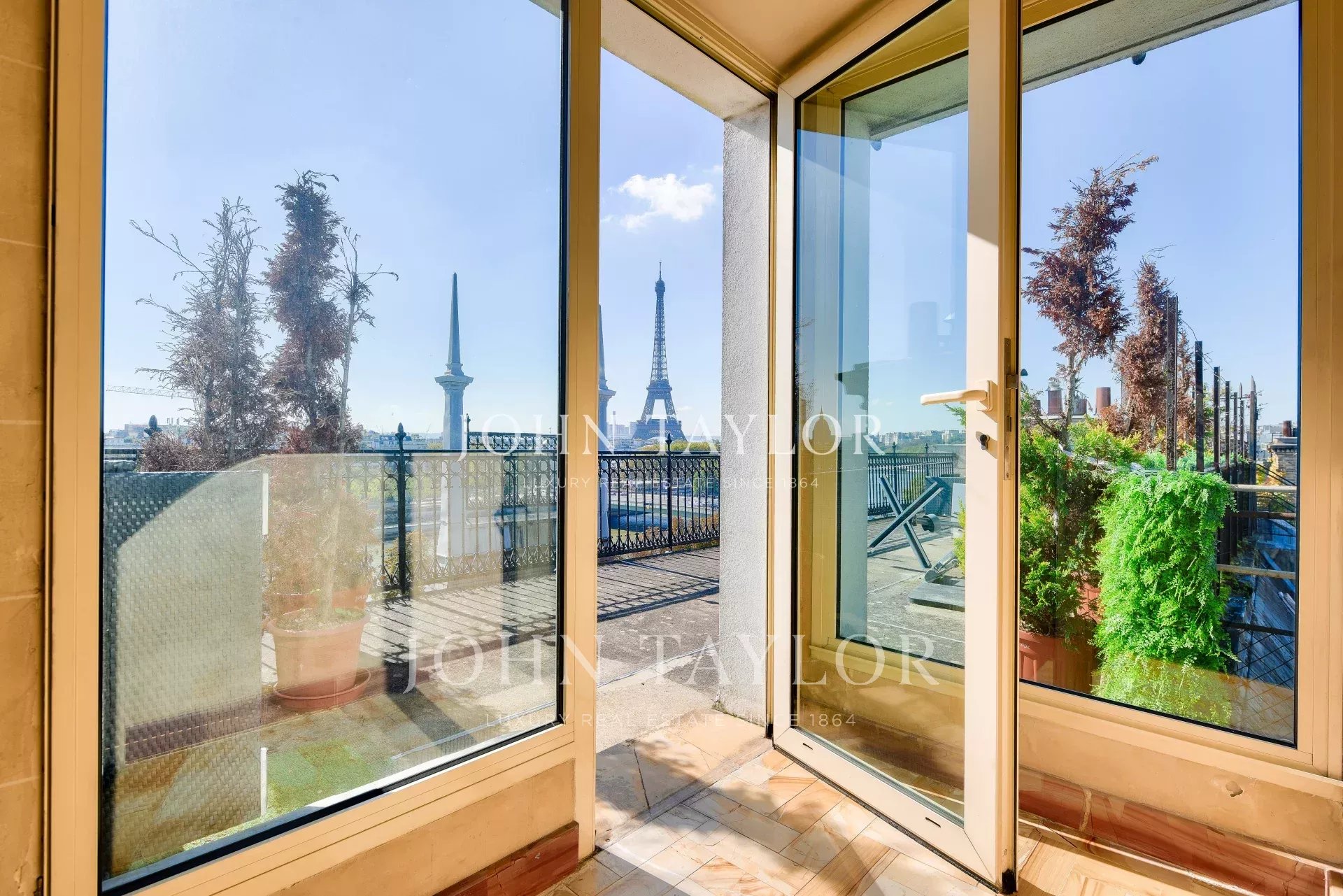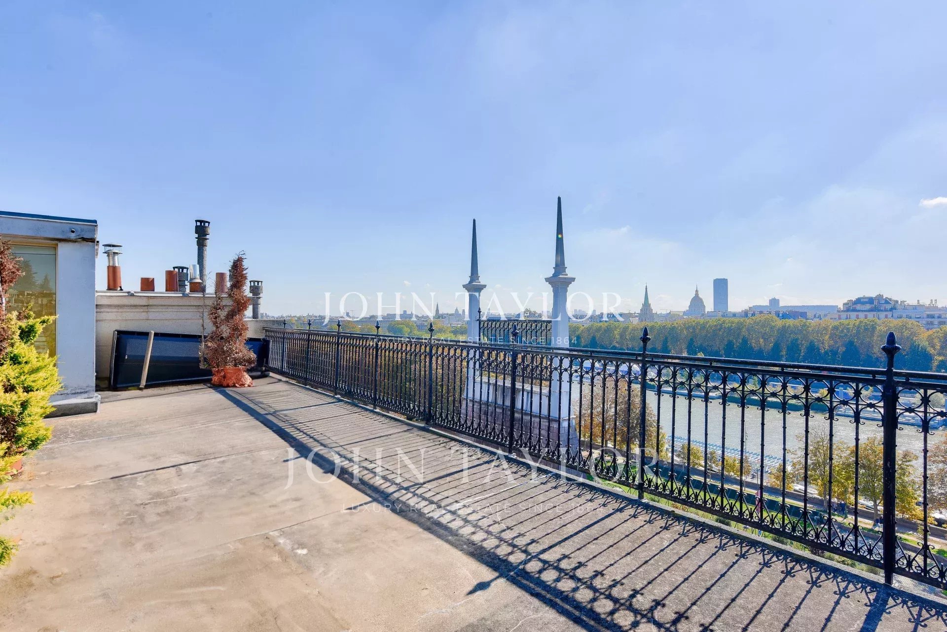 Nous vous proposons un appartement exceptionnel de 189 m2 (174 m2 loi Carrez) situé aux derniers étages d'un immeuble de grande facture et bénéficiant d'une terrasse de 60 m2 offrant des vues fantastiques sur la Seine et la Tour Eiffel sans aucun vis à vis.