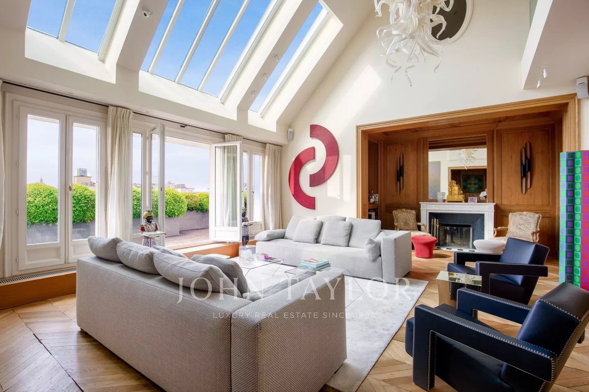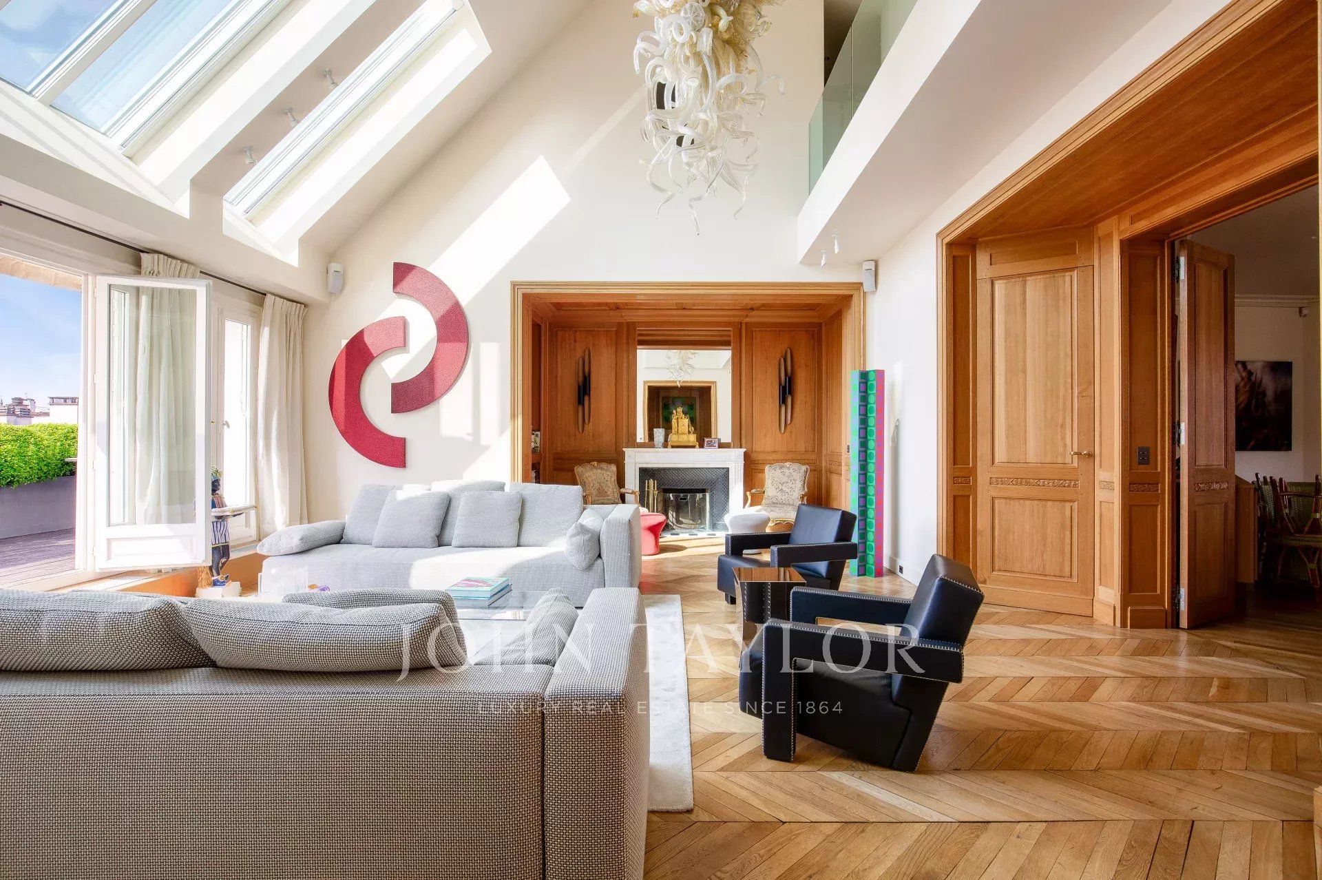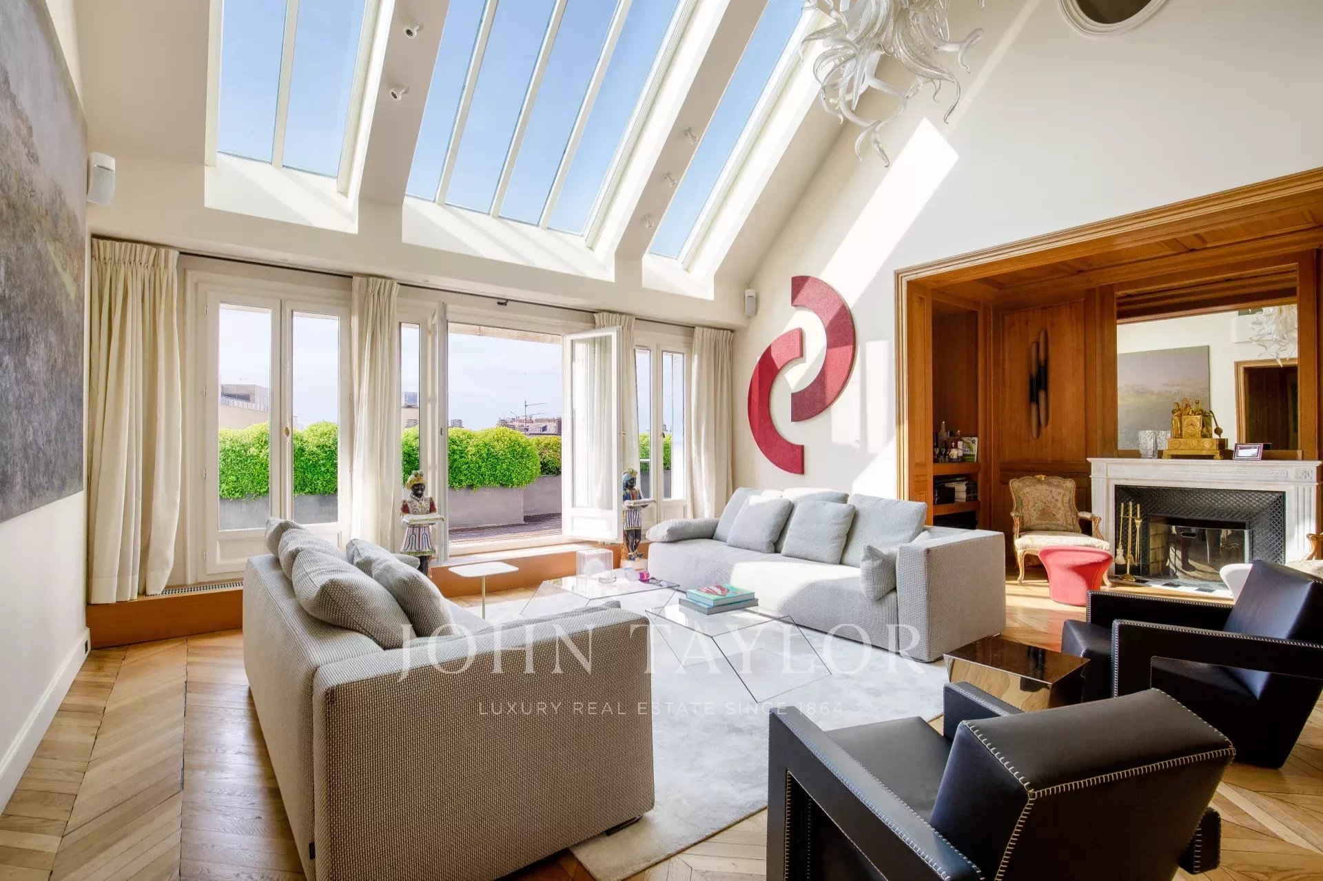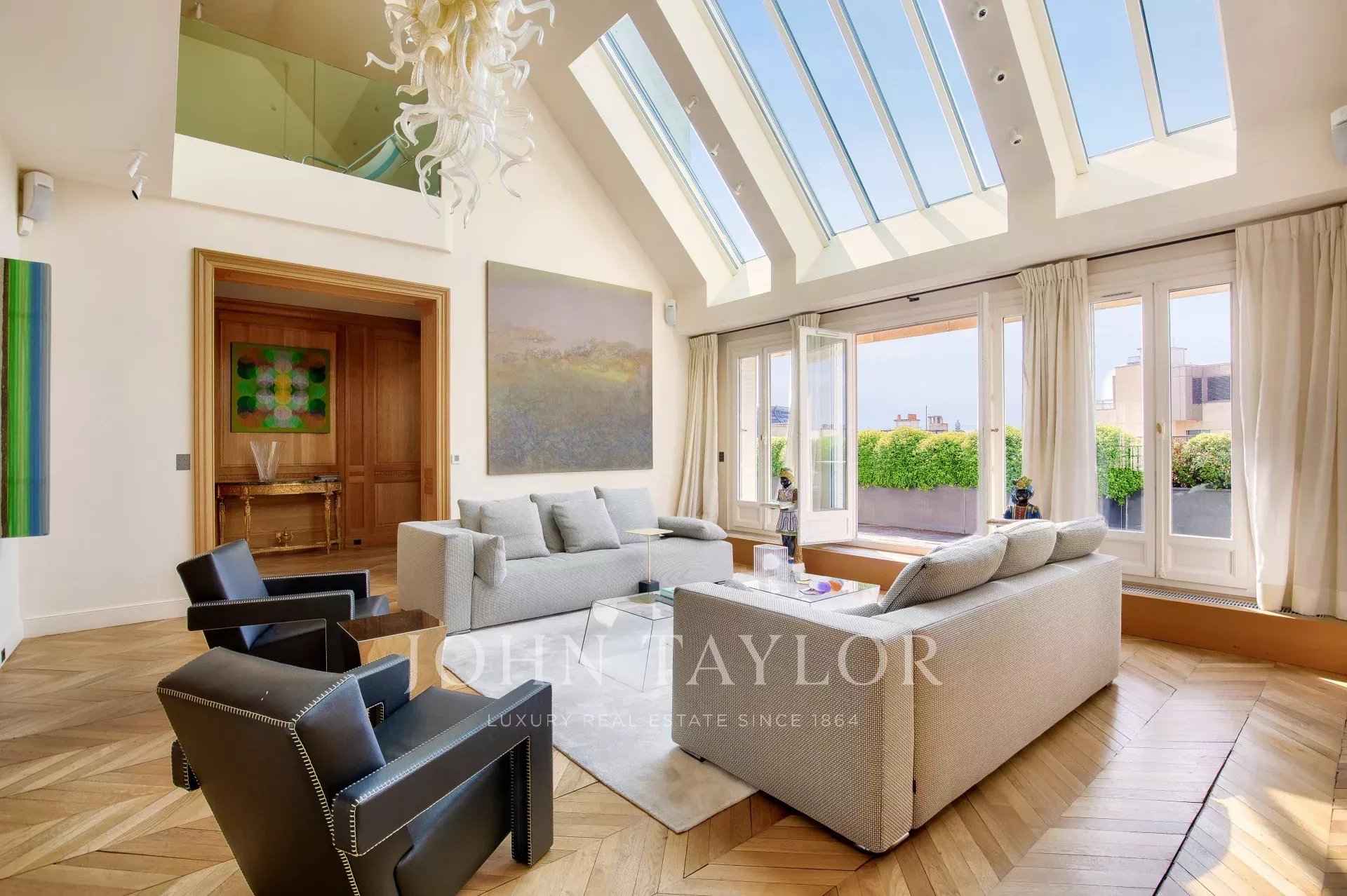 - salon type atelier d'artiste avec immenses verrières et double hauteur sous plafond de 5,70 mètres avec une première terrasse de 27 m2