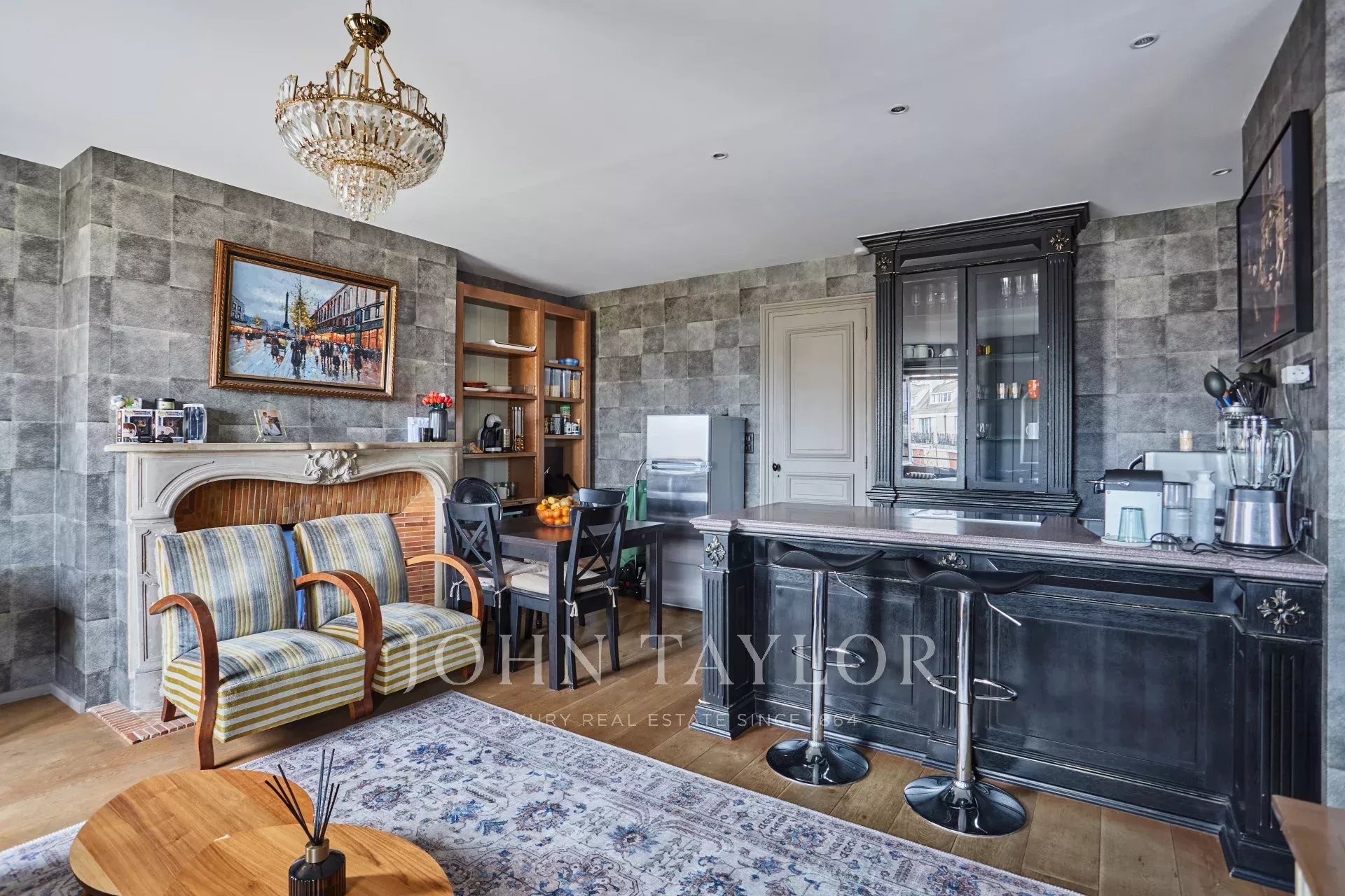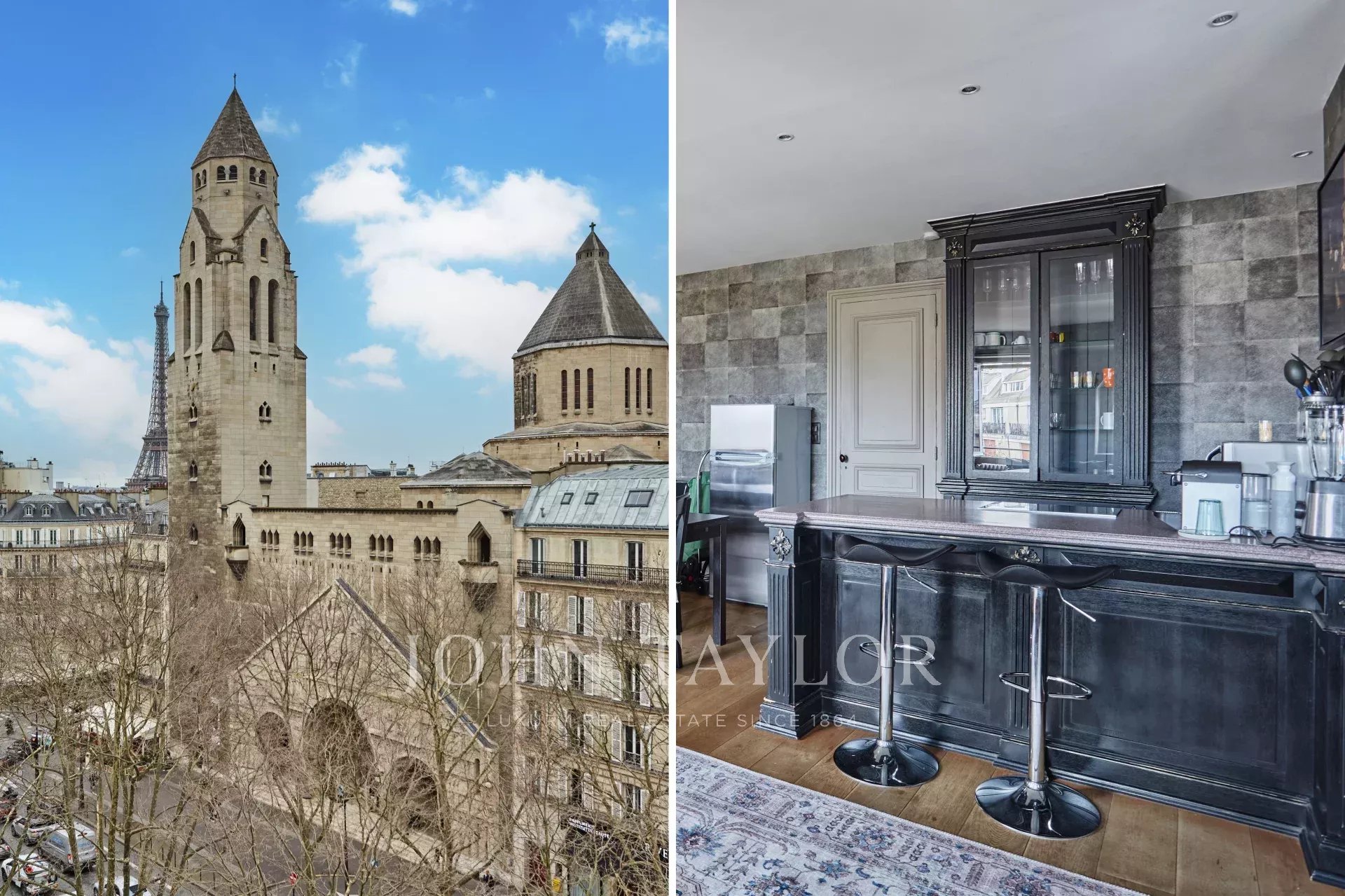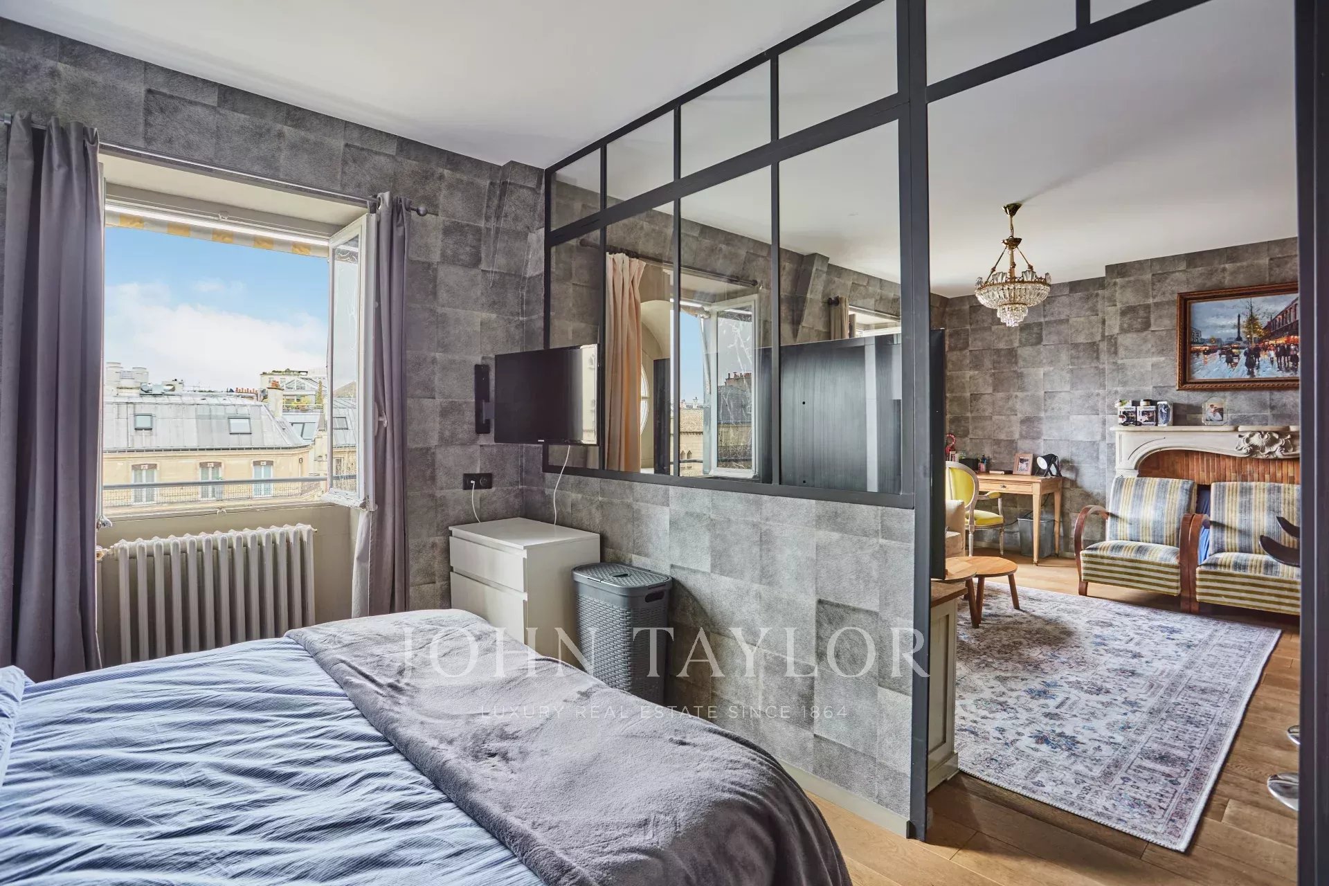 - Un séjour élégant, agrémenté de deux fenêtres dévoilant une vue imprenable sur la Tour Eiffel et l’église Saint-Pierre de Chaillot.