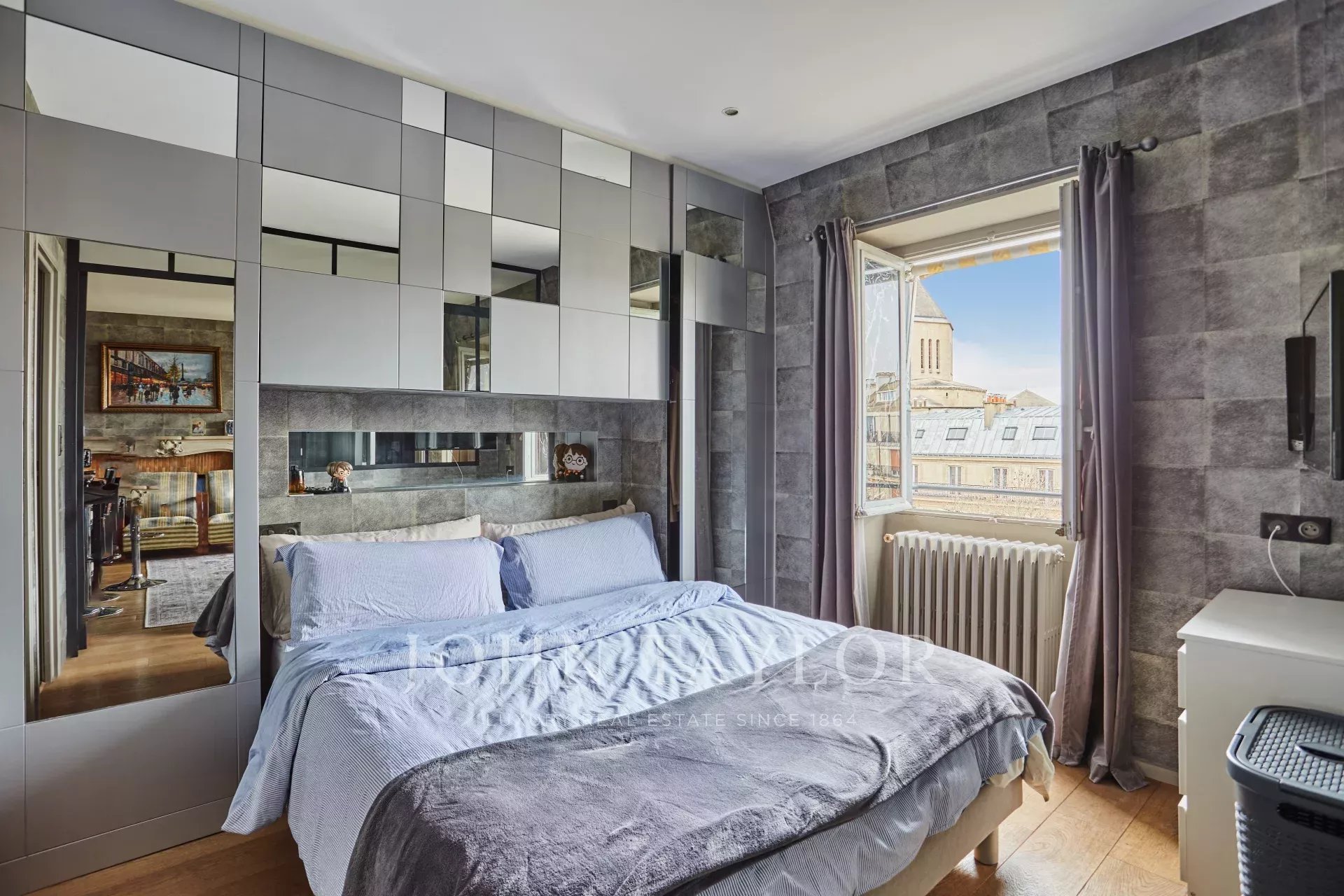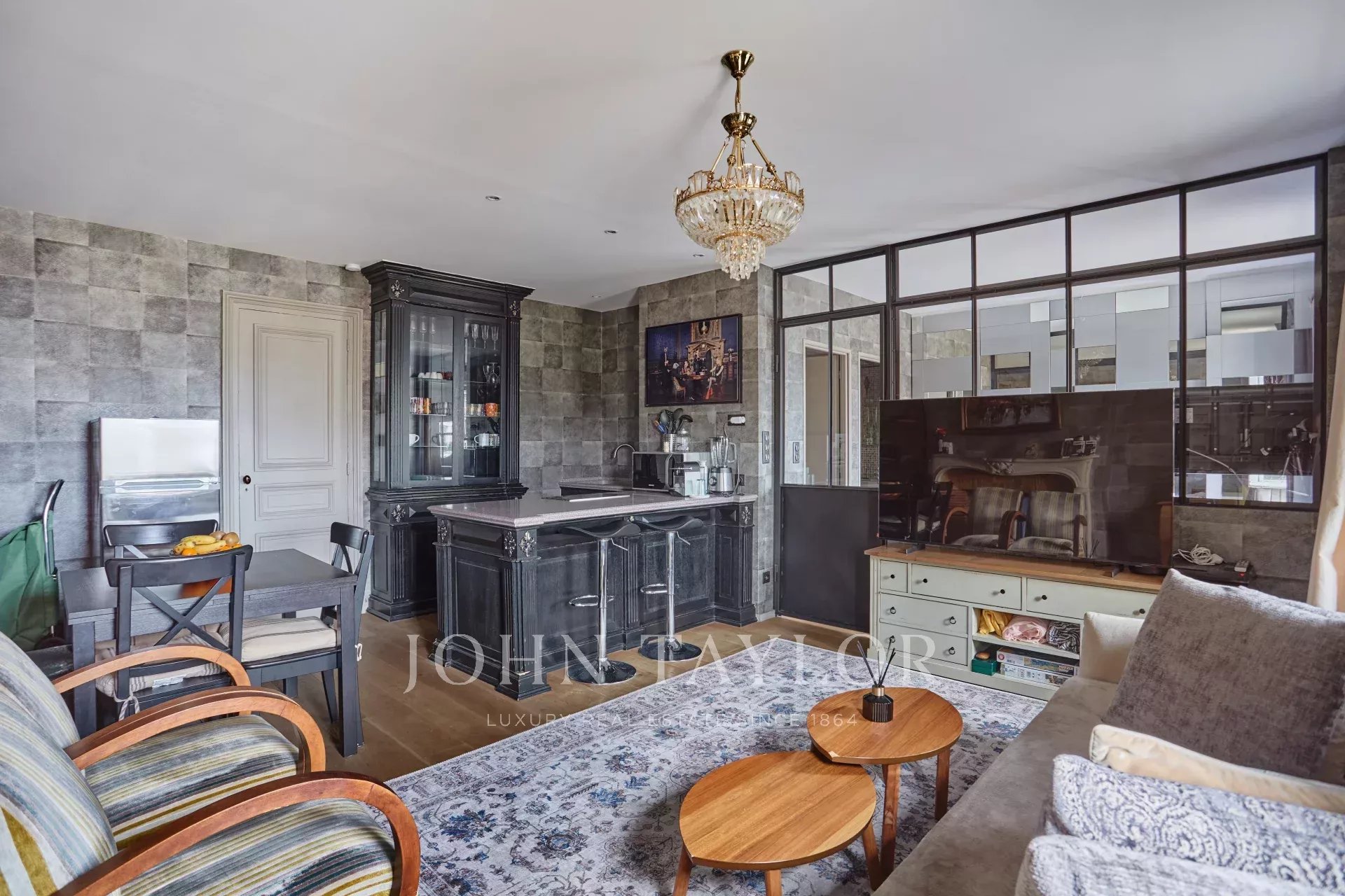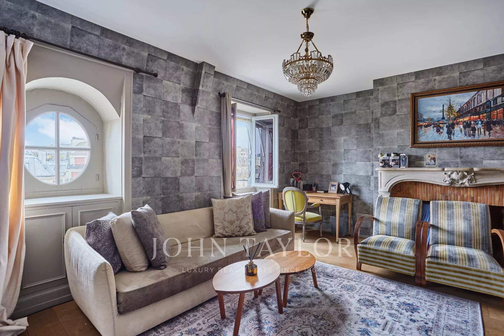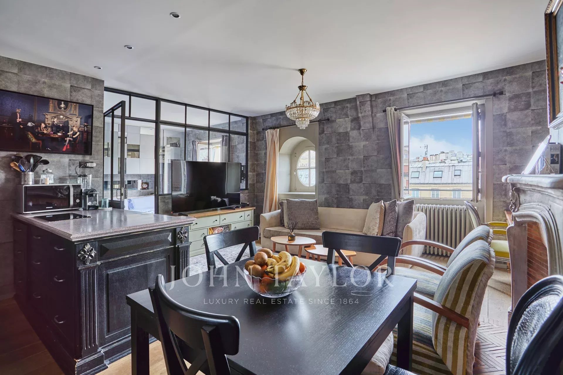 - Un séjour élégant, agrémenté de deux fenêtres dévoilant une vue imprenable sur la Tour Eiffel et l’église Saint-Pierre de Chaillot.