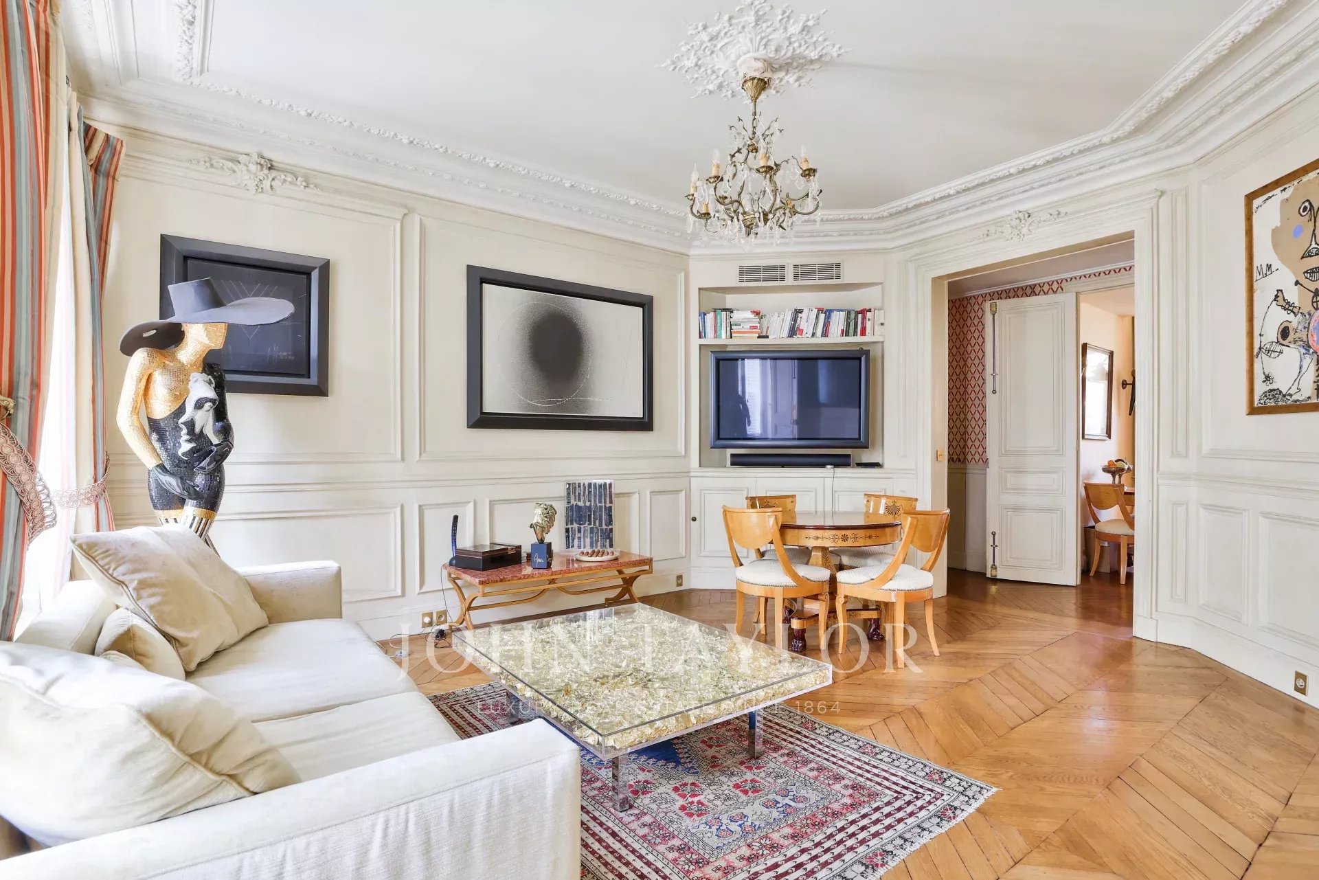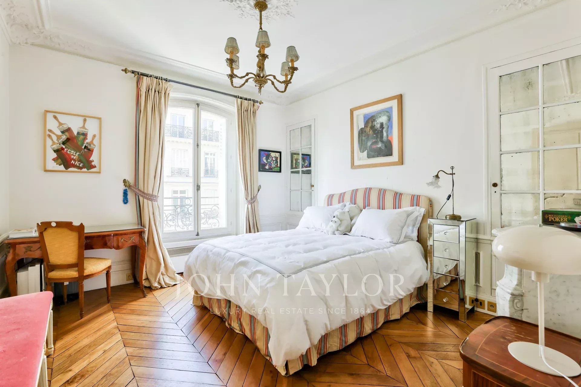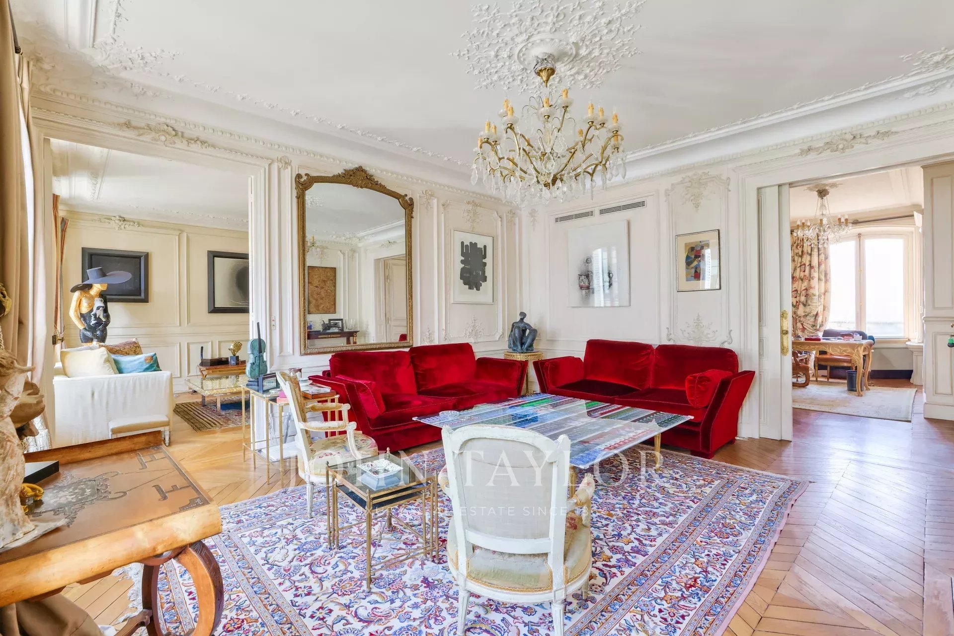 L'appartement a conservé ses éléments d'origine (parquet, moulures, cheminées) et bénéficie d'une climatisation. Il présente un excellent plan.