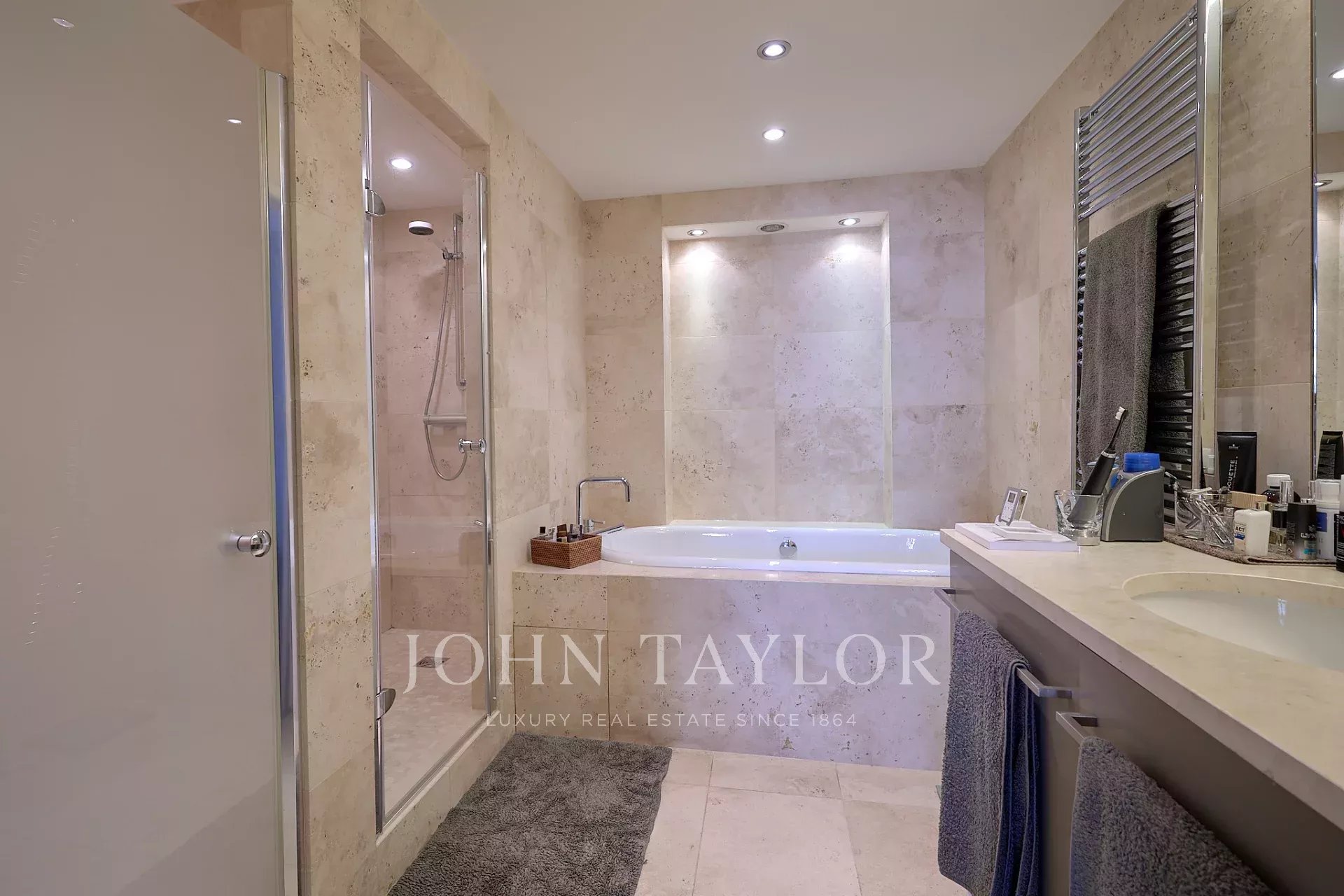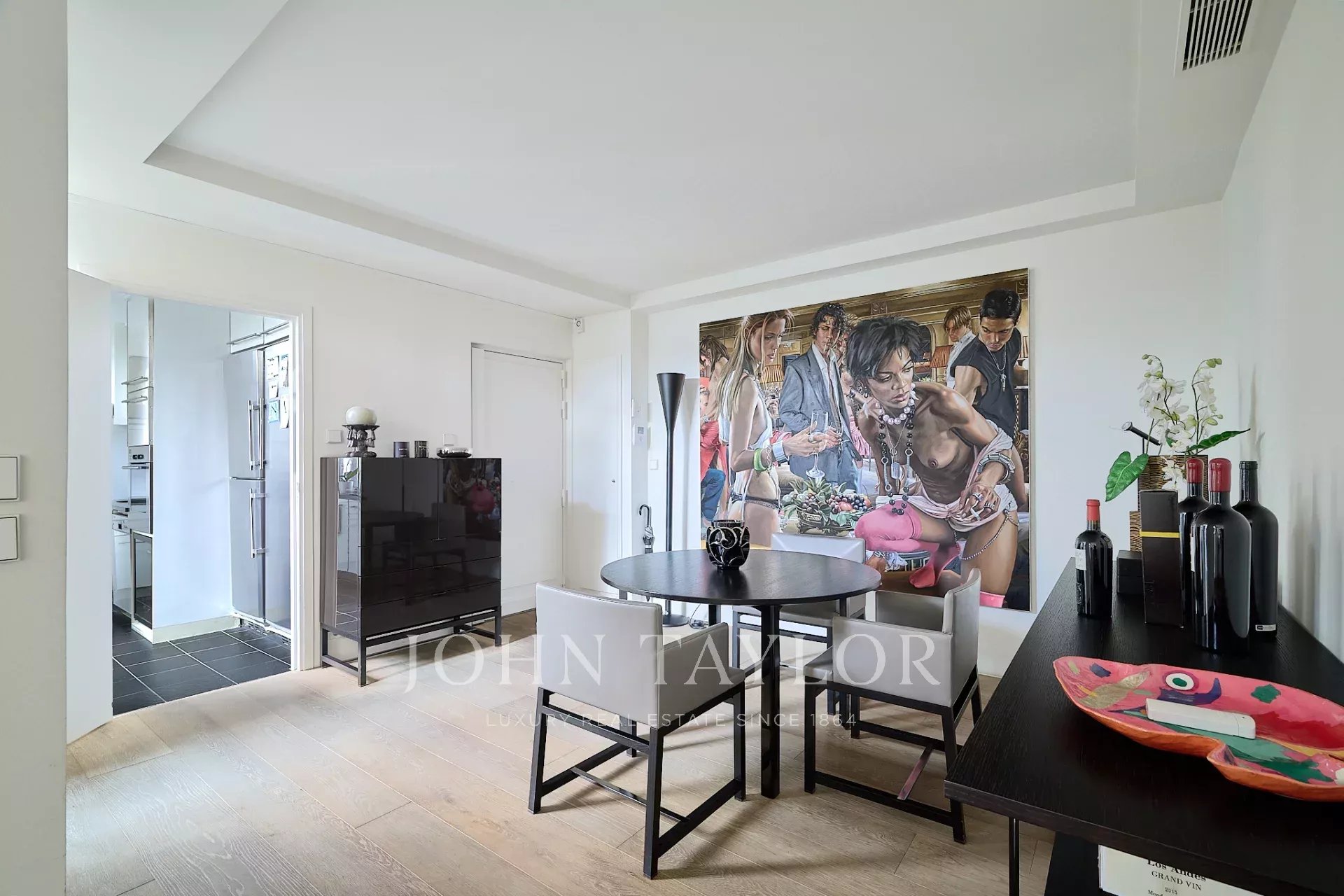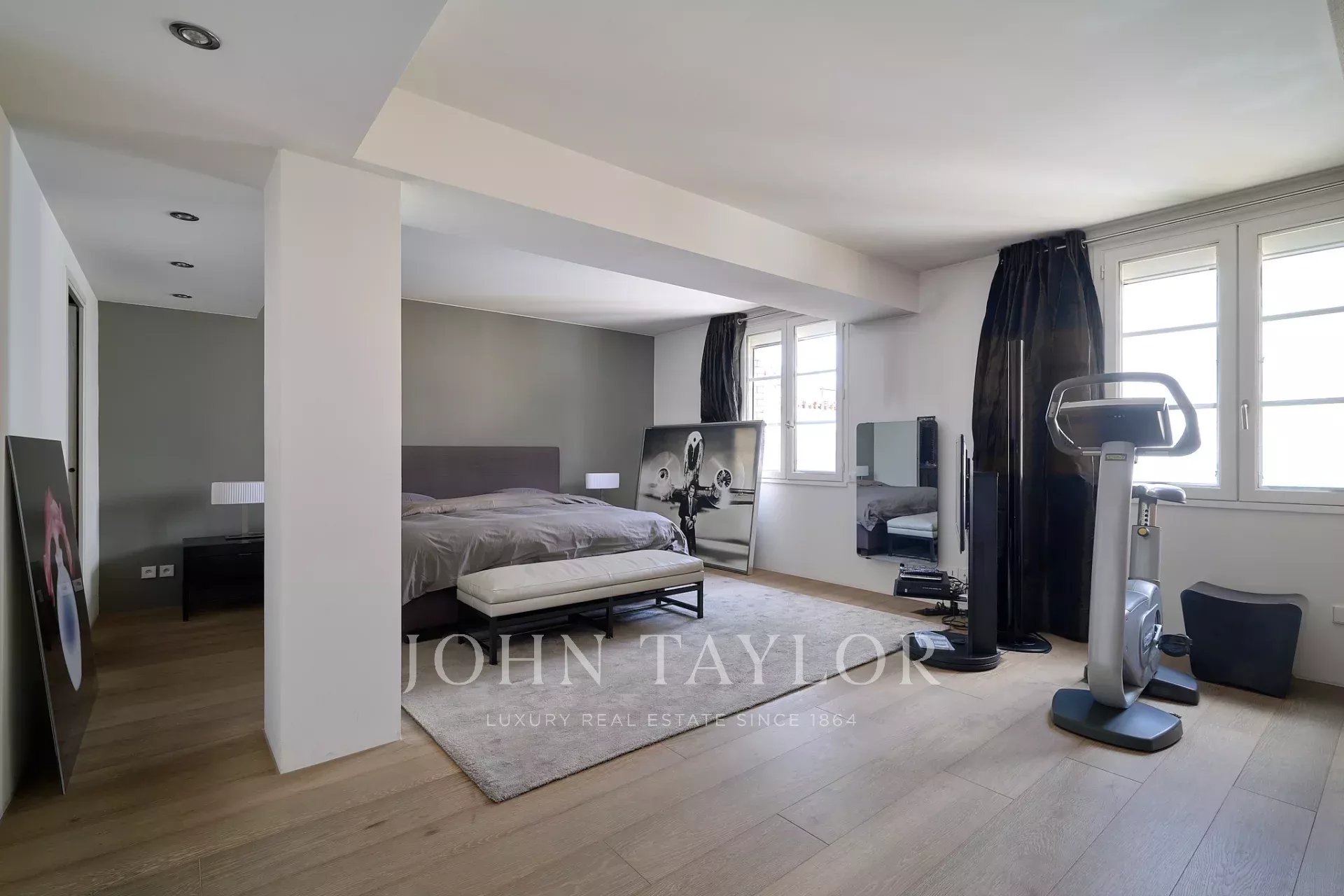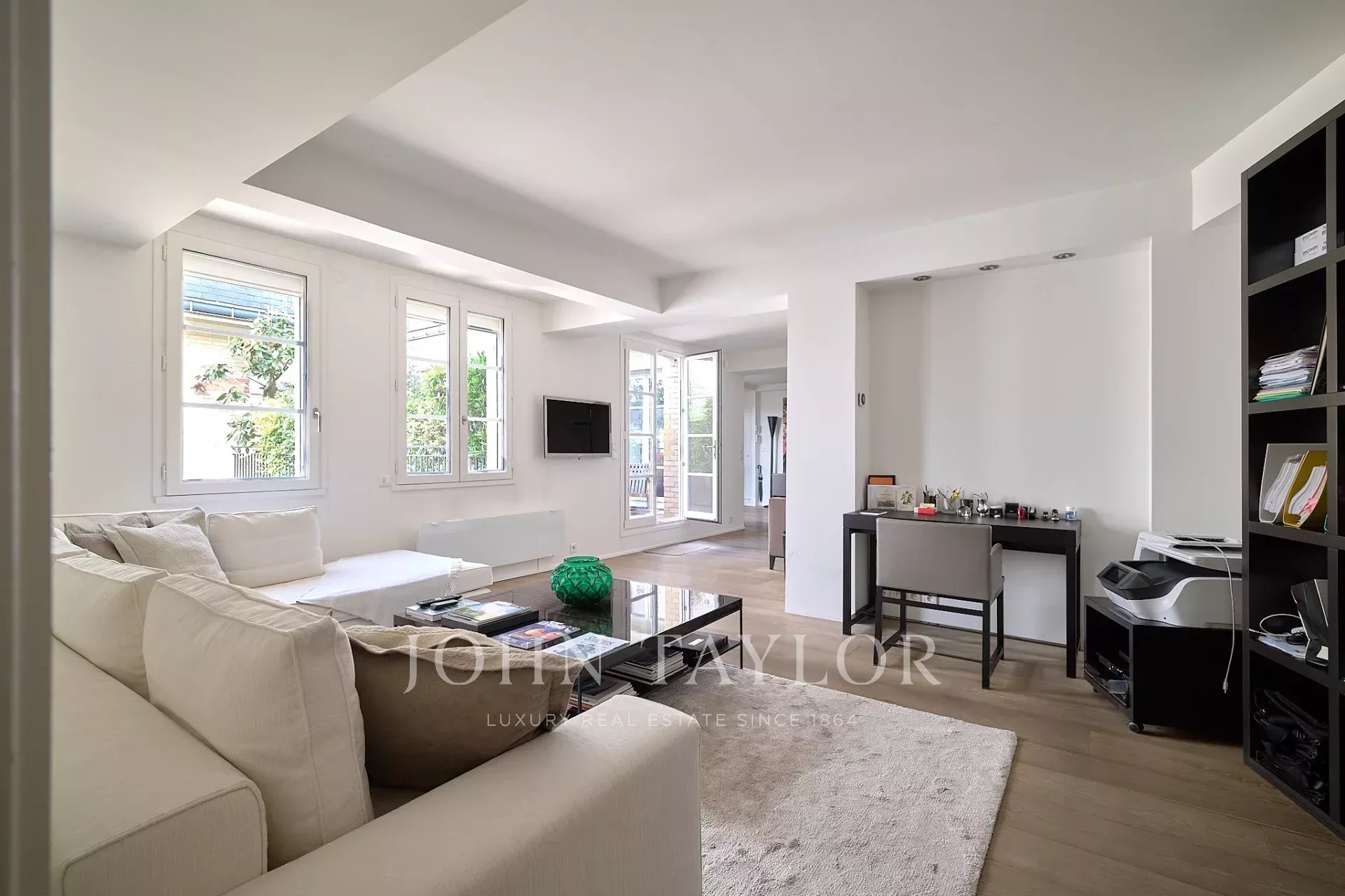 Entrée, double séjour de 47 m², cuisine équipée, grande chambre (2 chambres possibles), salle de bains et toilettes. Dressing-buanderie. Toilettes d’invités.