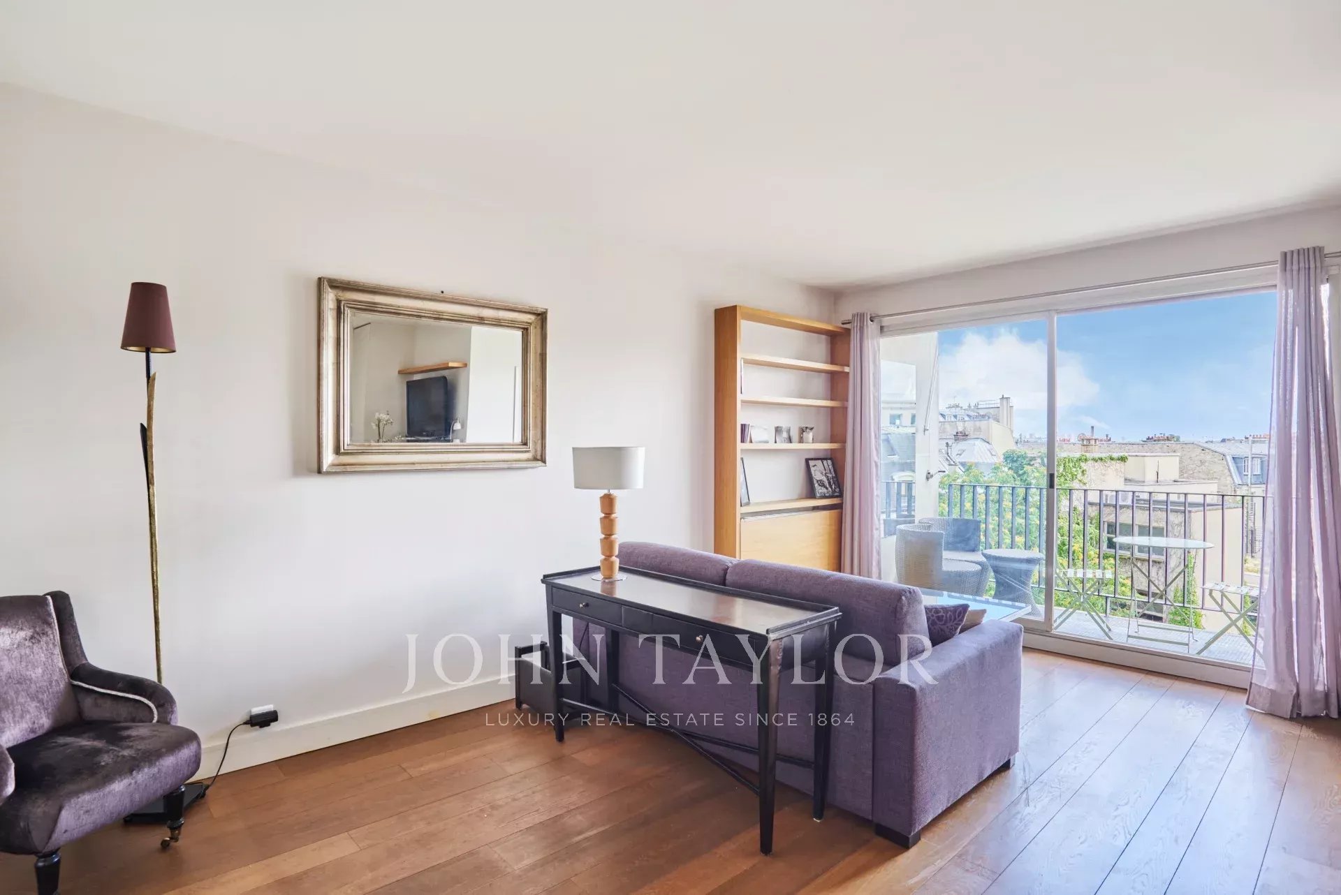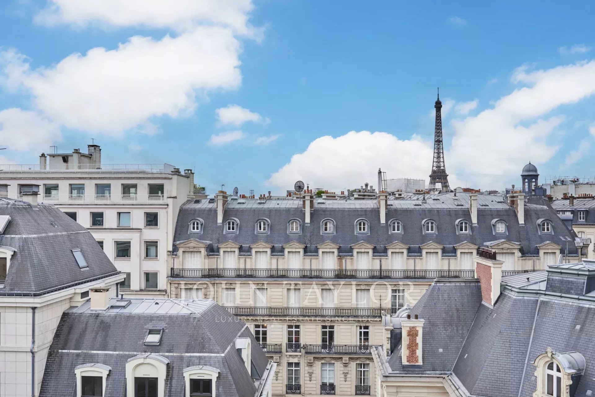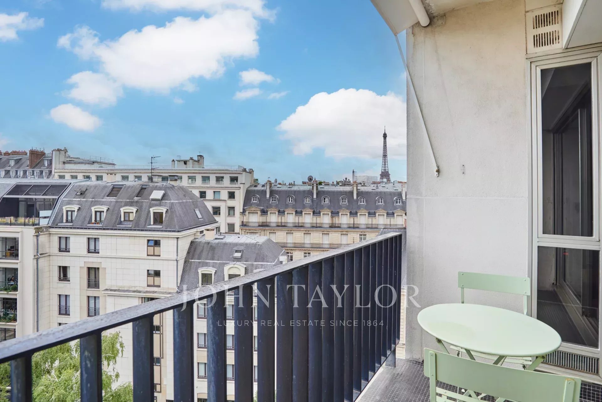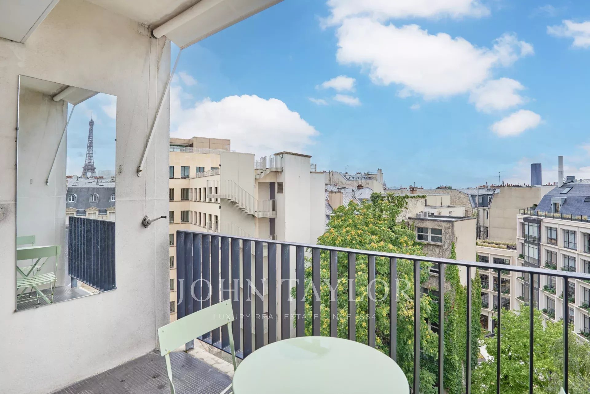 Un salon lumineux avec accès à un balcon terrasse permettant de prendre ses repas avec la vue sur la Tour Eiffel et le Dôme des Invalides,