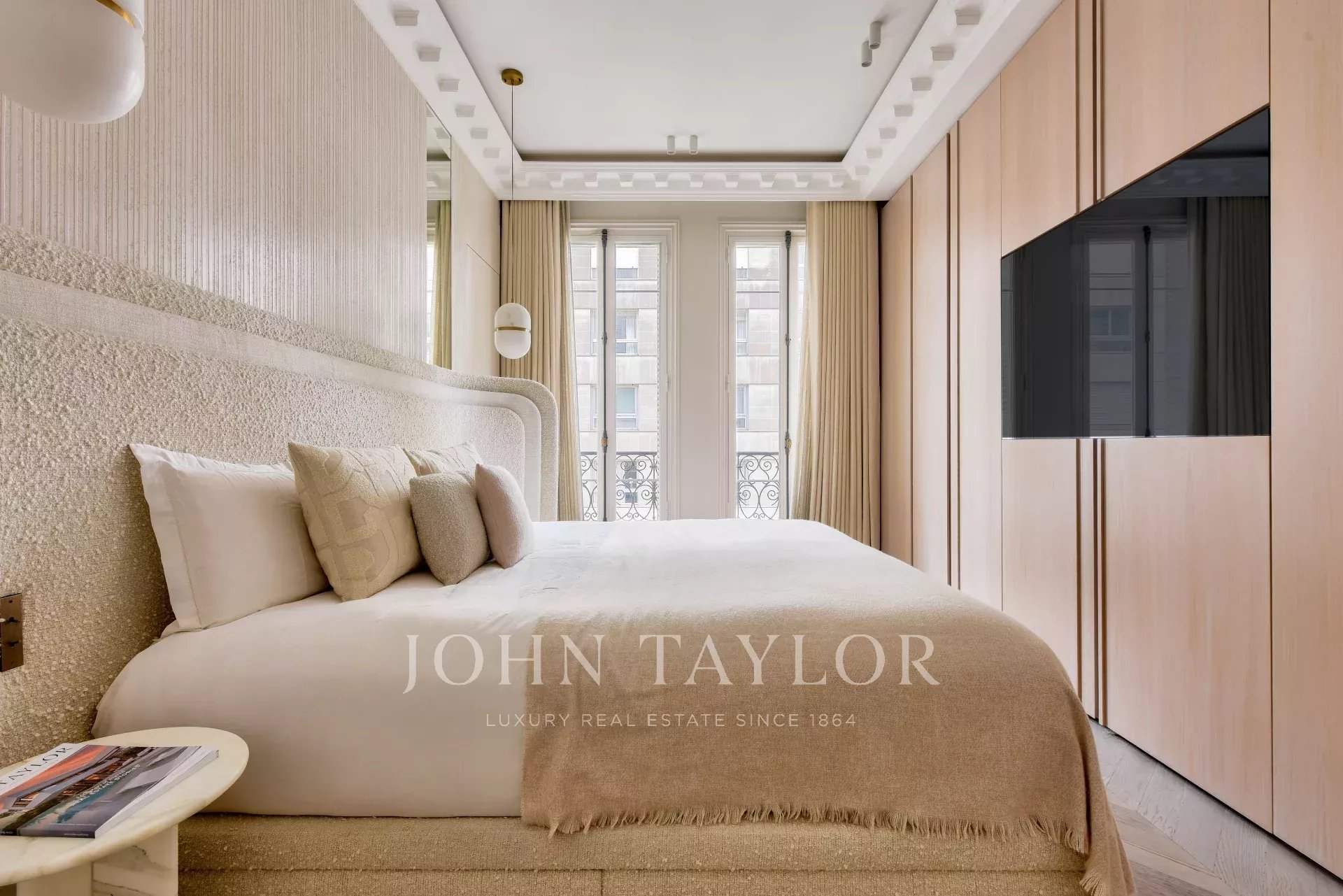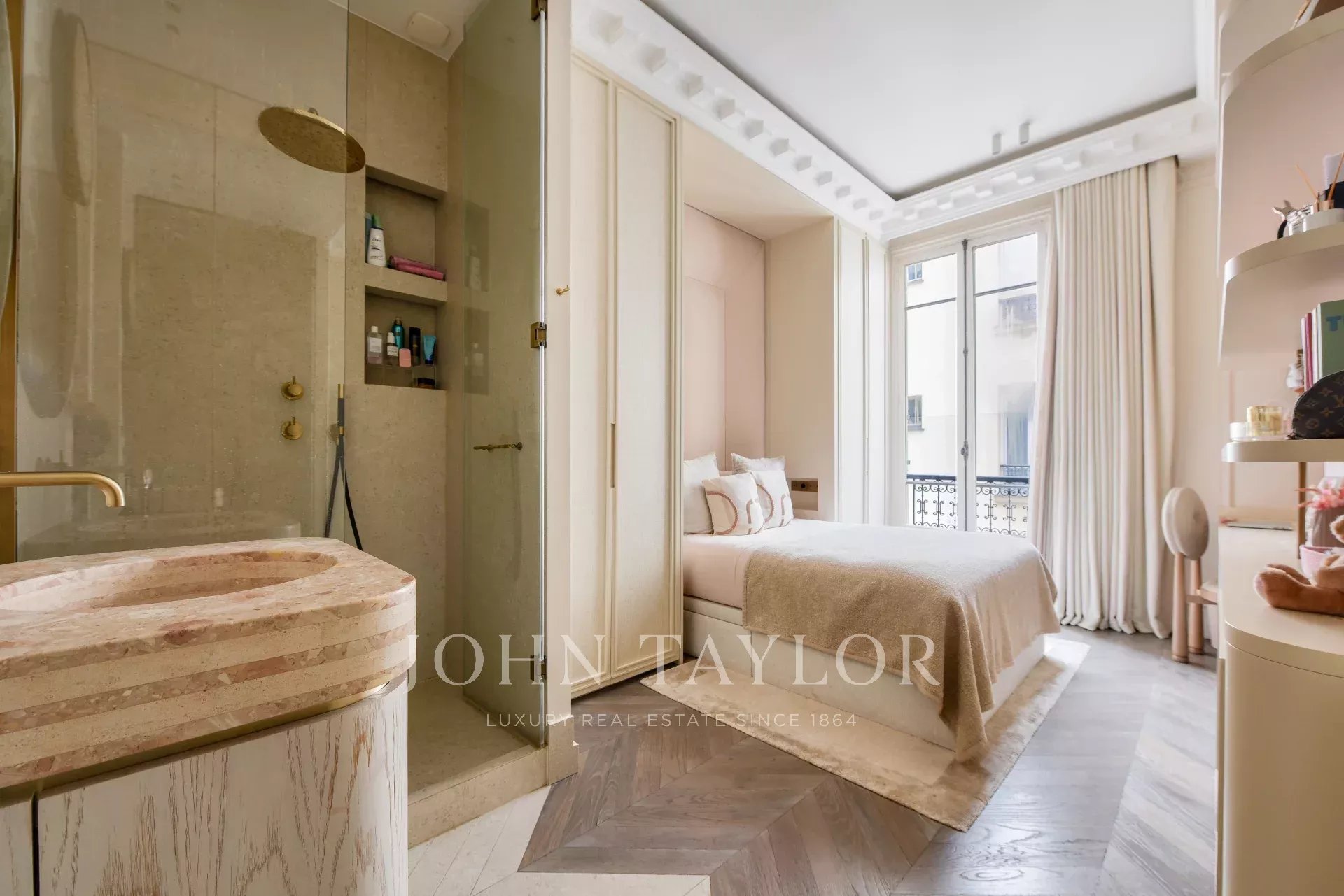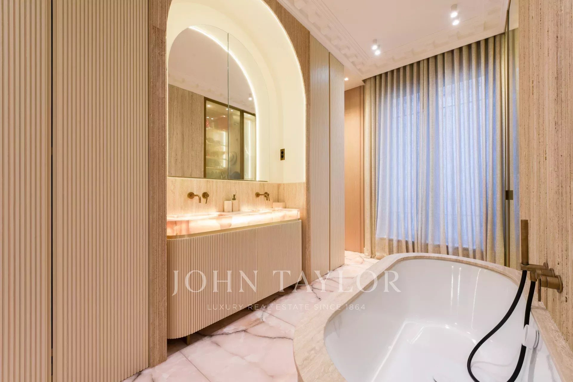 La décoration raffinée, alliée à des matériaux de grande qualité, travertin, parquet Versailles confère à l'appartement une élégance rare.