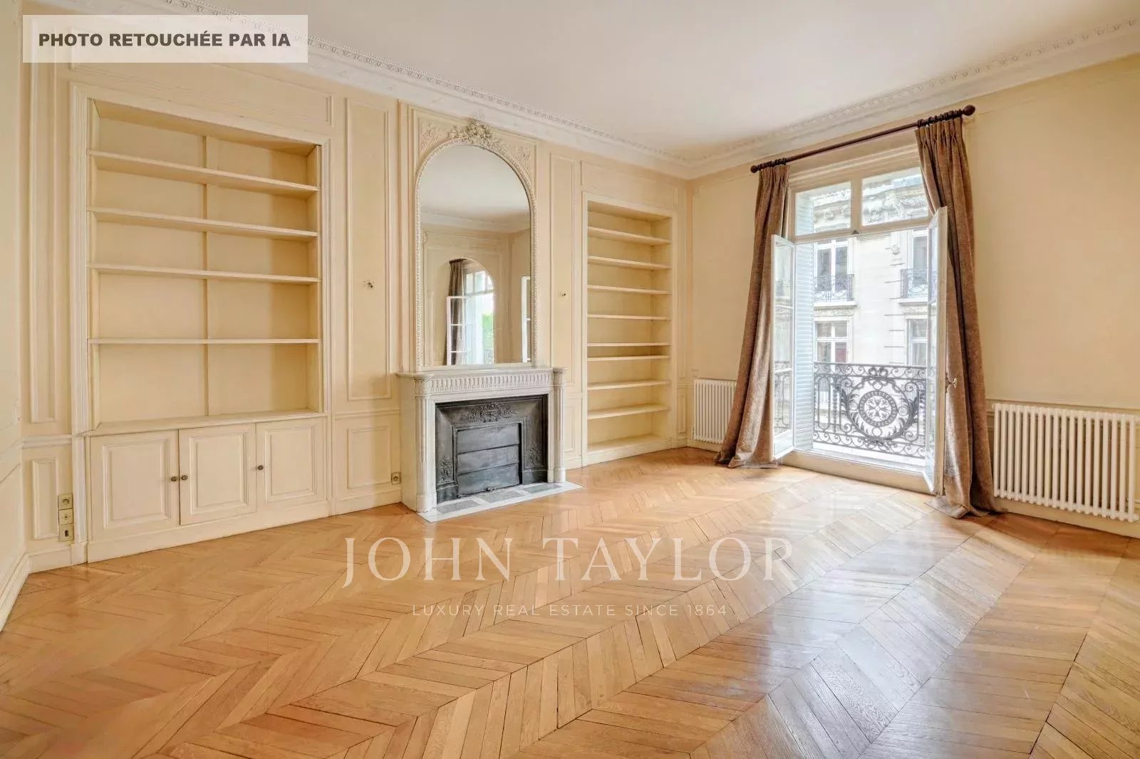 Grand séjour / salon avec moulures et parquet en pointes de Hongrie