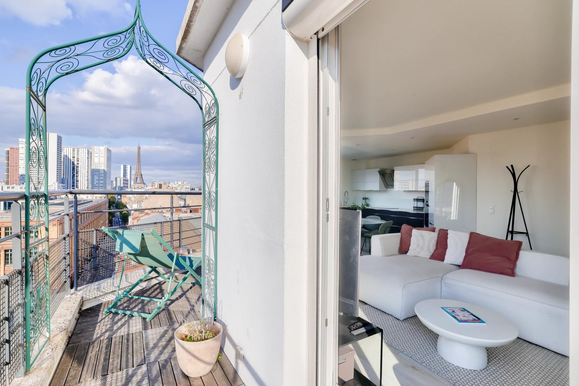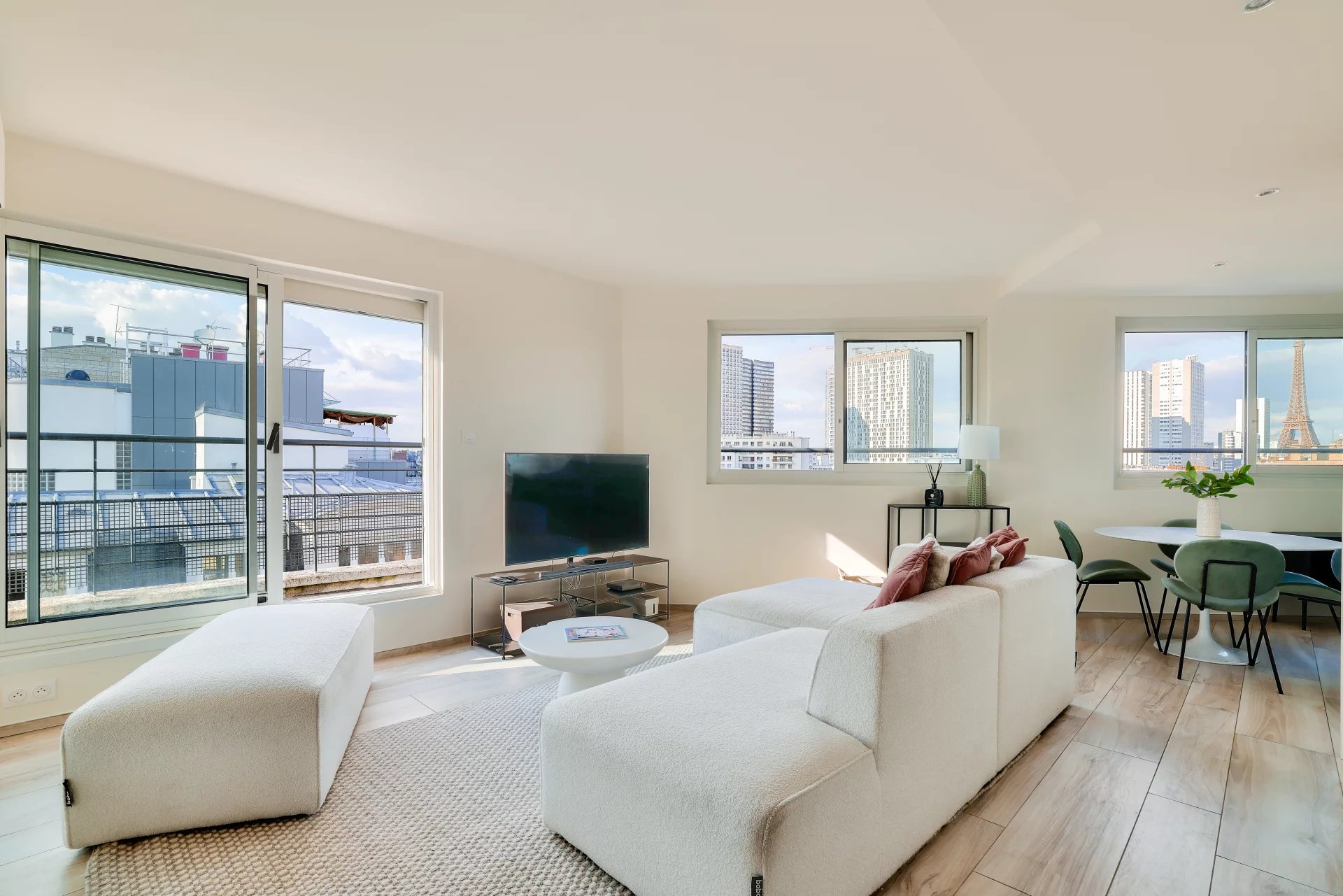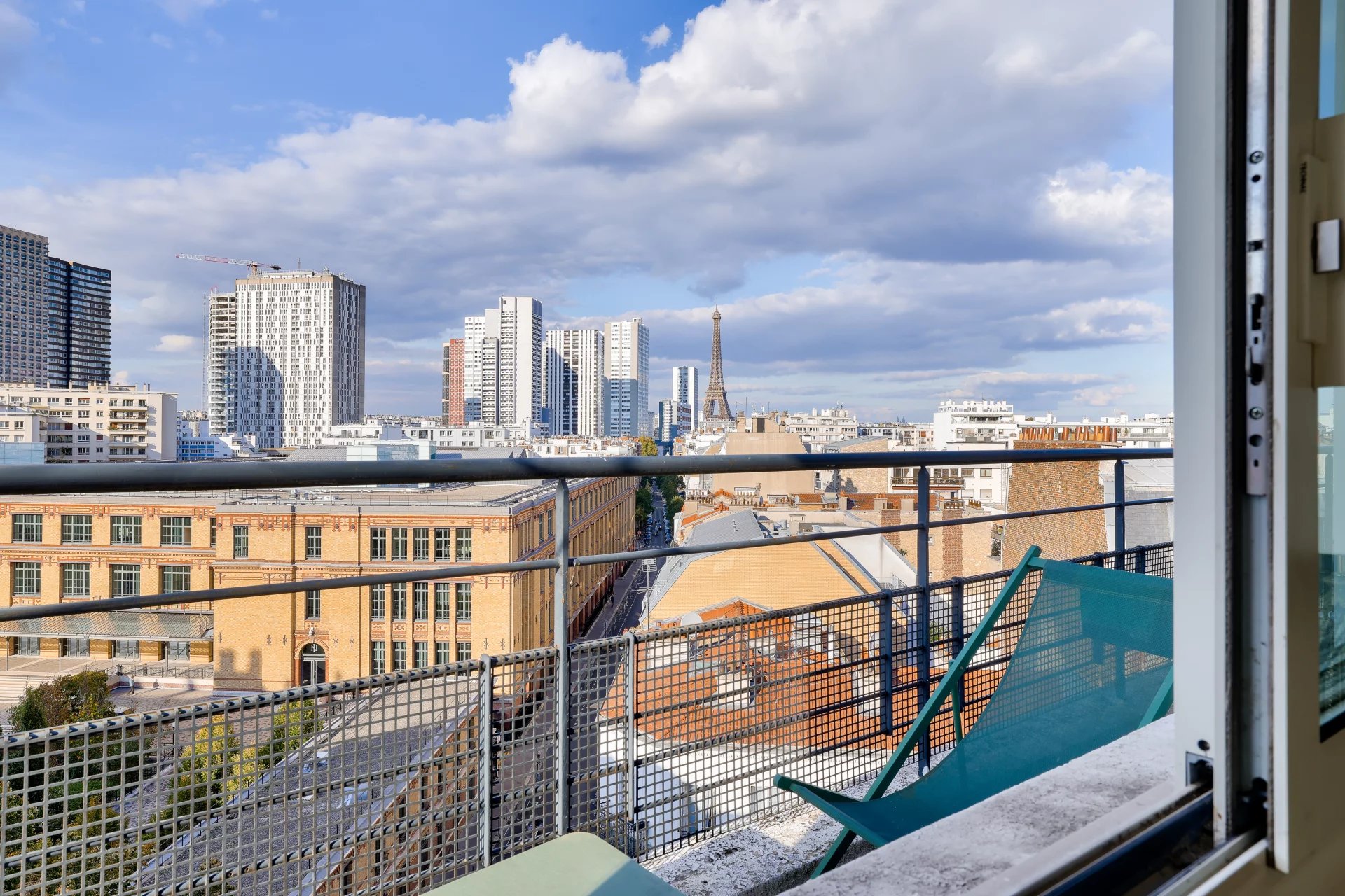 - Un salon avec baie vitrée donnant sur un large balcon filant de 15m² et avec des vues panoramiques et Tour Eiffel;