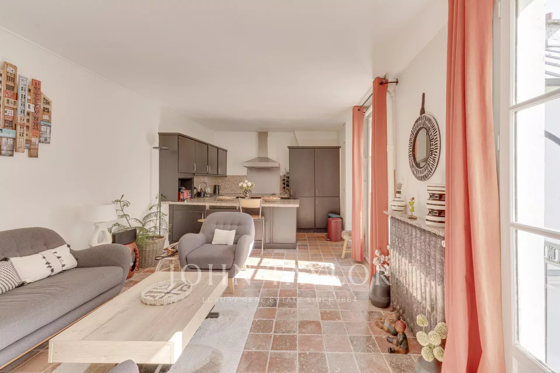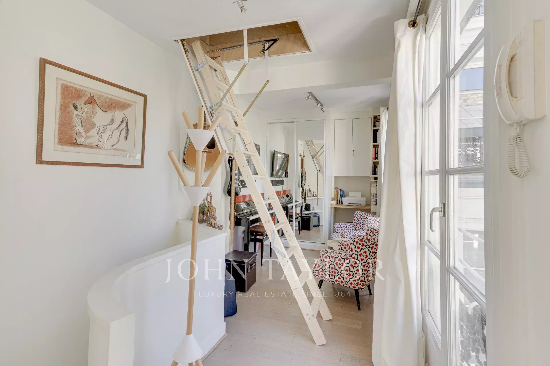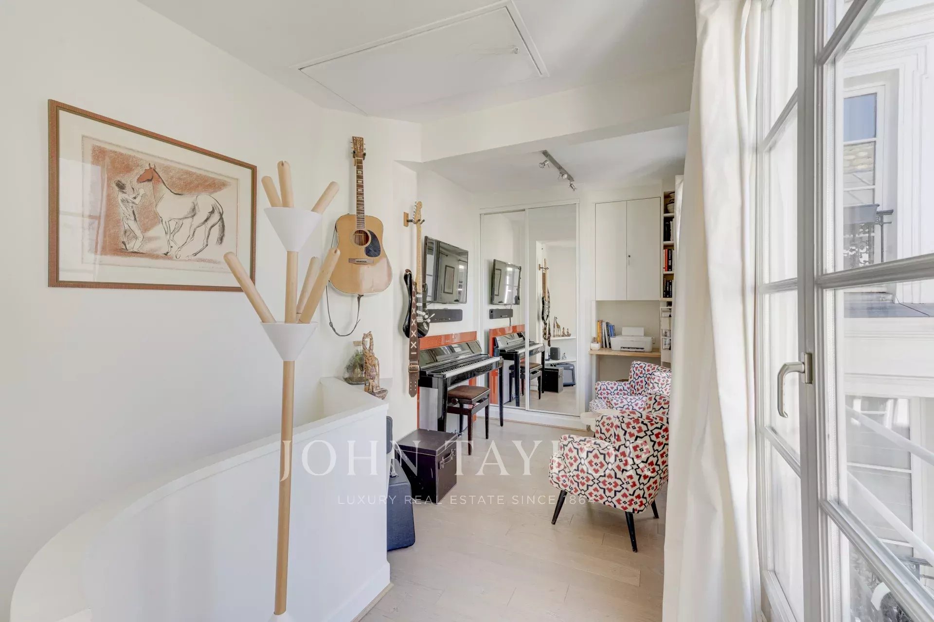 Rue Jacob. Dans l'une des rues les plus prisées de Saint-Germain-des-Prés, au dernier étage d'un bel immeuble avec gardien édifié en 1878, accessible par ascenseur jusqu'au troisième étage, nous vous proposons un appartement charmant et en excellent état de 50,56 m² loi Carrez au cinquième et dernier étage.