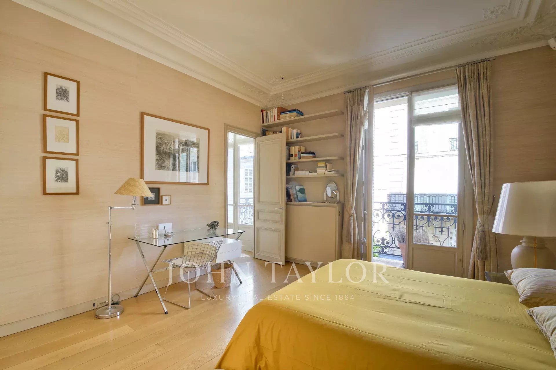 À deux pas des Jardins du Luxembourg, de l’église Saint-Sulpice et du Bon Marché, bel appartement lumineux de 104 m² Carrez avec balcon filant, situé au 2ᵉ étage par ascenseur d’un immeuble d’angle du XIXᵉ siècle.