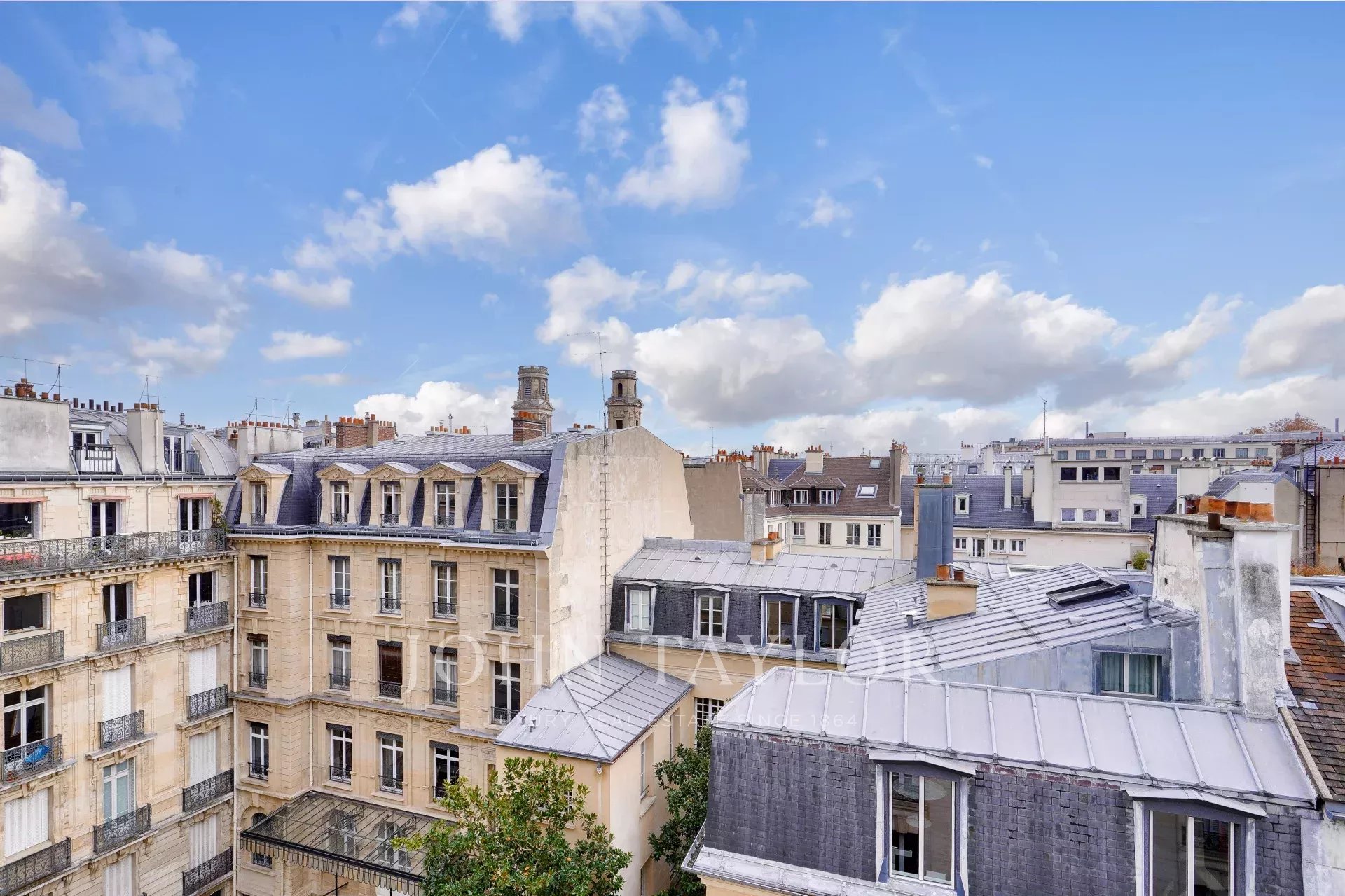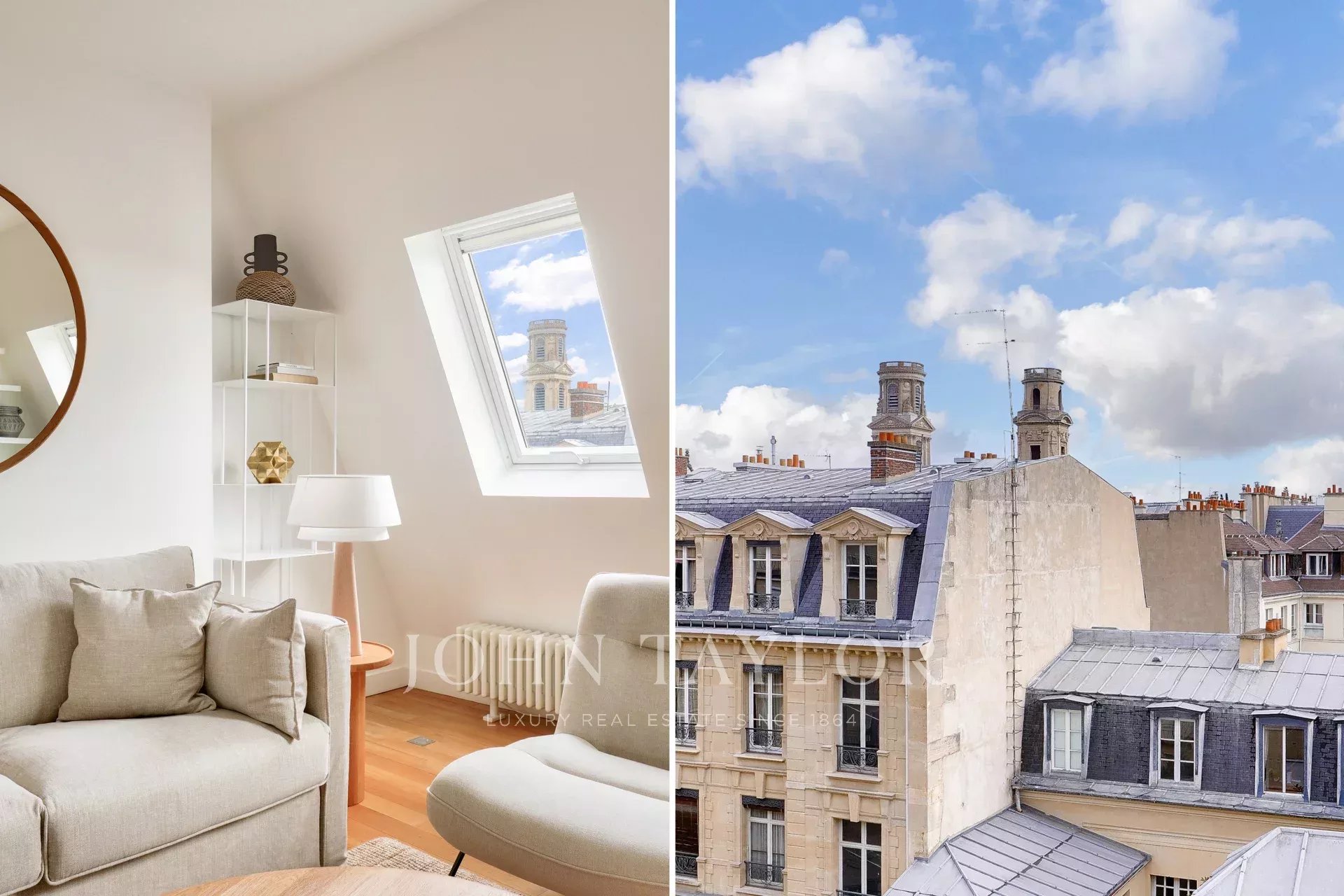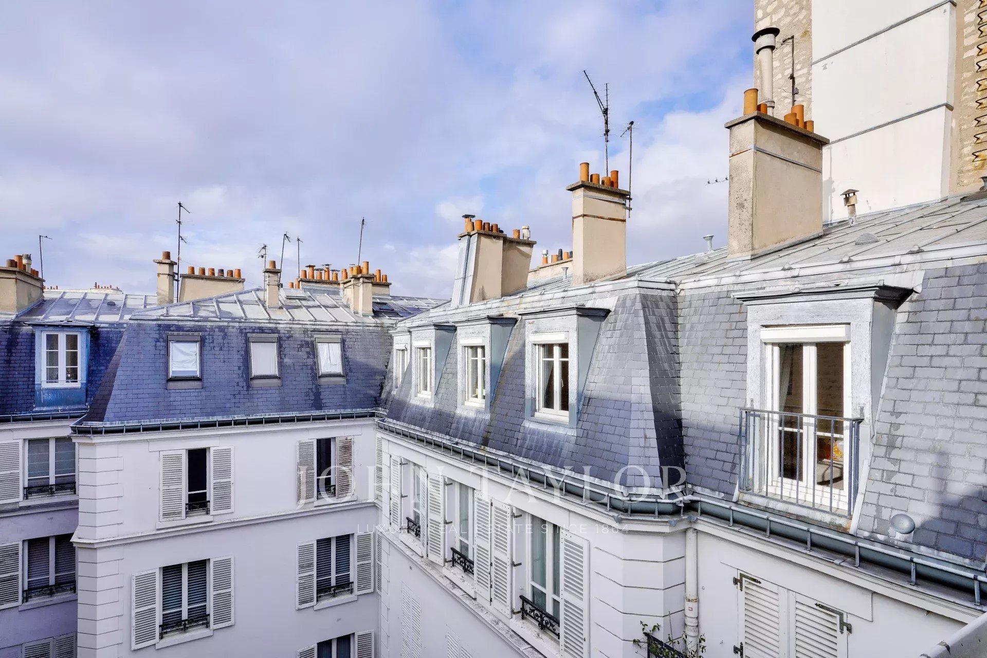 Exclusivité. Nous vous proposons un ravissant appartement lumineux de 57,38 m² loi Carrez (69,55 m² au sol), situé au dernier étage par ascenseur d’un immeuble ancien de bon standing, offrant une vue dégagée plein ciel sur les toits de Paris, à deux pas de la place Saint-Sulpice et du jardin du Luxembourg.