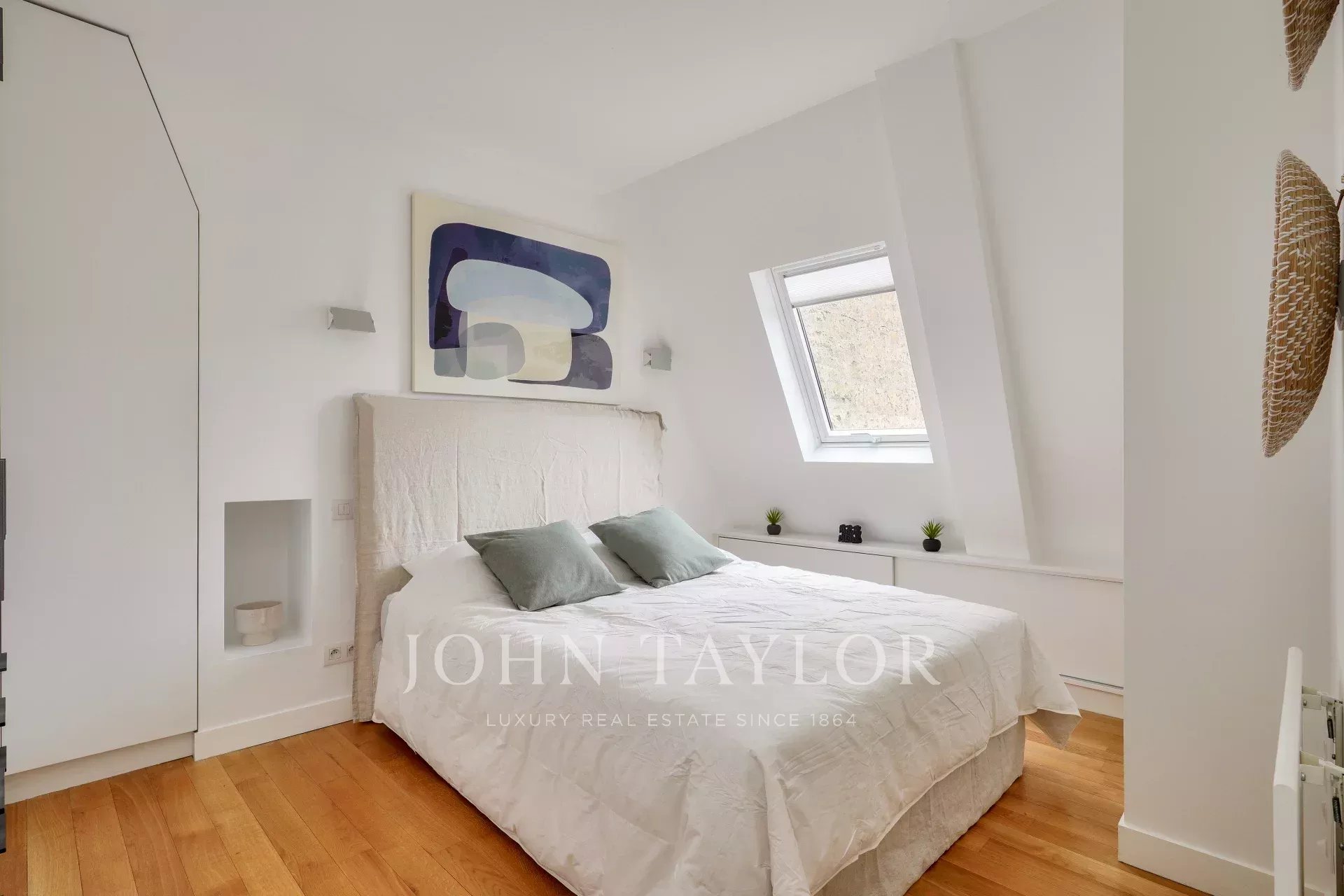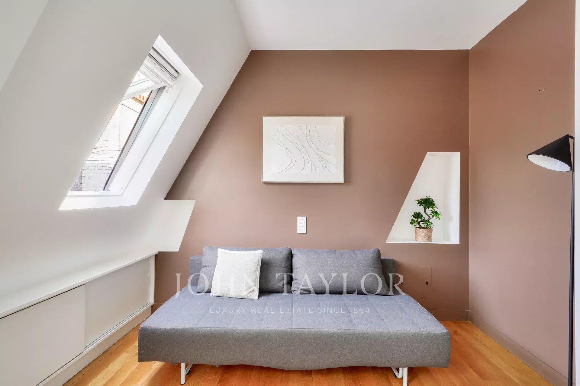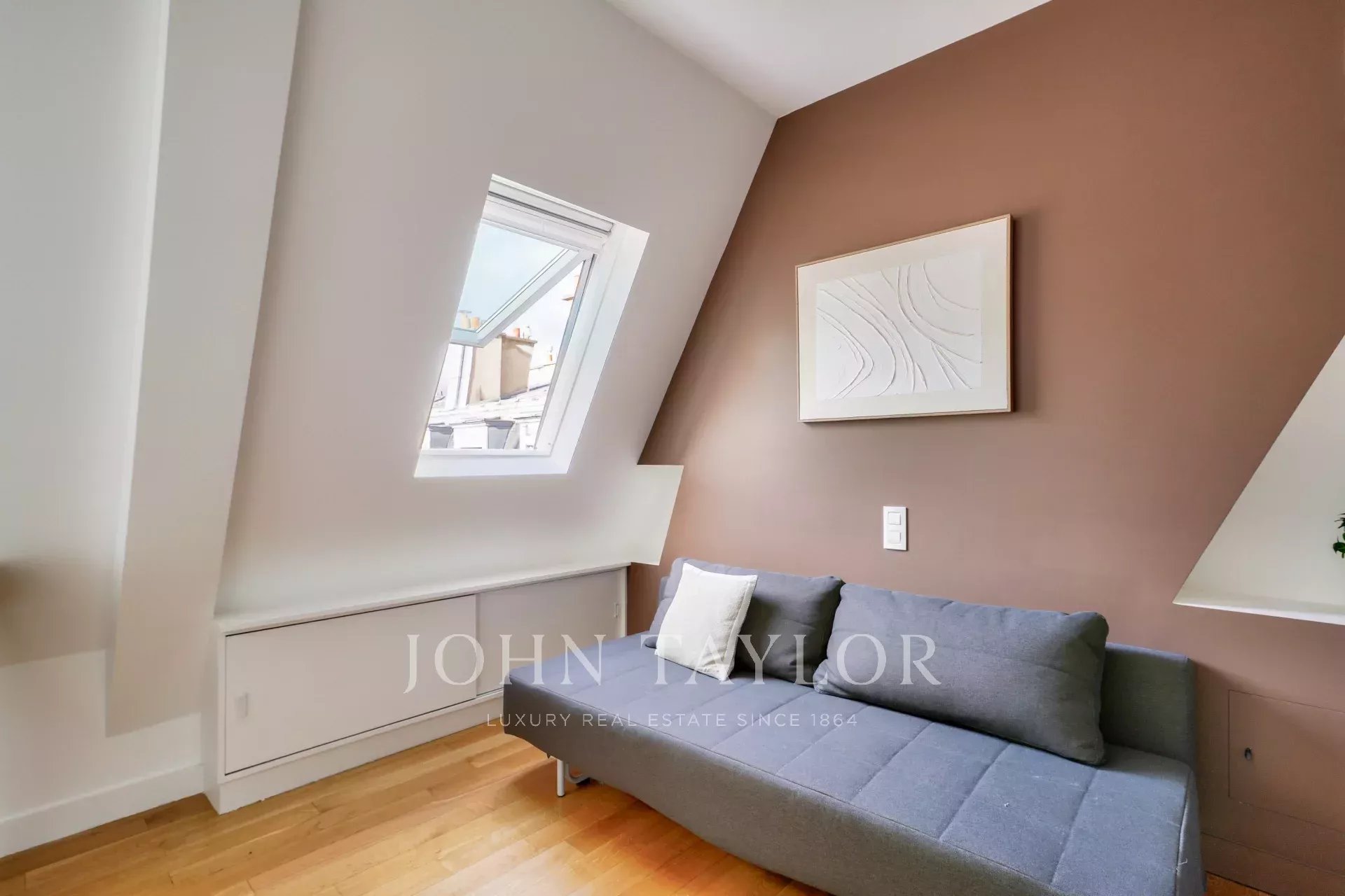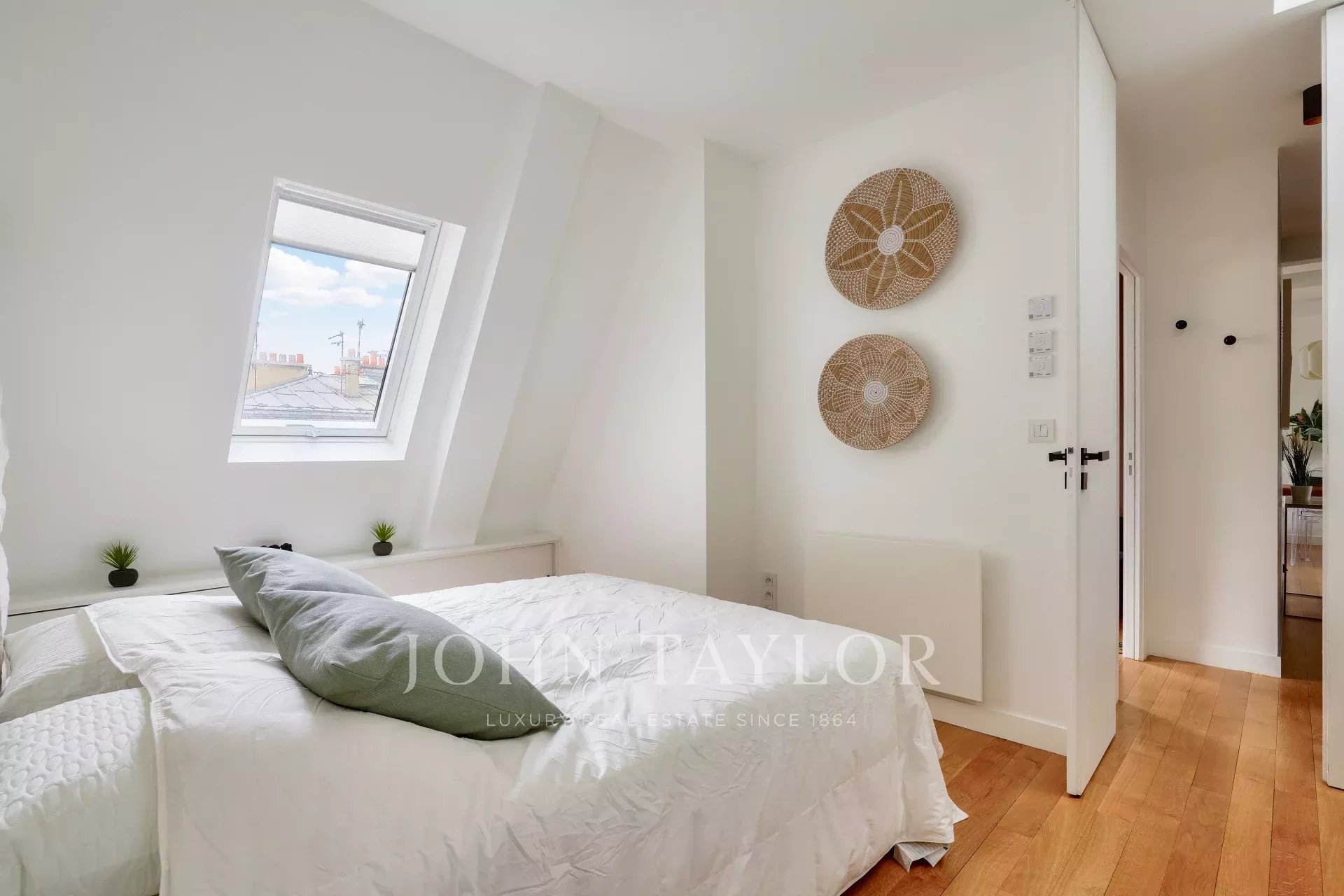 Exclusivité. Nous vous proposons un ravissant appartement lumineux de 57,38 m² loi Carrez (69,55 m² au sol), situé au dernier étage par ascenseur d’un immeuble ancien de bon standing, offrant une vue dégagée plein ciel sur les toits de Paris, à deux pas de la place Saint-Sulpice et du jardin du Luxembourg.