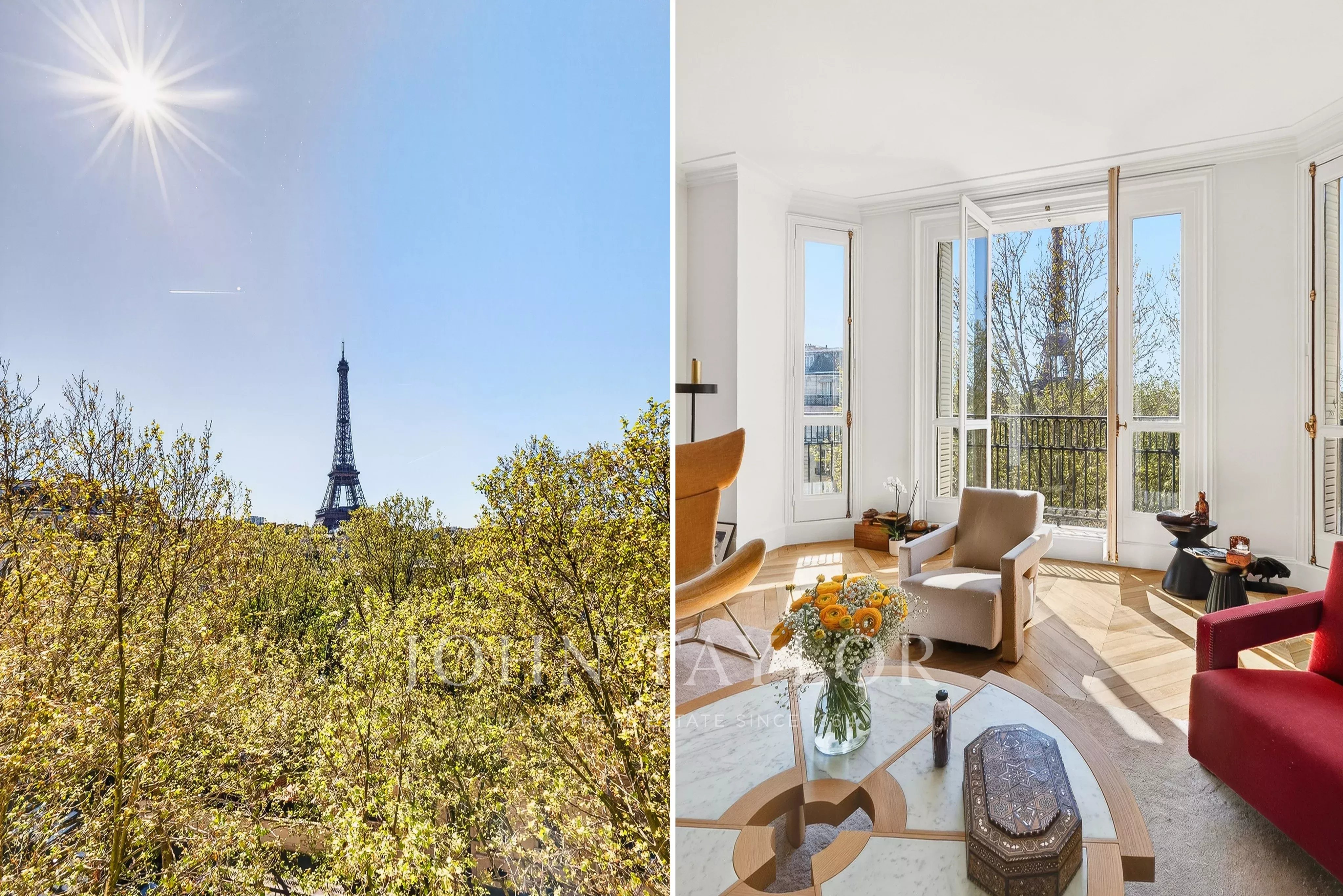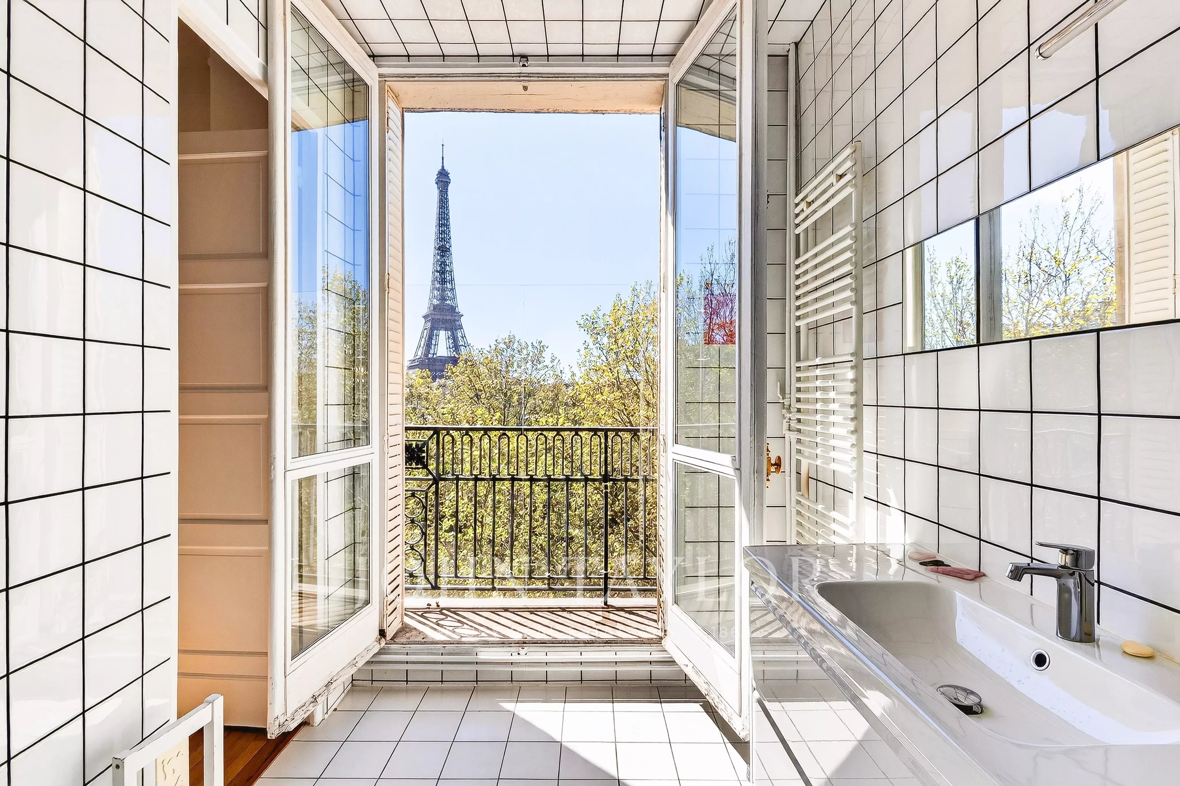 Situé au sixième étage avec ascenseur d’un élégant immeuble en pierre de taille avec gardien, cet appartement d’exception séduit par sa luminosité (exposition Ouest) et ses vues sur la tour Eiffel, la Seine et le Trocadéro.