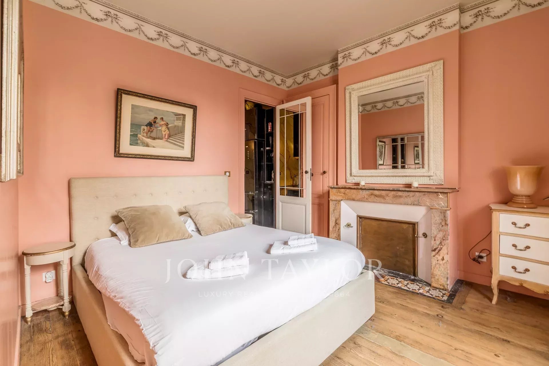 L’esprit de l'ancien a été préservé avec soin : les cheminées en marbre, la bibliothèque intégrée, le parquet en marqueterie et les magnifiques moulures et corniches témoignent du caractère de cet appartement. Chaque détail a été pensé pour offrir une atmosphère chaleureuse et élégante.