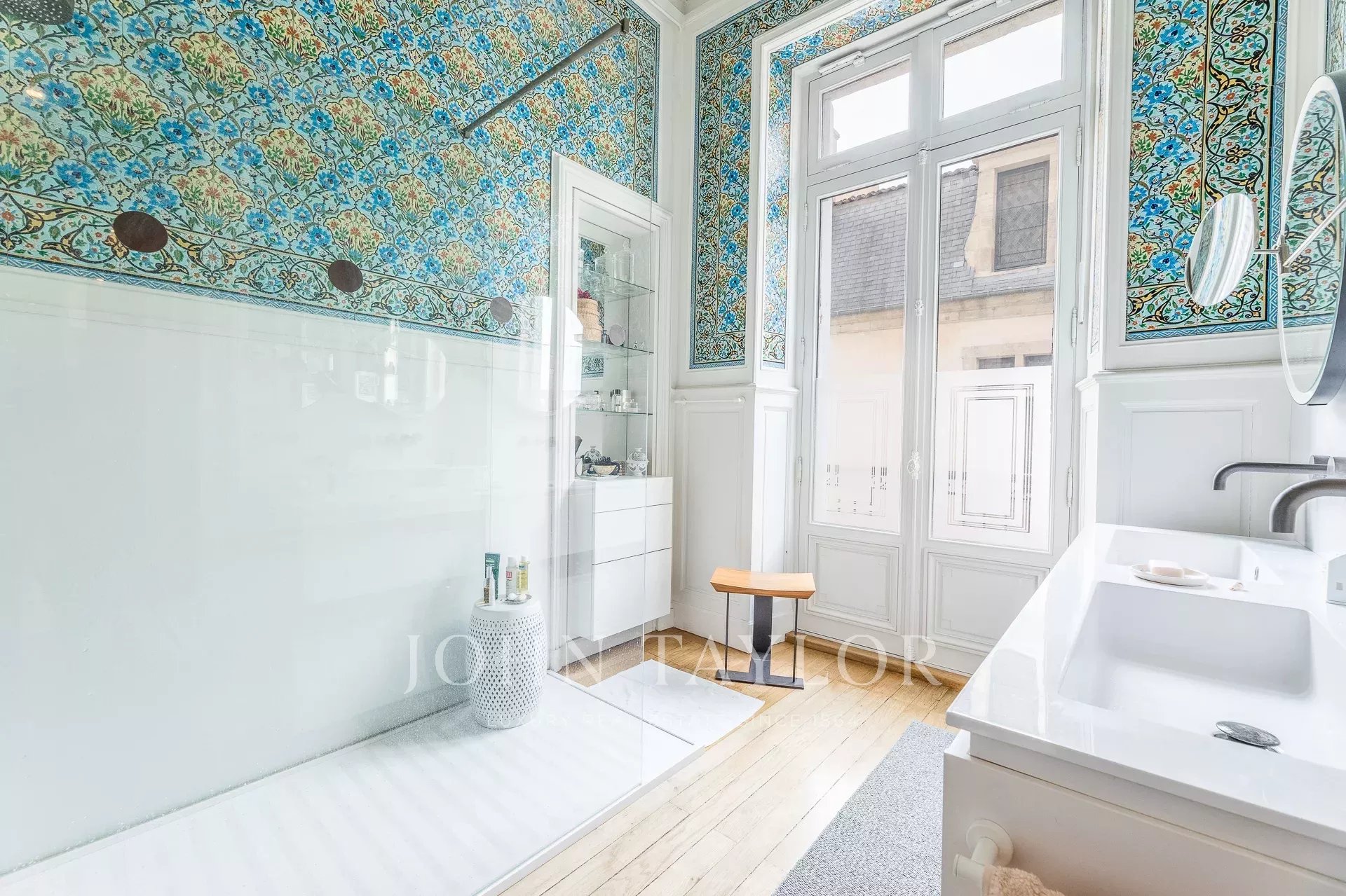 Son balcon filant offre une superbe perspective sur la Garonne, tandis que l’intérieur, baigné de lumière, révèle un patrimoine exceptionnel : boiseries, moulures, parquets d’origine, hauteurs sous plafond de 4,80 m, ainsi que des détails remarquables tels que des faïences signées Jules Vieillard et des vitraux d’Amédée de Caranza. Le tout accessible depuis un ascenseur.