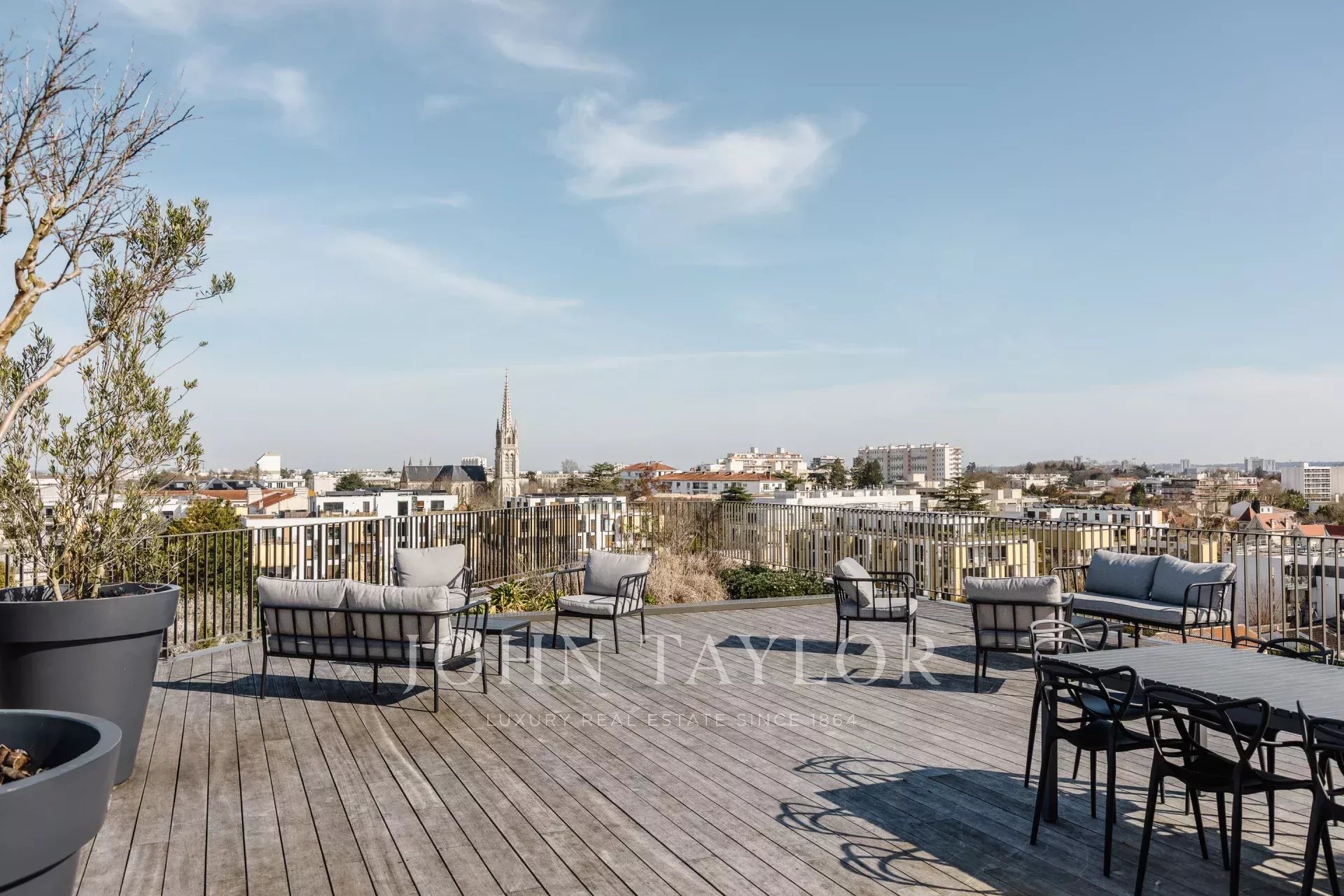 L’ascenseur privatif mène directement à un rooftop de 160 m², offrant une vue dégagée et la possibilité d’aménagements personnalisés (jacuzzi, spa…).