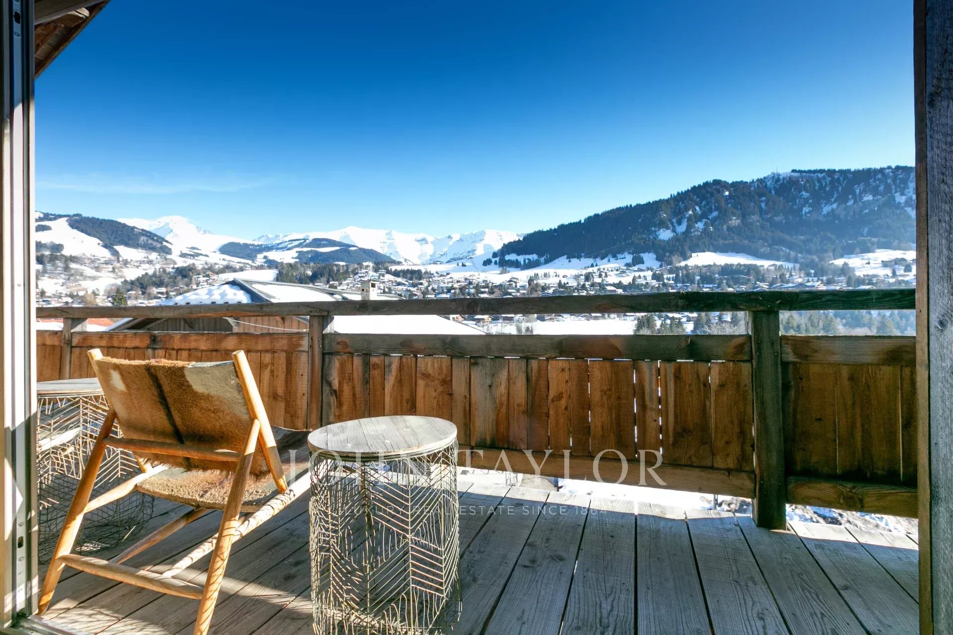 Chalet récent d'une surface habitable de 300 m2 situé dans un hameau calme à proximité à pied du centre de Megève, bénéficiant d'une vue panoramique sur le Mont-Blanc et les massifs environnants.