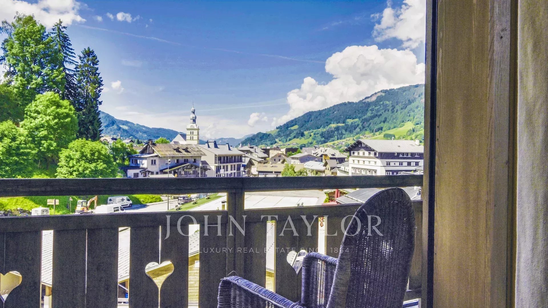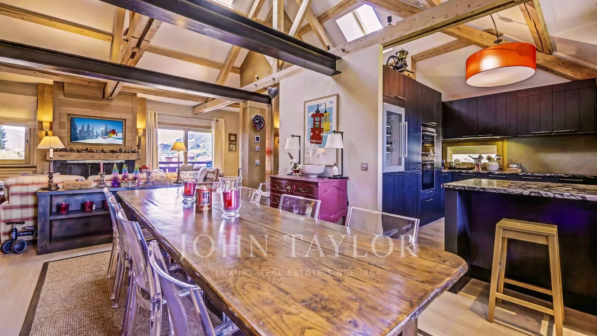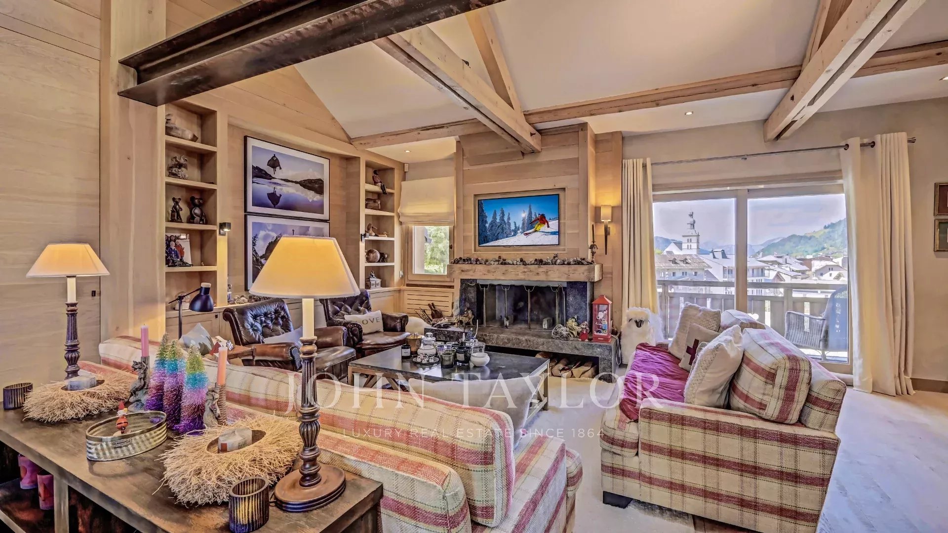 Niveau N+3: Hall avec rangements, séjour cathédrale /coin salon donnant sur balcon avec vue dominante sur le village et le clocher de Megève, cuisine aménagée et équipée ouverte sur salle à manger et WC invités.