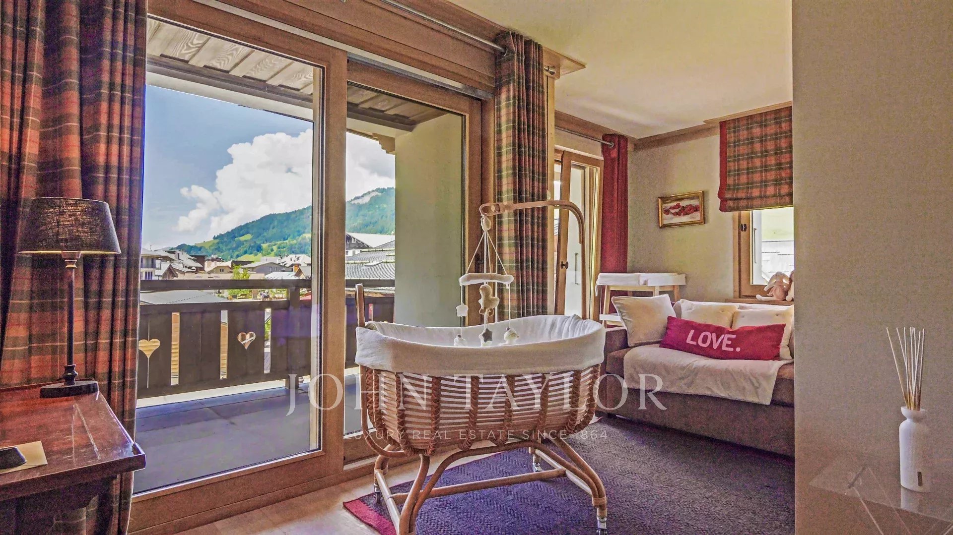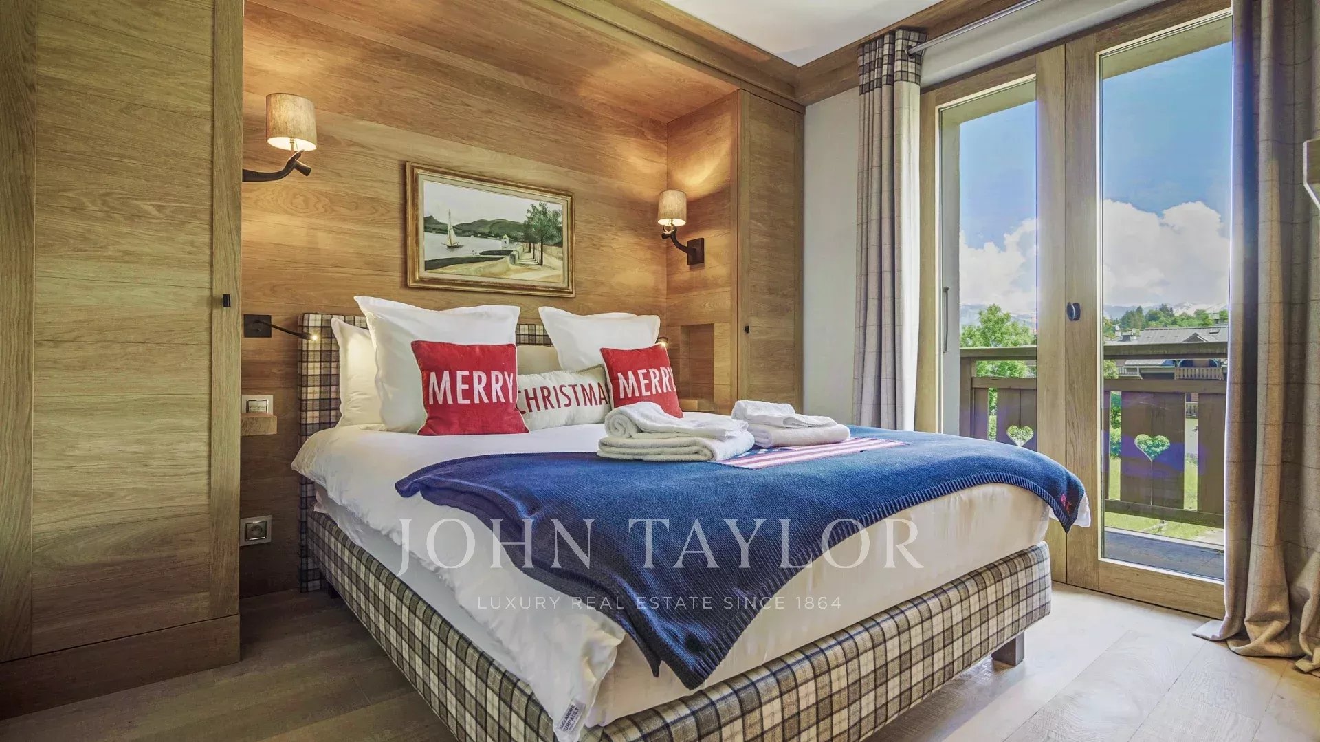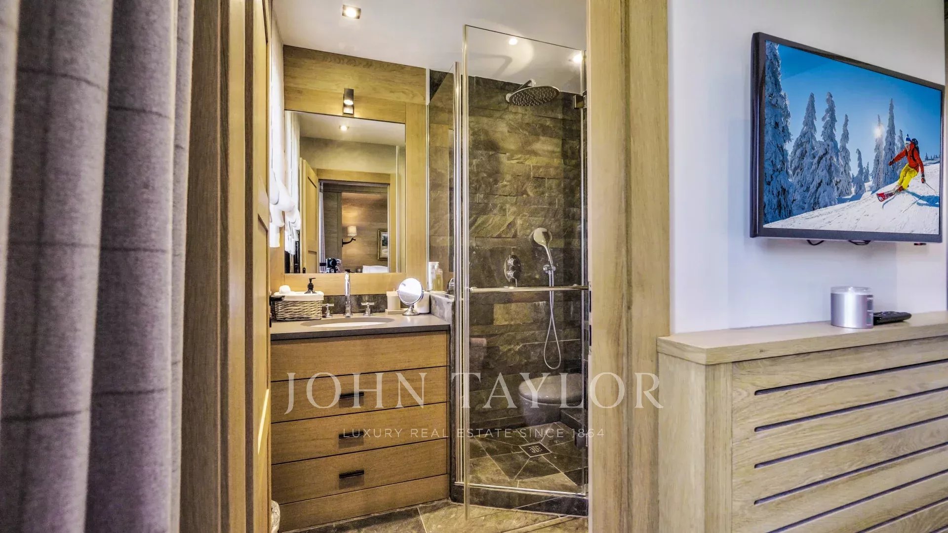 Niveau N+3: Hall avec rangements, séjour cathédrale /coin salon donnant sur balcon avec vue dominante sur le village et le clocher de Megève, cuisine aménagée et équipée ouverte sur salle à manger et WC invités.