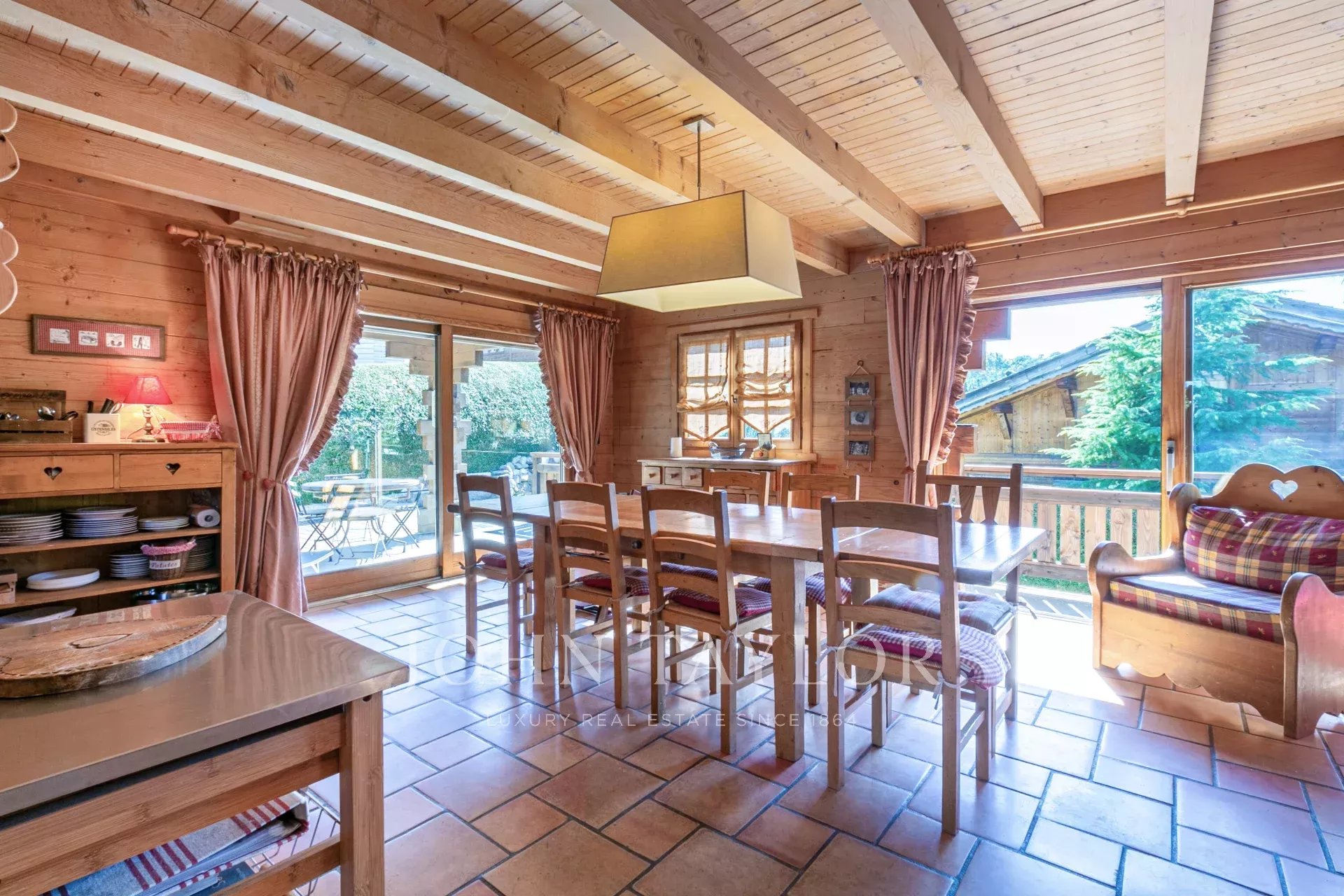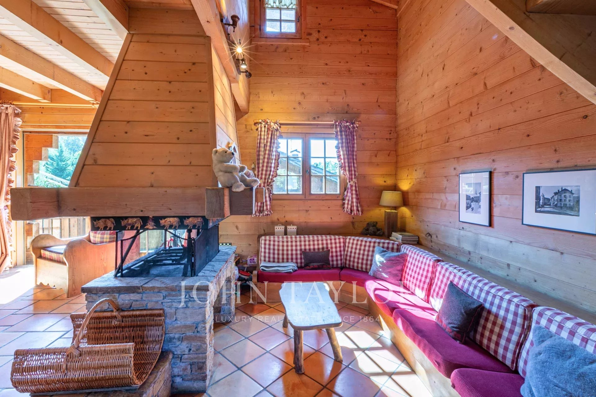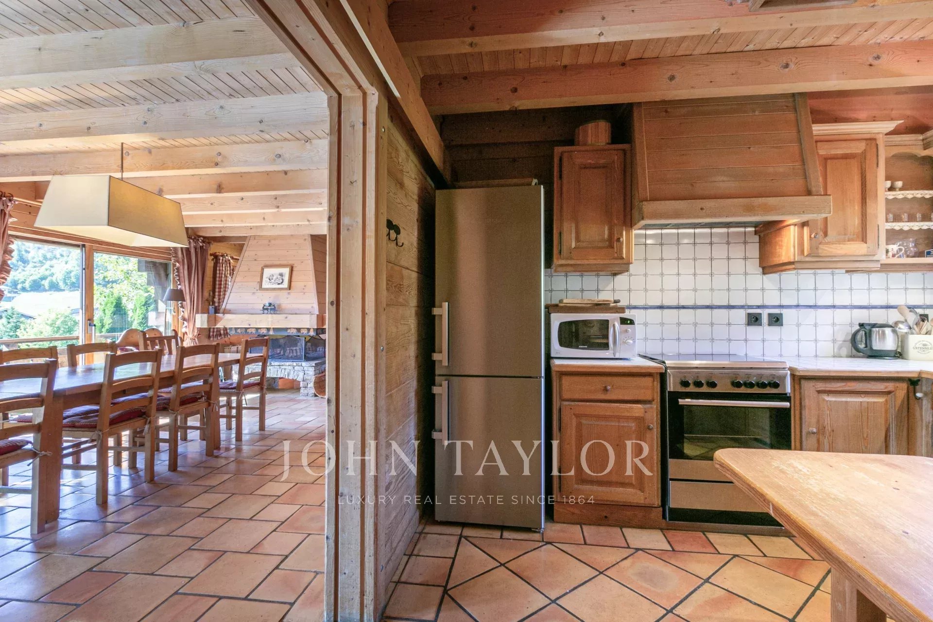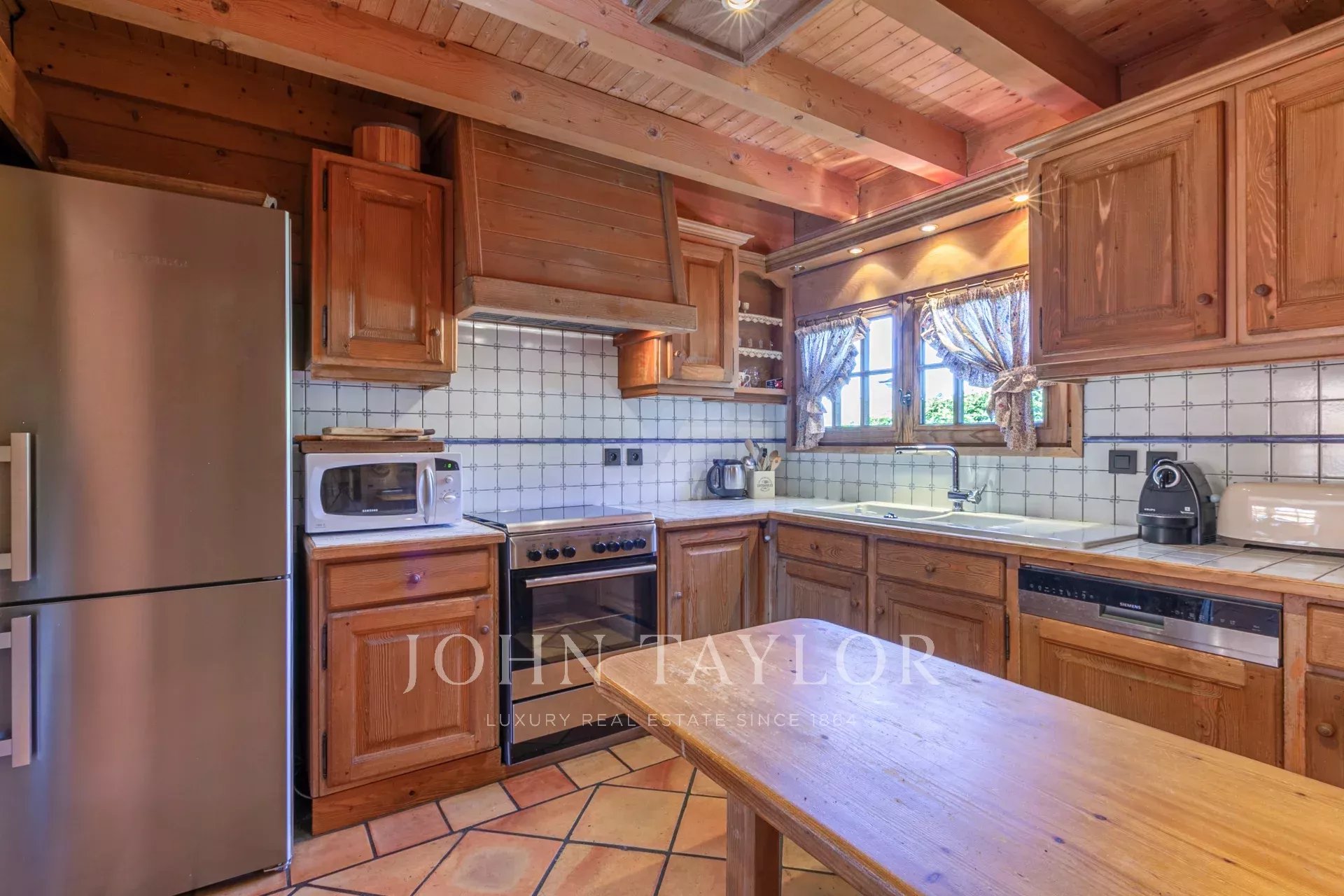 Hall d'entrée, double salon avec cheminée centrale, cuisine aménagée et équipée donnant sur salle à manger avec accès sur une grande terrasse et jardin, 5 chambres dont 2 en suite. Un garage (1 place) avec grand ski-room.