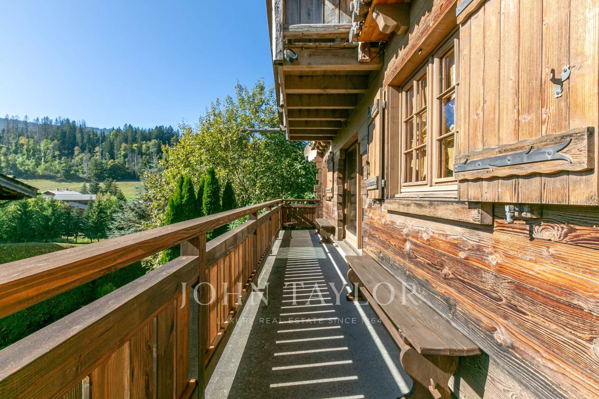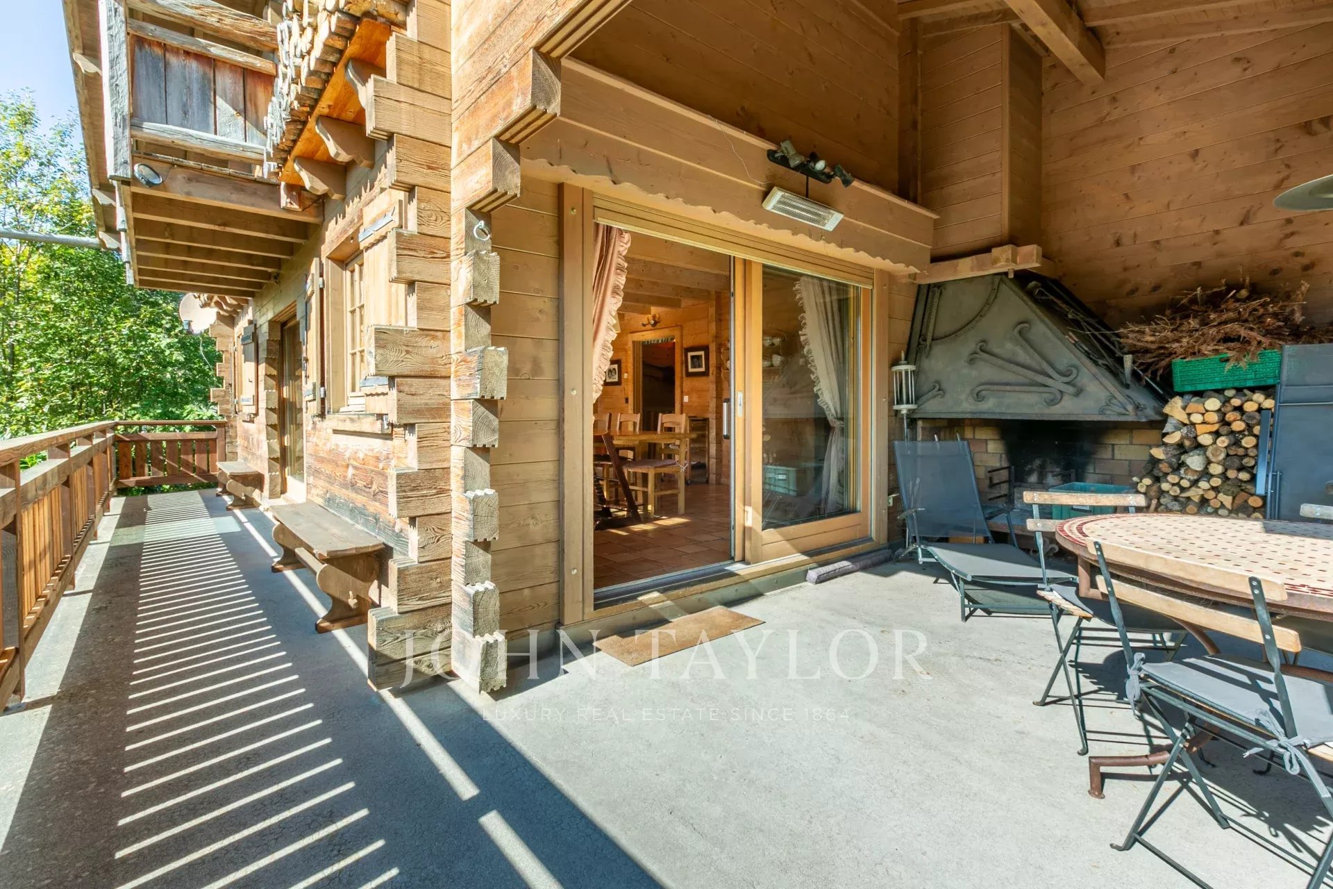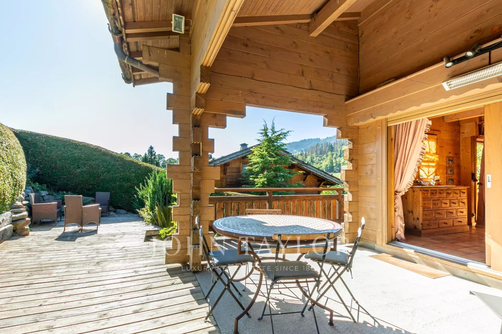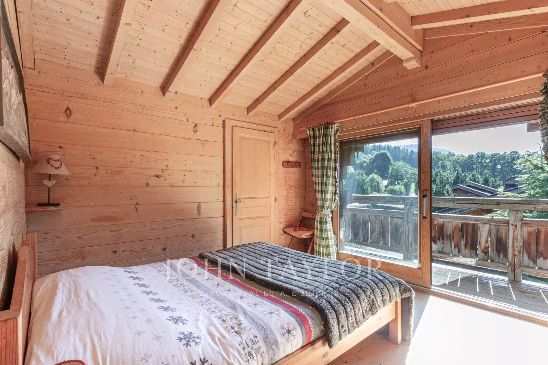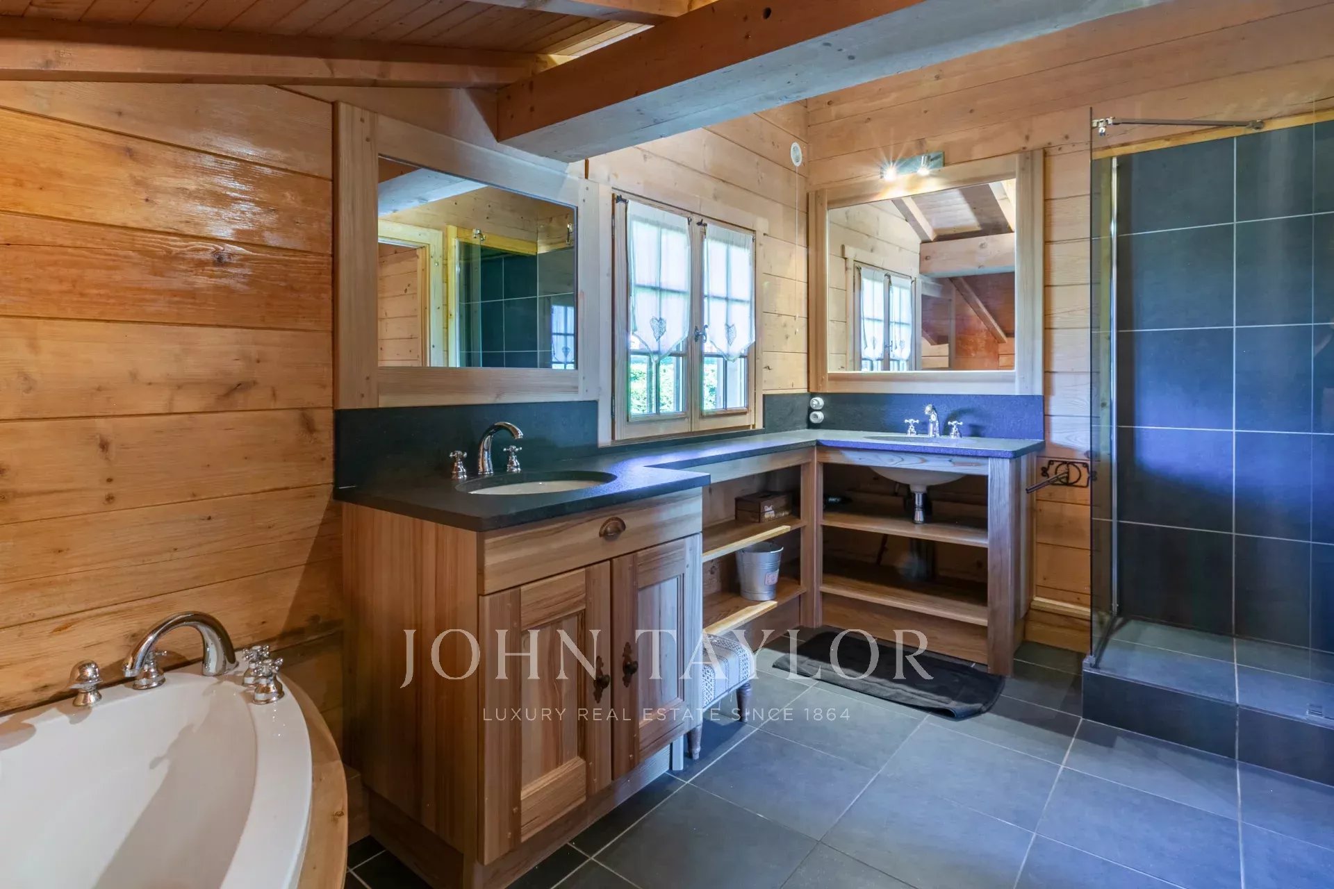 Hall d'entrée, double salon avec cheminée centrale, cuisine aménagée et équipée donnant sur salle à manger avec accès sur une grande terrasse et jardin, 5 chambres dont 2 en suite. Un garage (1 place) avec grand ski-room.
