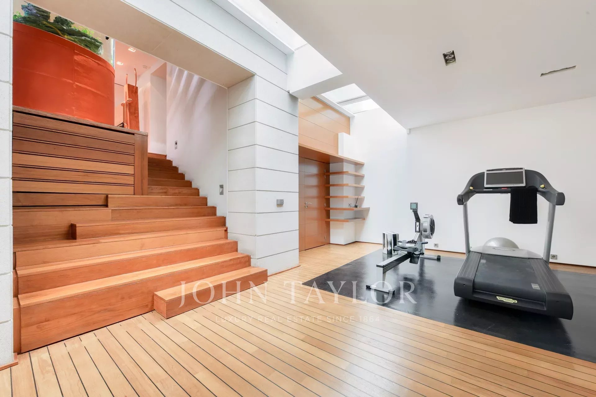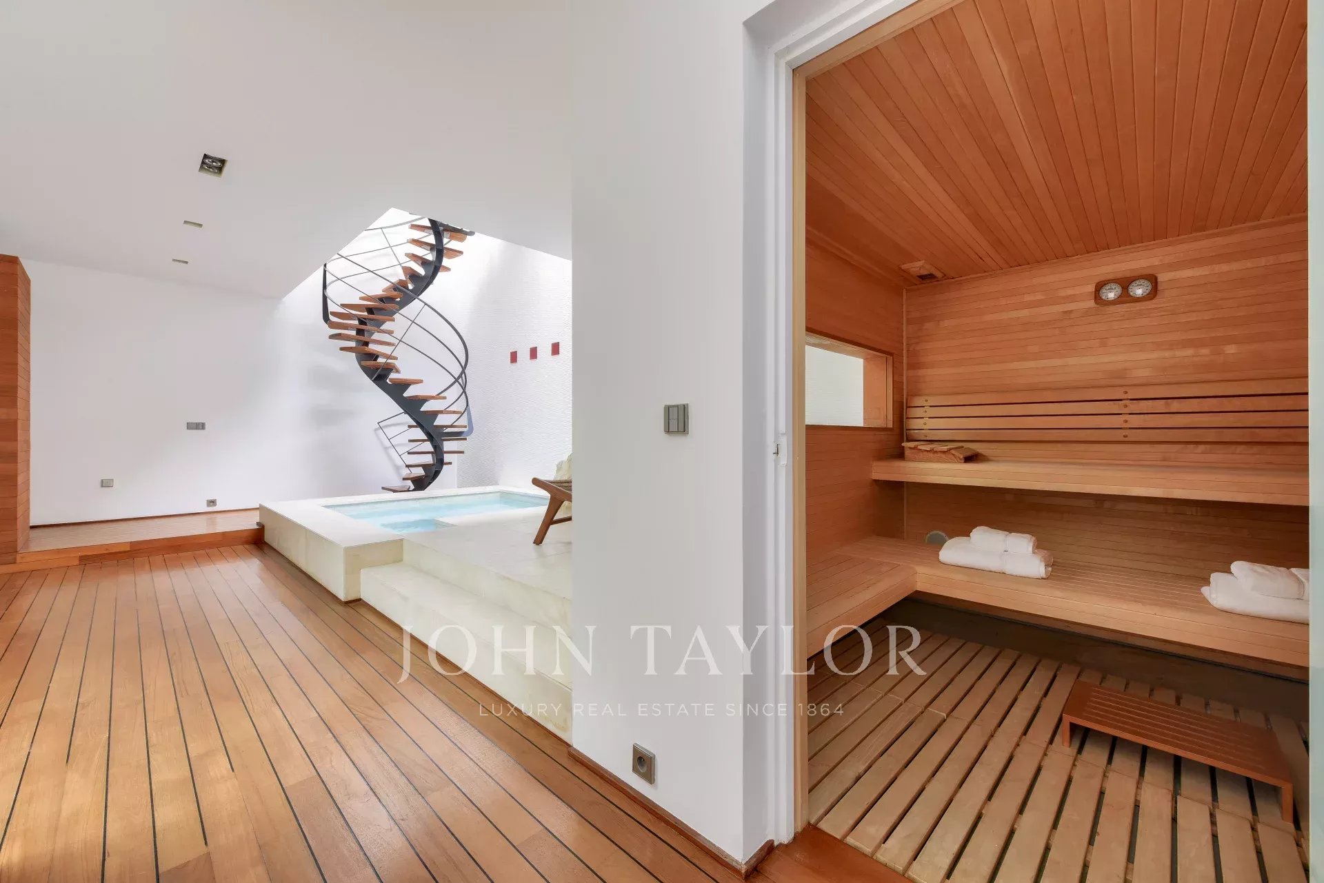 Le rez-de-jardin inférieur abrite un espace bien-être complet : jacuzzi, salle de sport, sauna, hammam ou salle de massage aménageable, et grande douche.