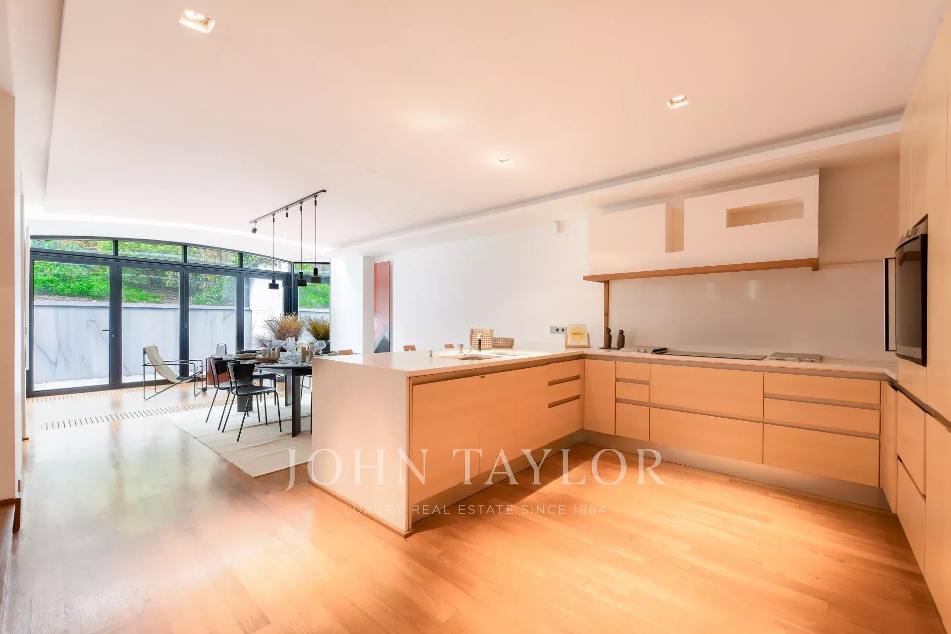 Le rez-de-jardin accueille une vaste cuisine dînatoire avec espace repas donnant sur le jacuzzi, ouvrant sur la terrasse et le jardin, ainsi qu’un office et des toilettes invités.