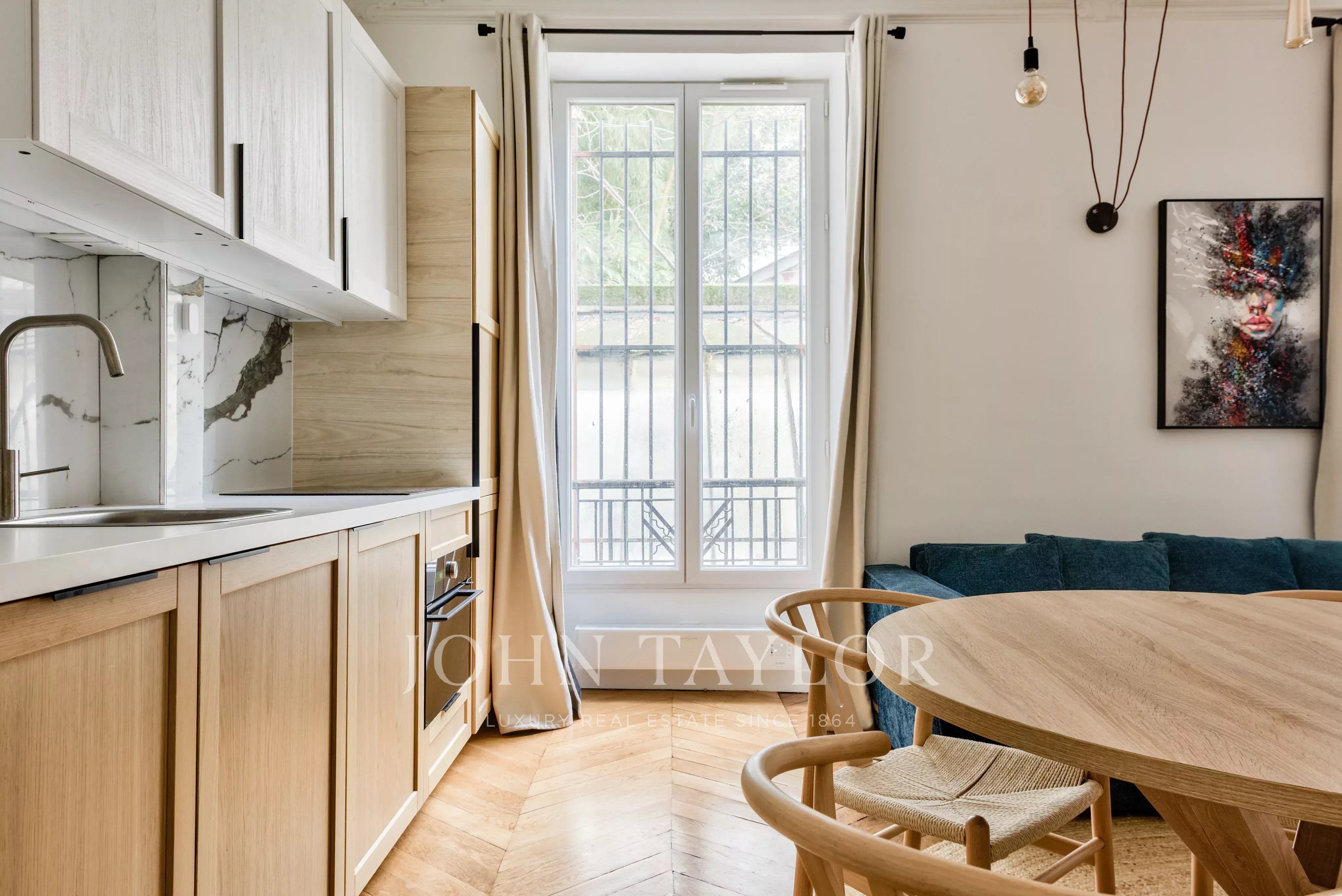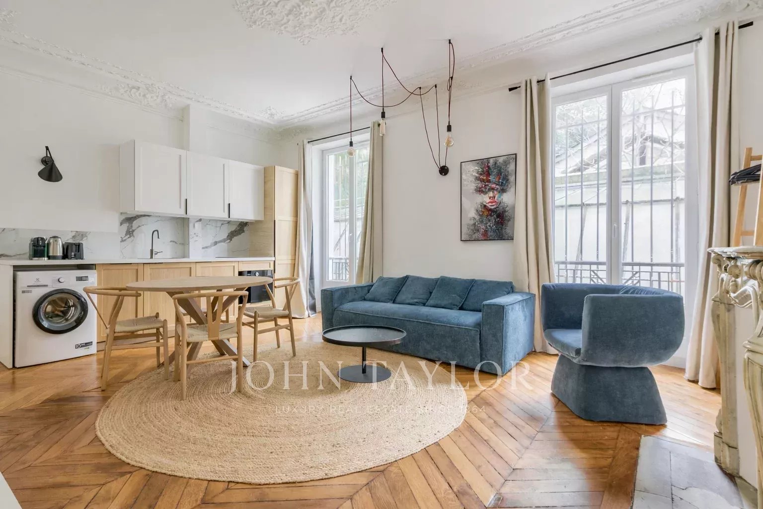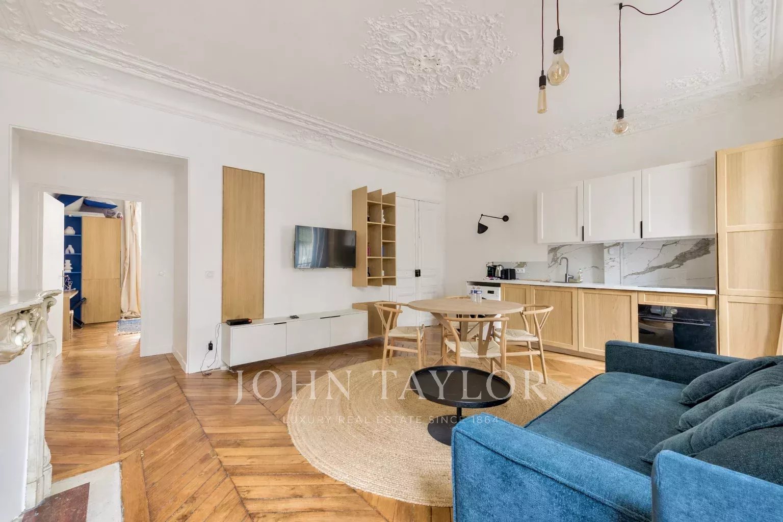 Un séjour avec cuisine ouverte aménagée et équipée
