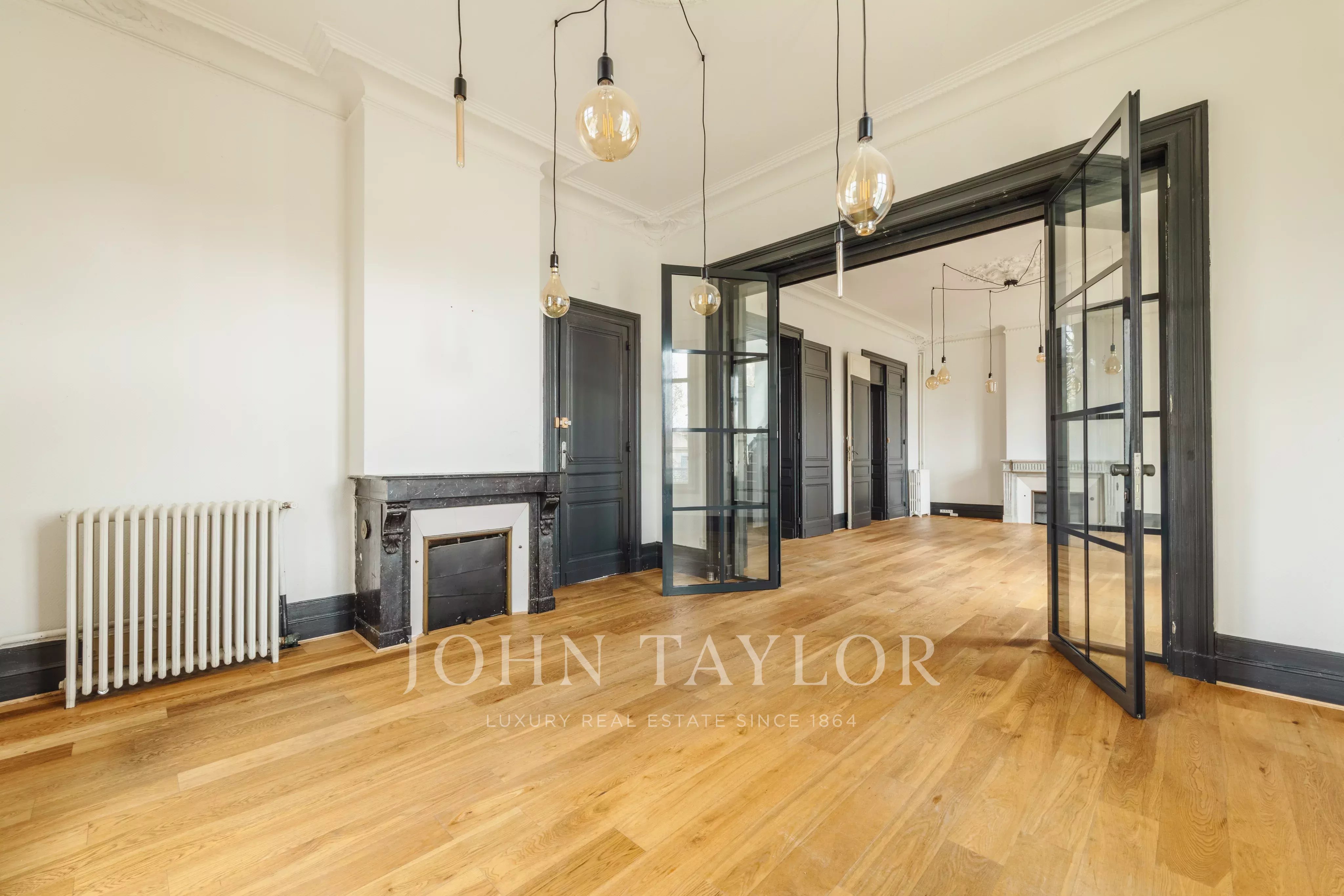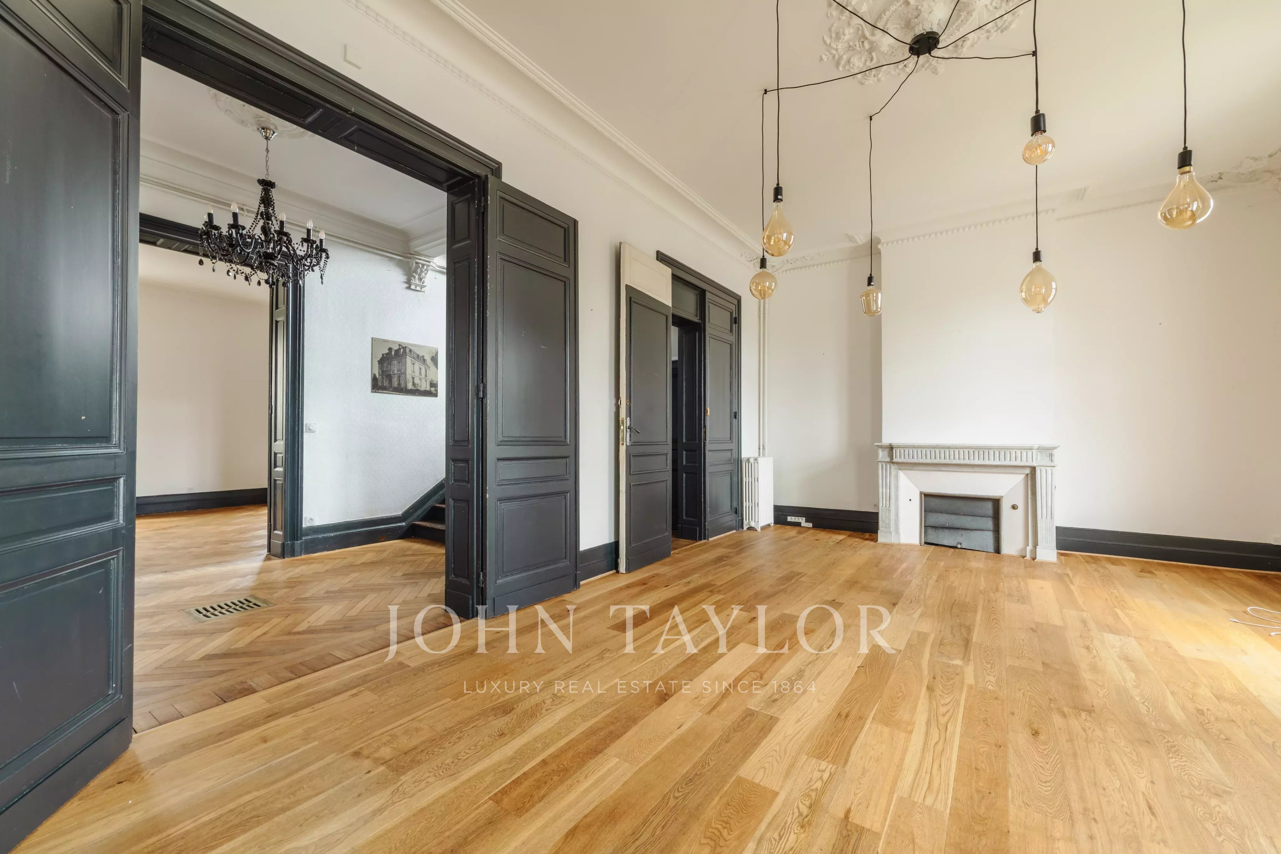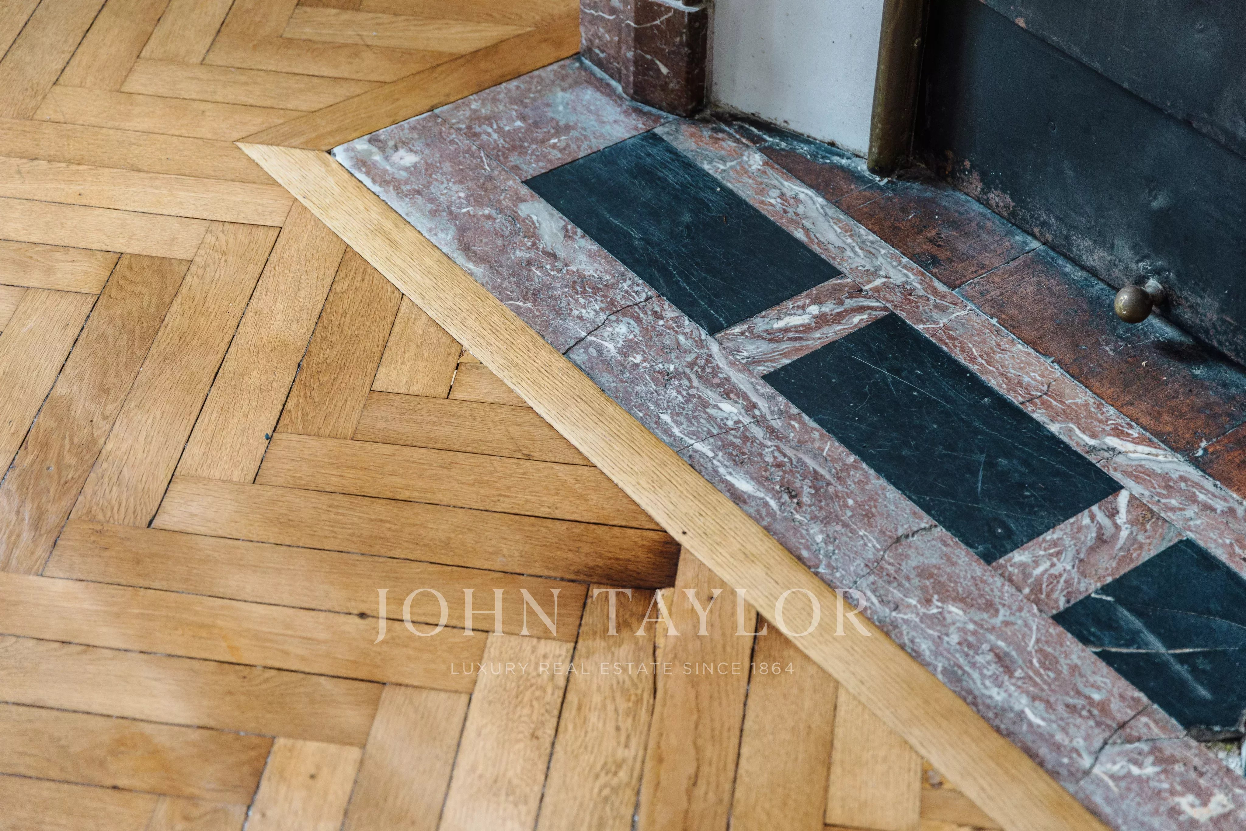 Les volumes intérieurs séduisent par leurs belles hauteurs sous plafond, leurs moulures, parquets anciens rénovés et cheminées d’époque, conférant à l’ensemble un cachet rare et une atmosphère élégante.