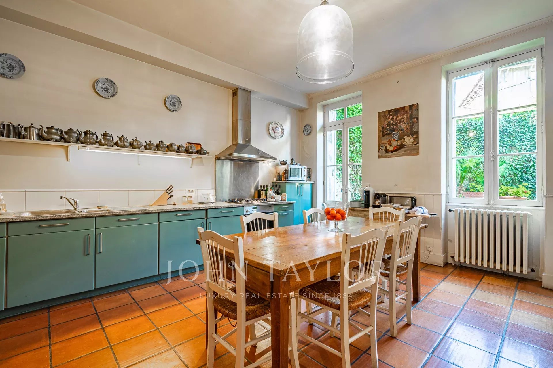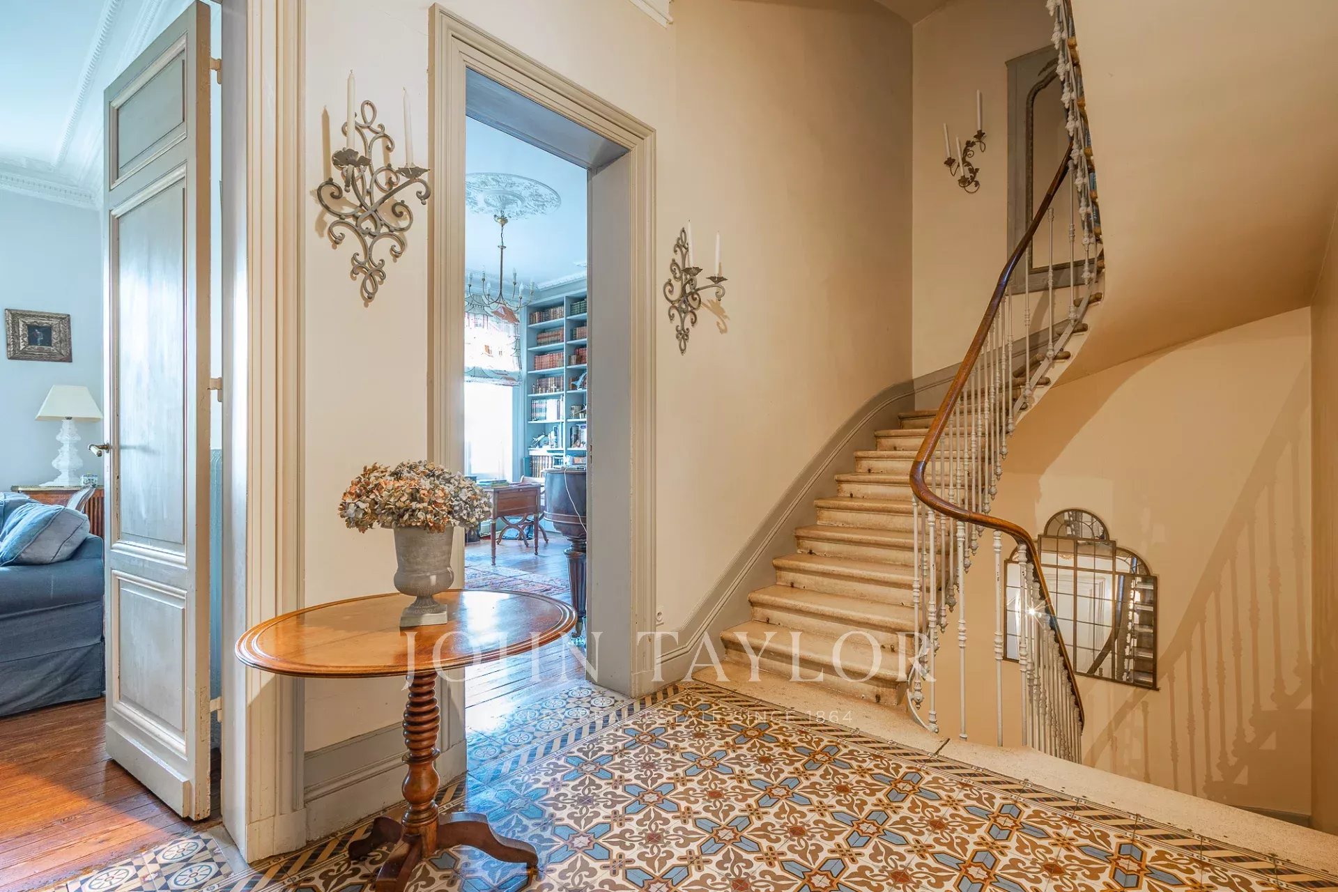 Cette demeure de 400 m², avec ses hauts plafonds, cheminées en marbre, parquet d'origine, moulures et boiseries, conserve tout le charme de l'architecture ancienne.